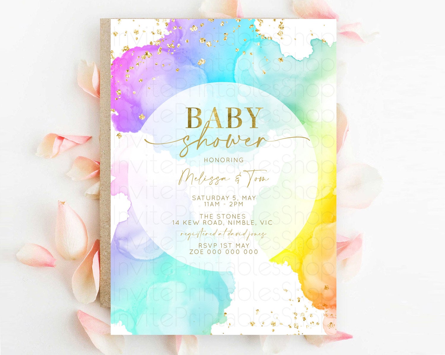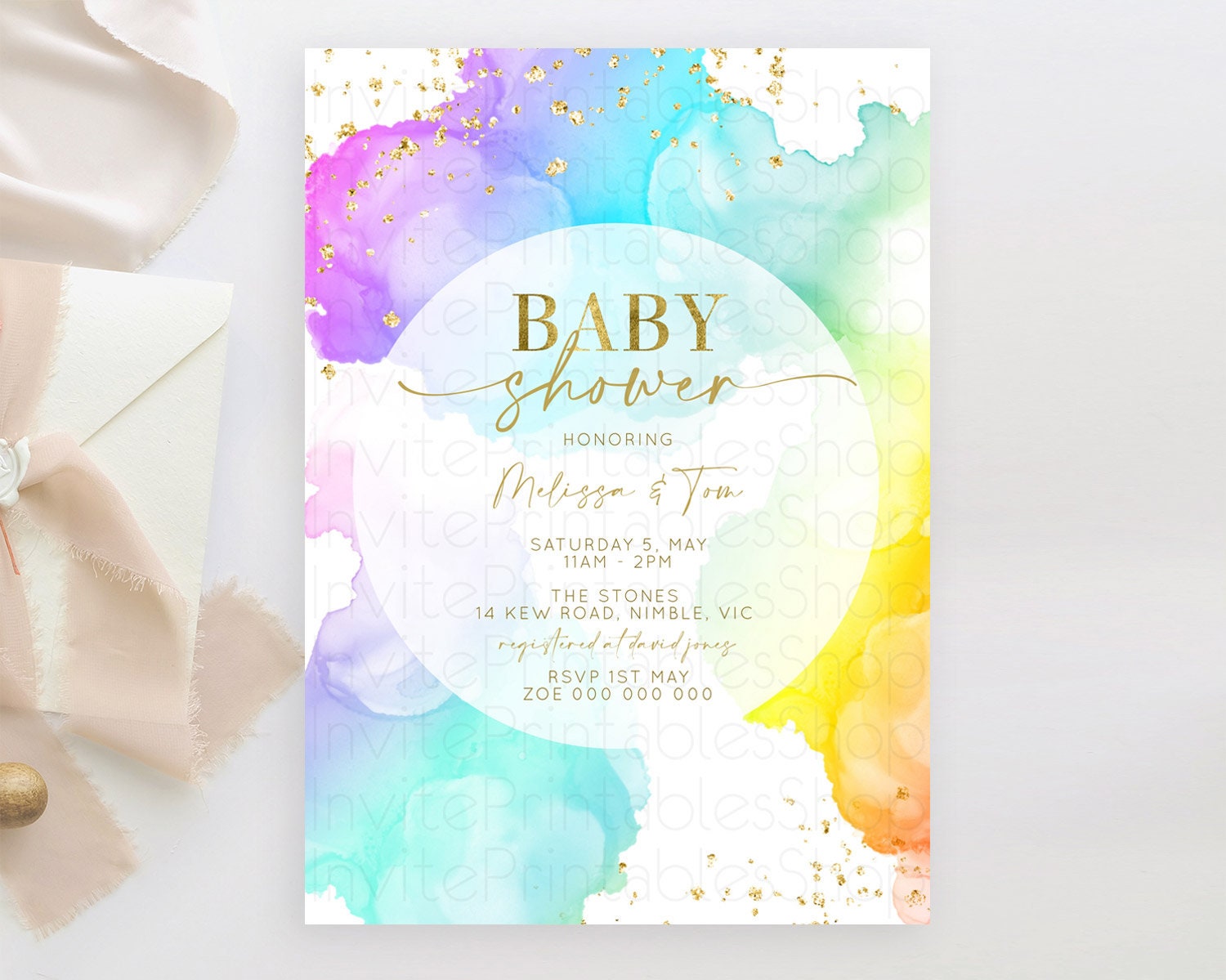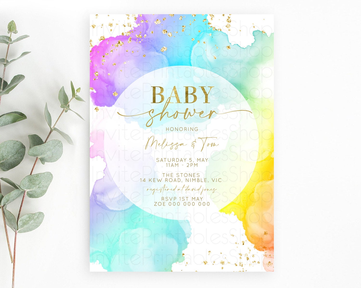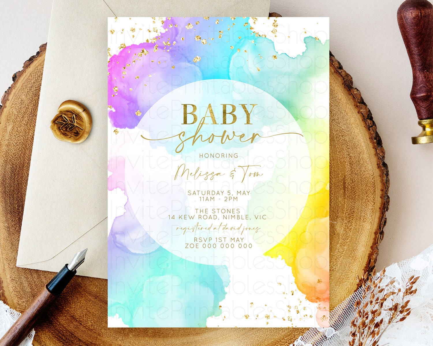Pastel Baby Shower Invitation Rainbow Baby Shower Invitation Colorful Pastel Watercolor Invitation Gold Glitter Sprinkles Ombre D10213