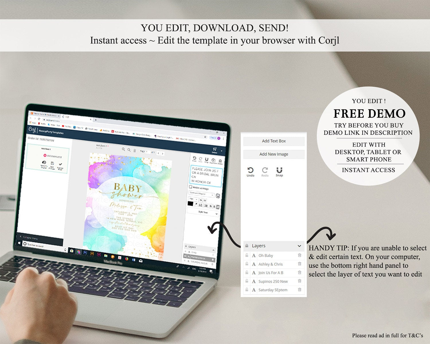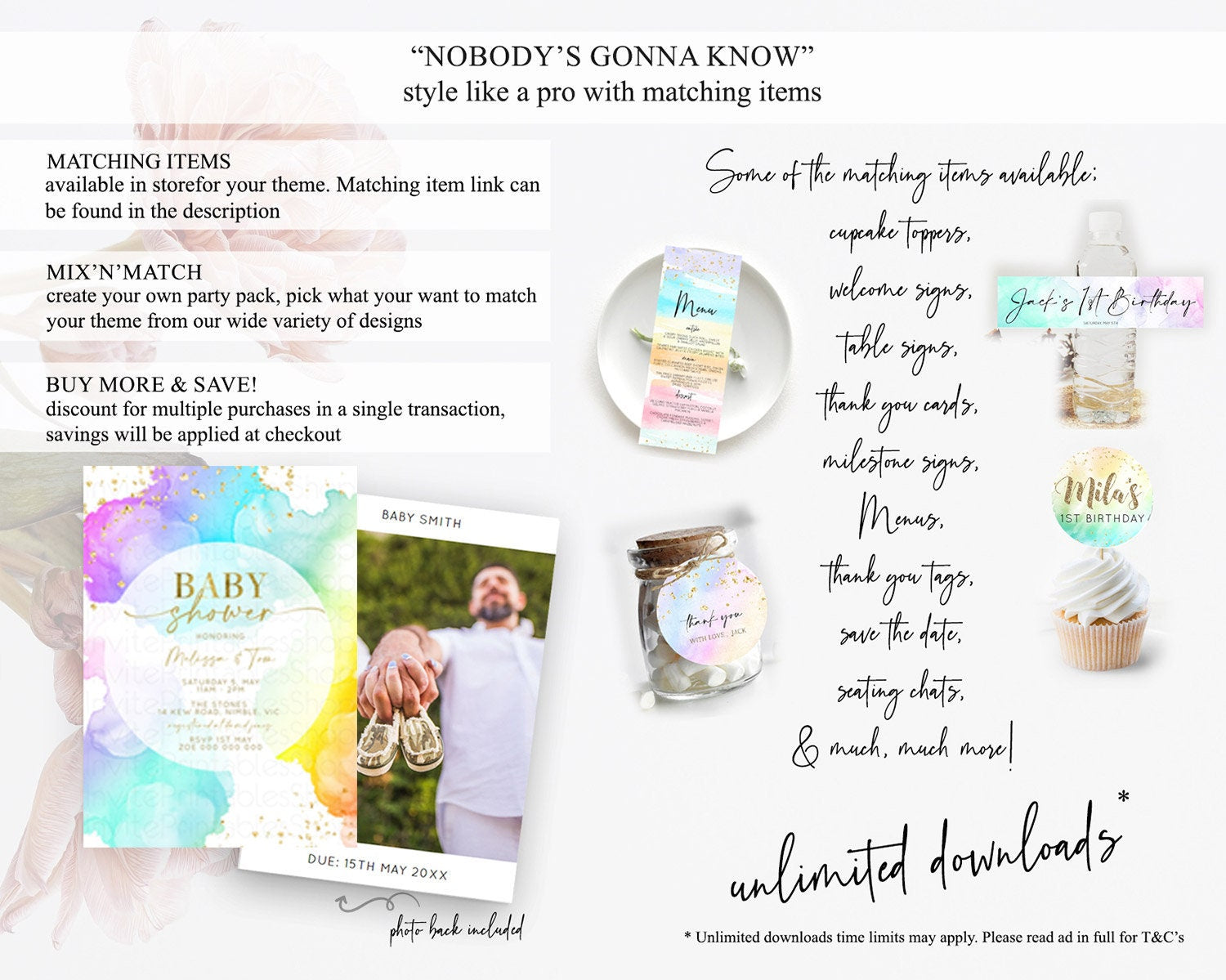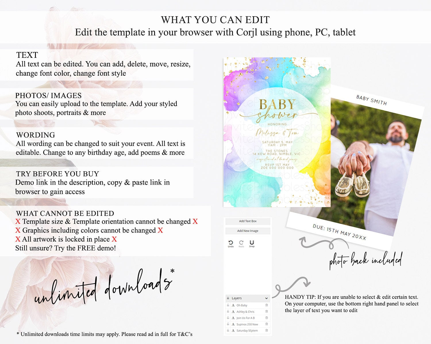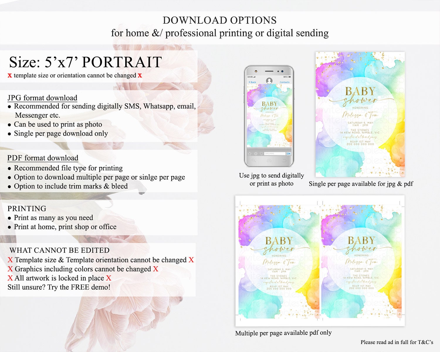Pastel Baby Shower Invitation Rainbow Baby Shower Invitation Colorful Pastel Watercolor Invitation Gold Glitter Sprinkles Ombre D10213