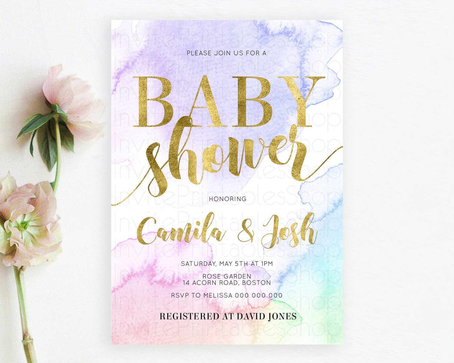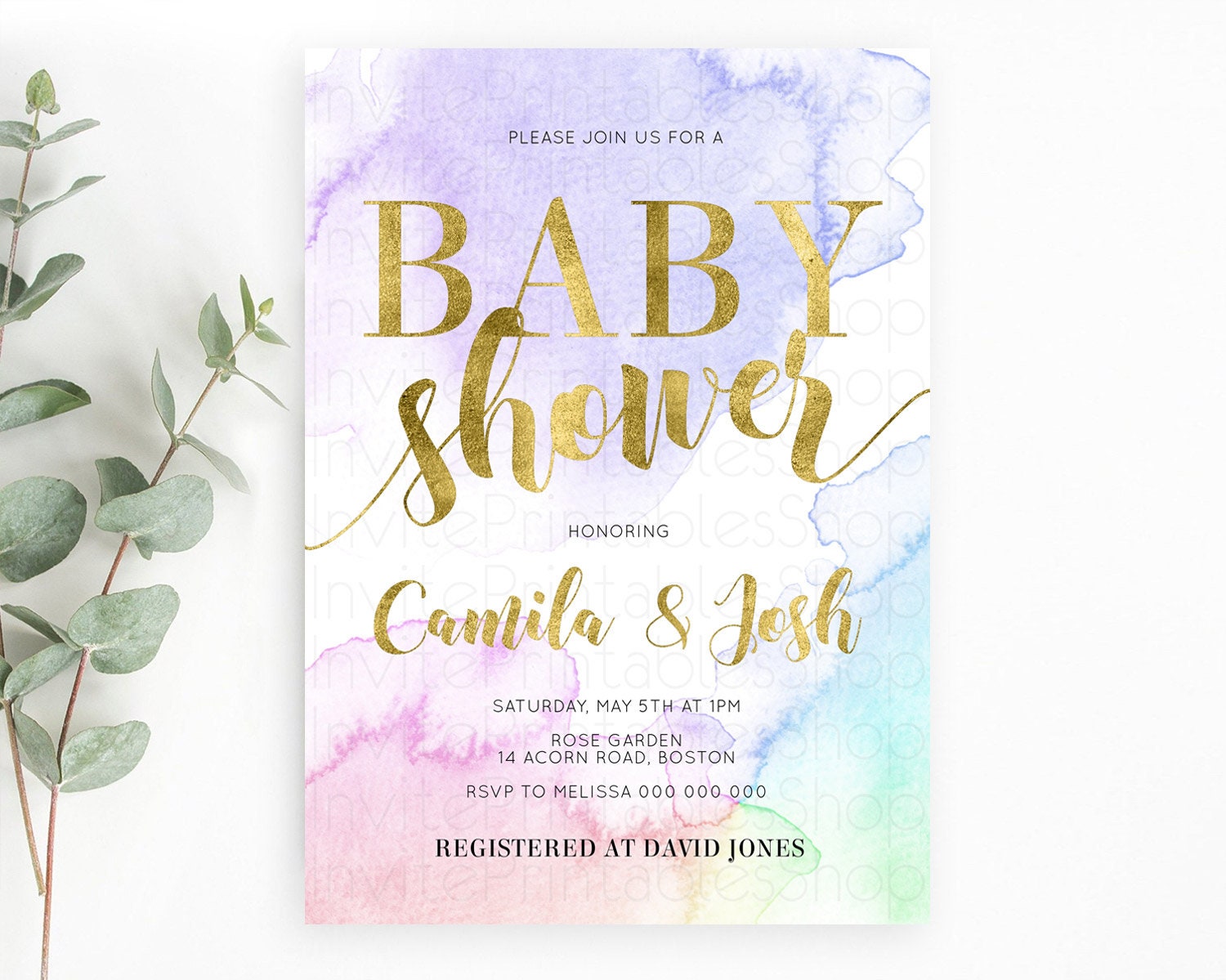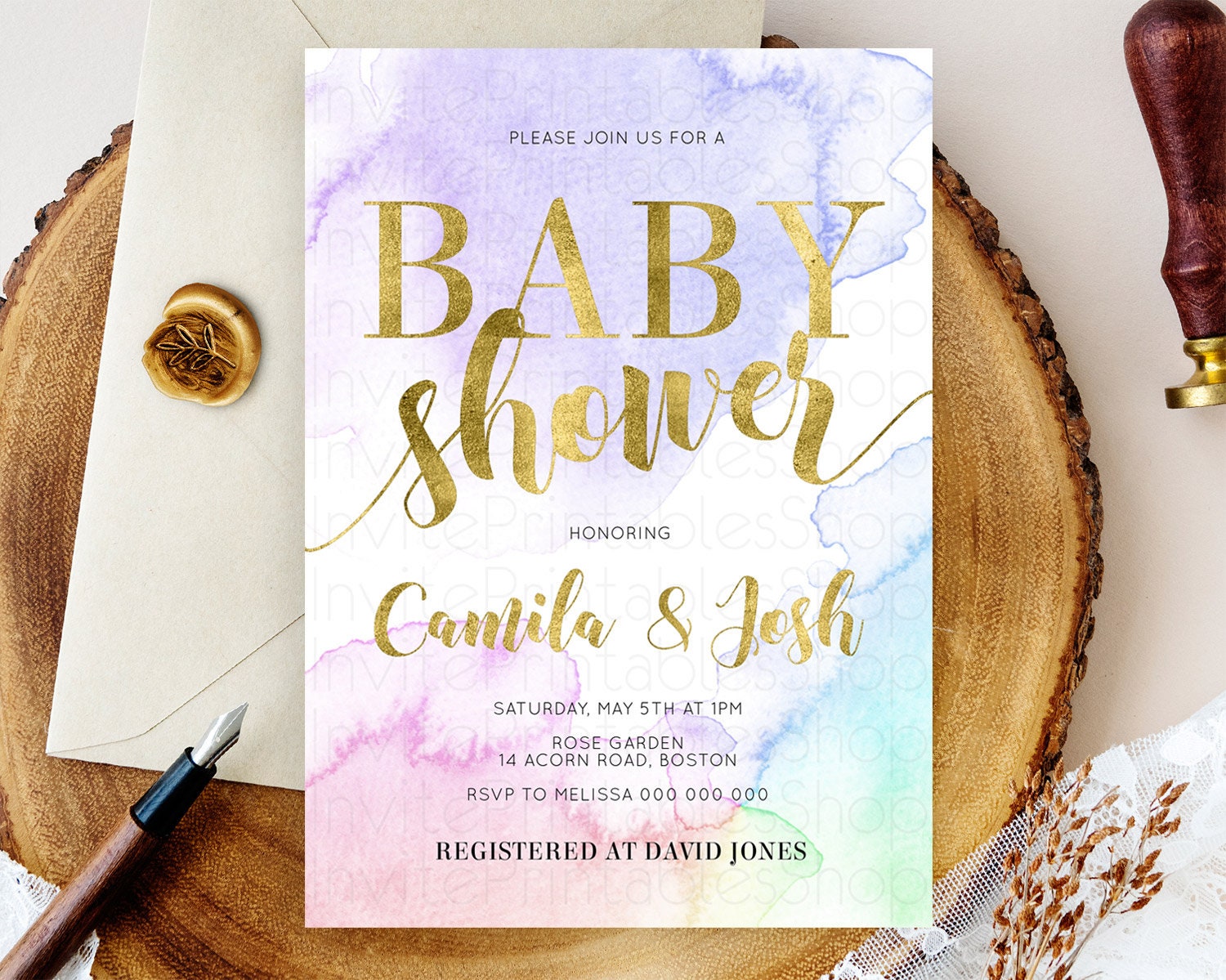 Pastel Baby Shower Invitation Rainbow Baby Shower Invitation Colorful Pastel Watercolor Invitation Gold Glitter Sprinkles Ombre D10216