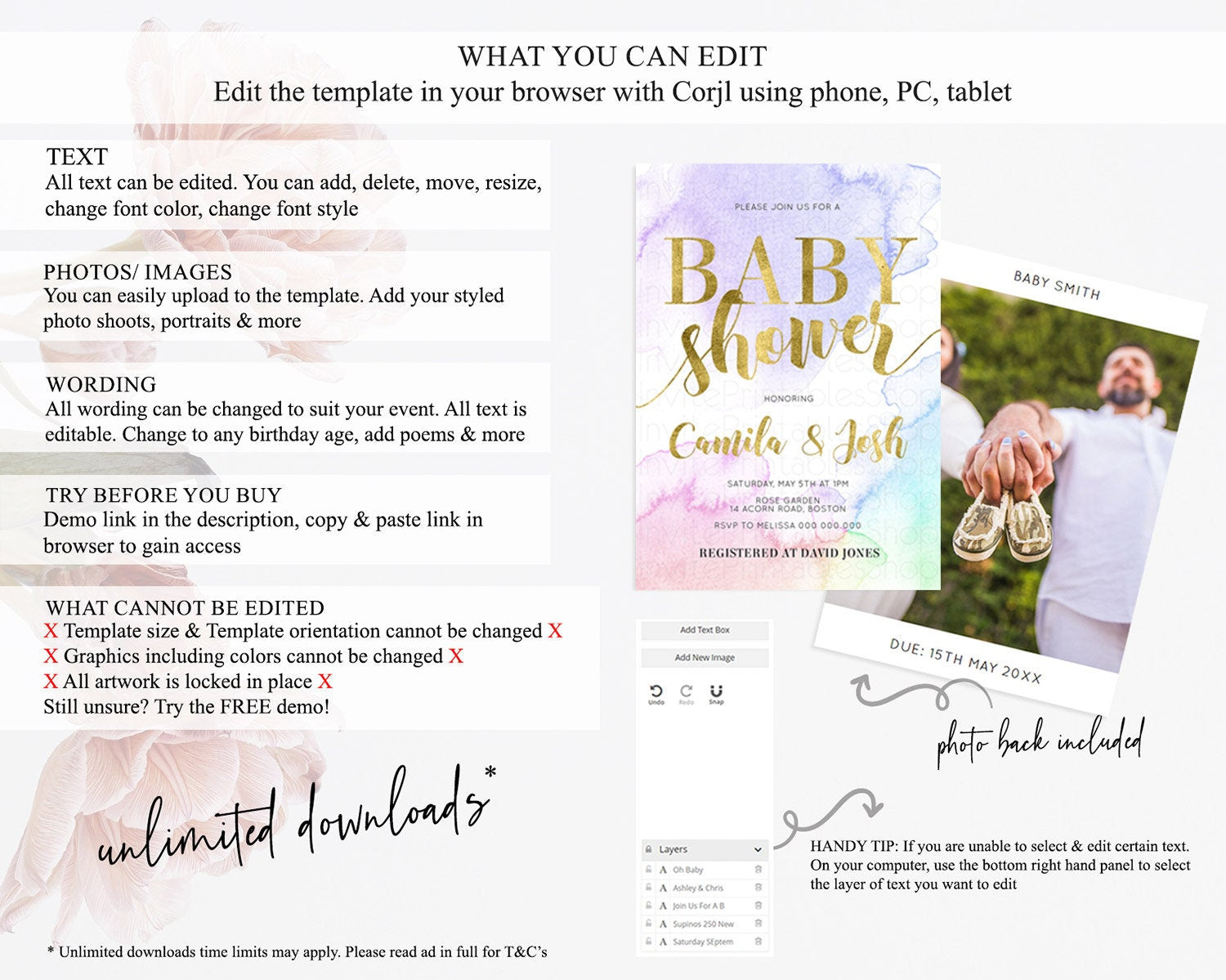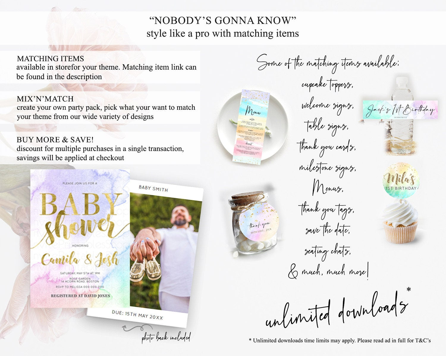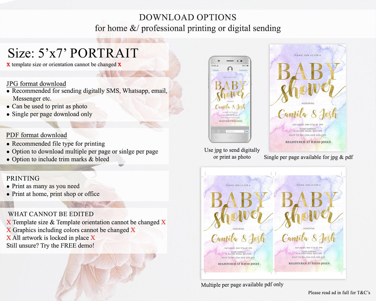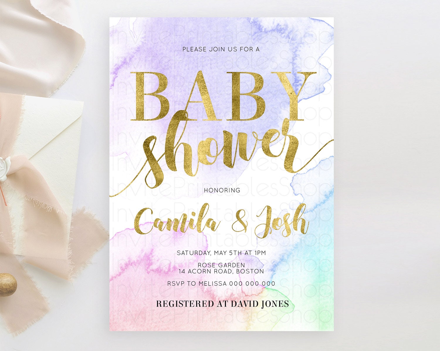 Pastel Baby Shower Invitation Rainbow Baby Shower Invitation Colorful Pastel Watercolor Invitation Gold Glitter Sprinkles Ombre D10216