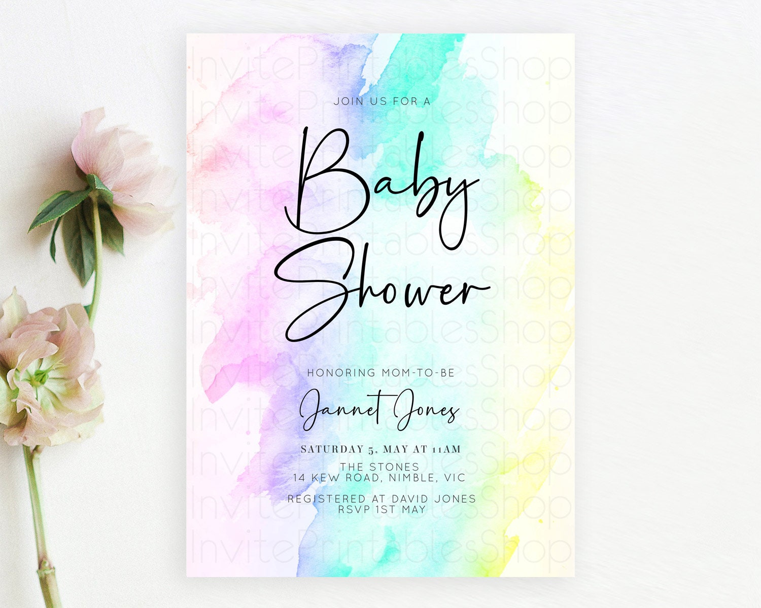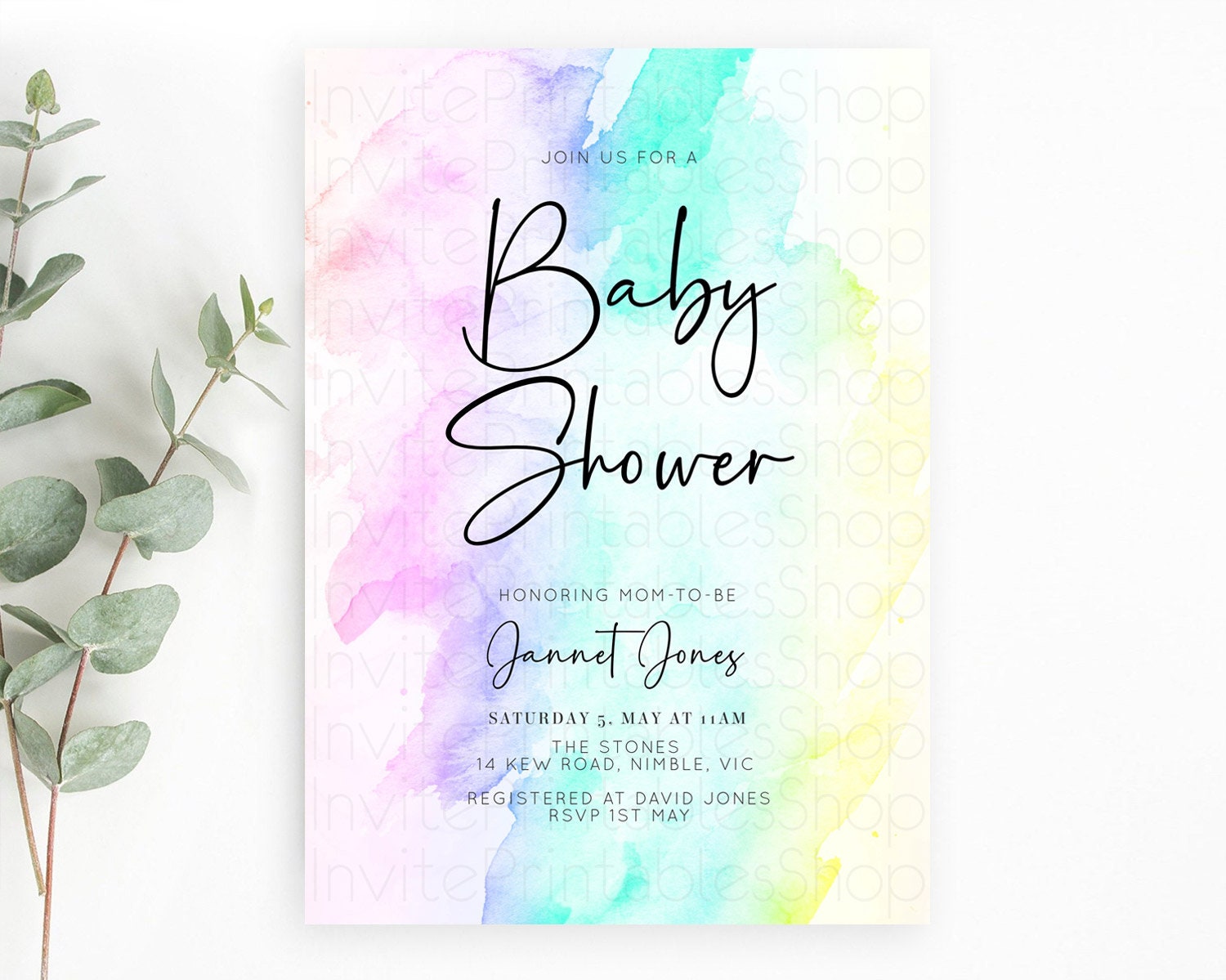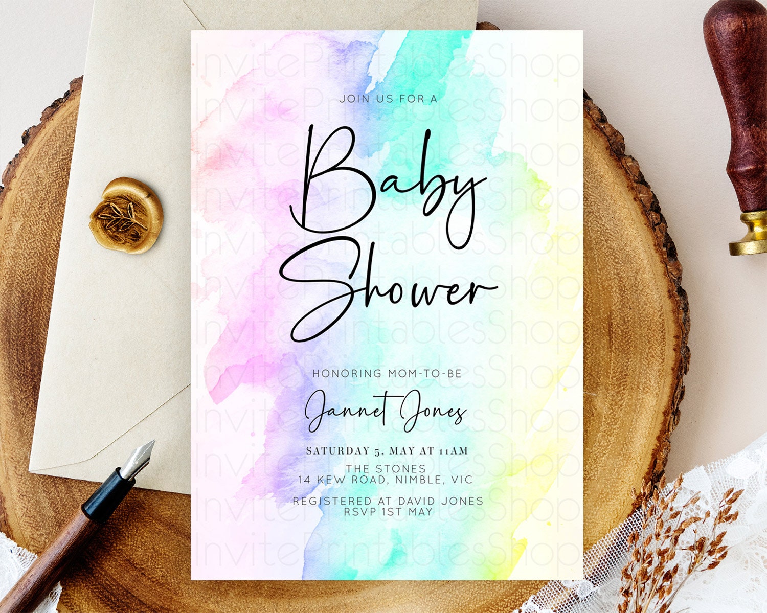 Pastel Baby Shower Invitation Rainbow Baby Shower Invitation Colorful Pastel Watercolor Invitation Gold Glitter Sprinkles Ombre D10231