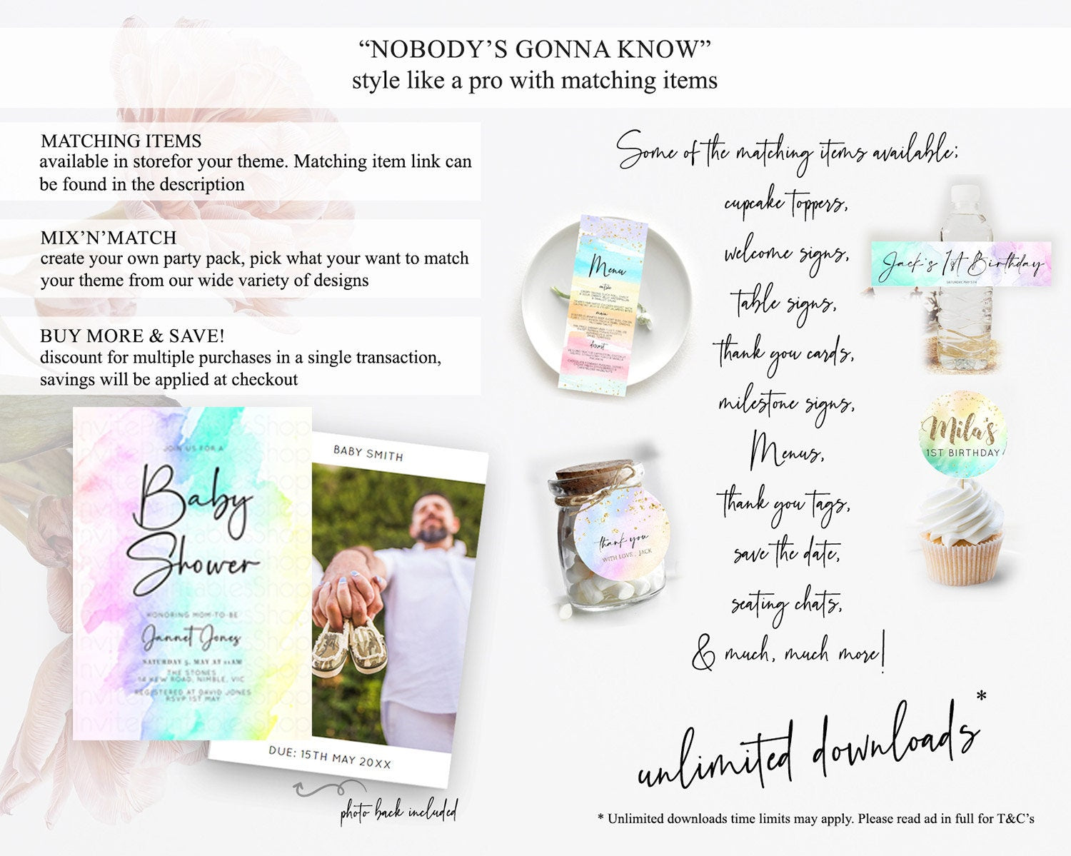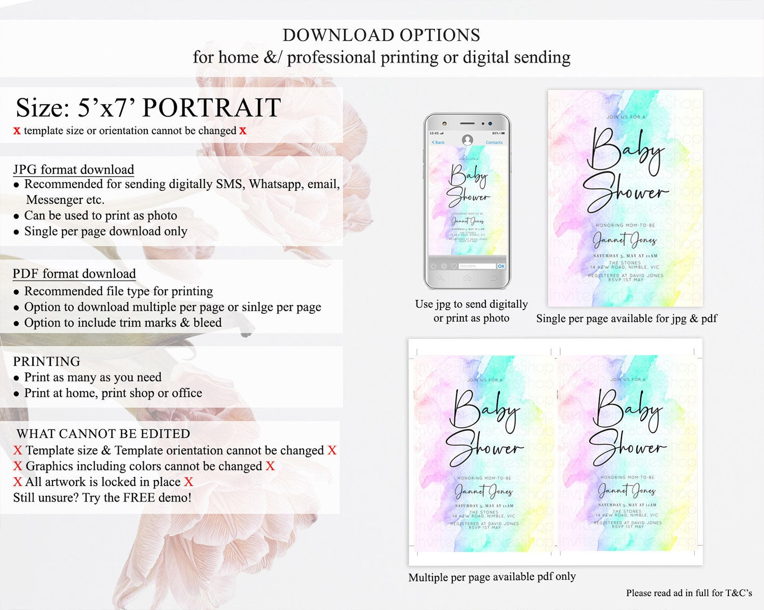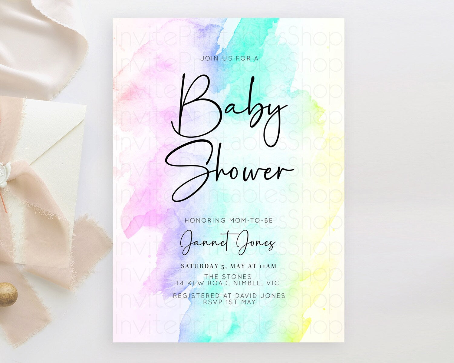 Pastel Baby Shower Invitation Rainbow Baby Shower Invitation Colorful Pastel Watercolor Invitation Gold Glitter Sprinkles Ombre D10231