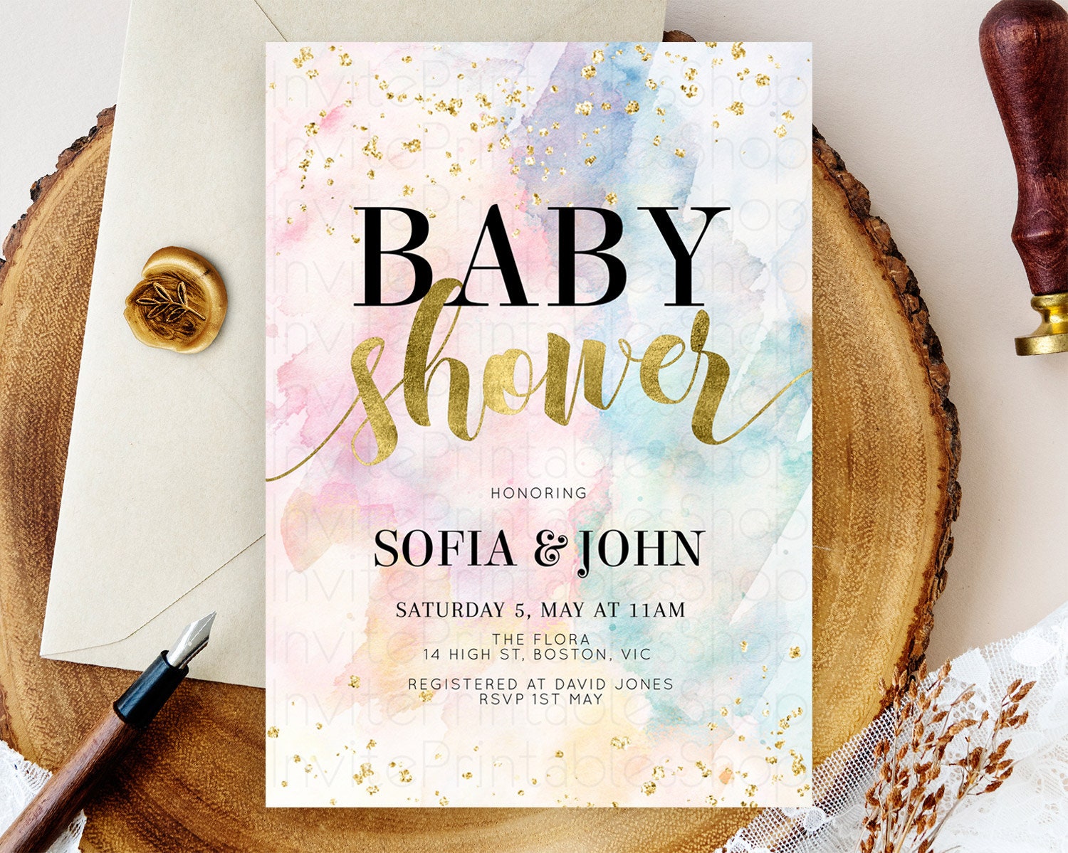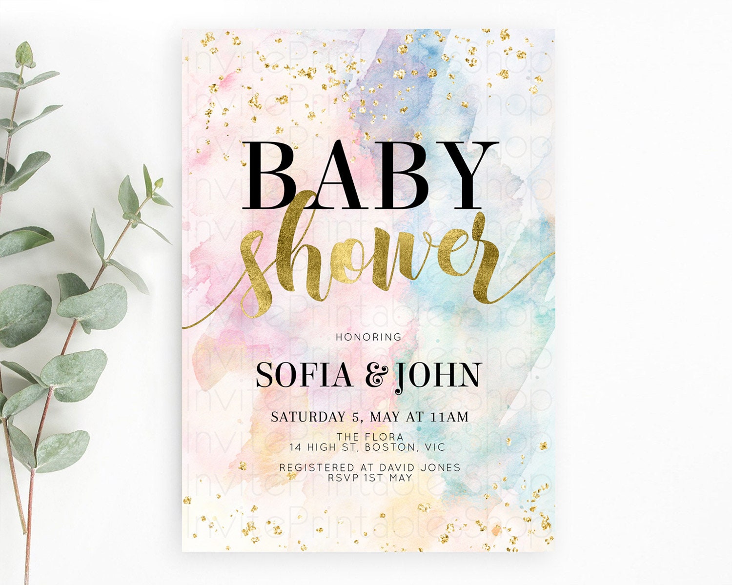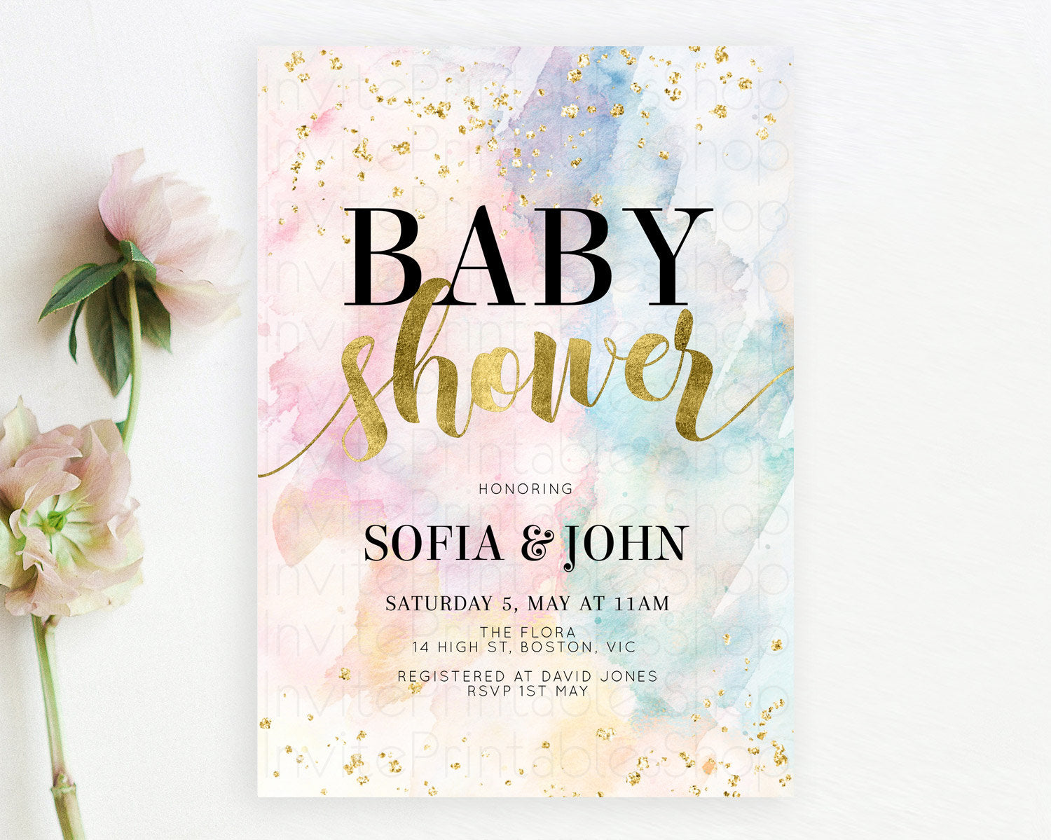 Pastel Baby Shower Invitation Rainbow Baby Shower Invitation Colorful Pastel Watercolor Invitation Gold Glitter Sprinkles Ombre D10265