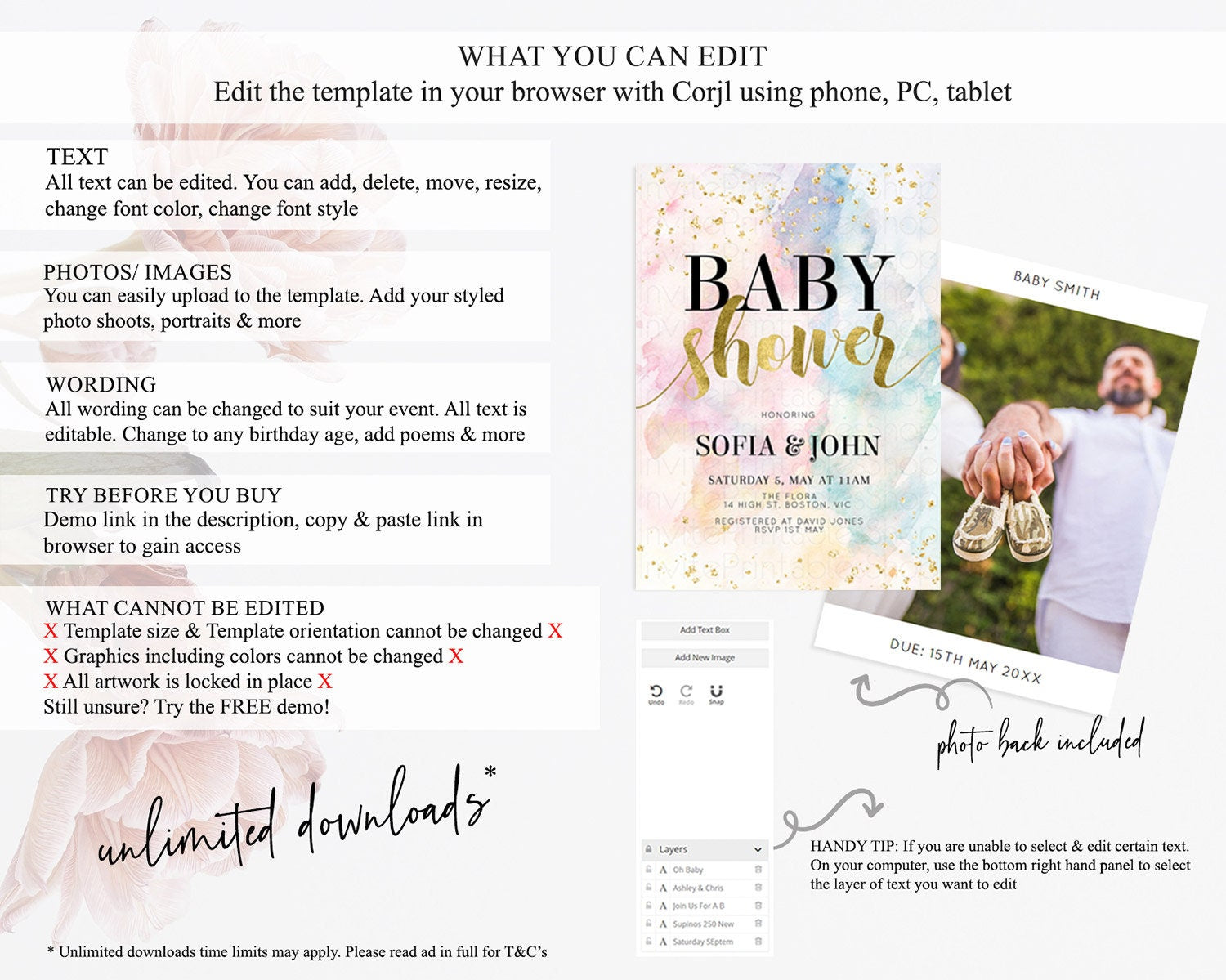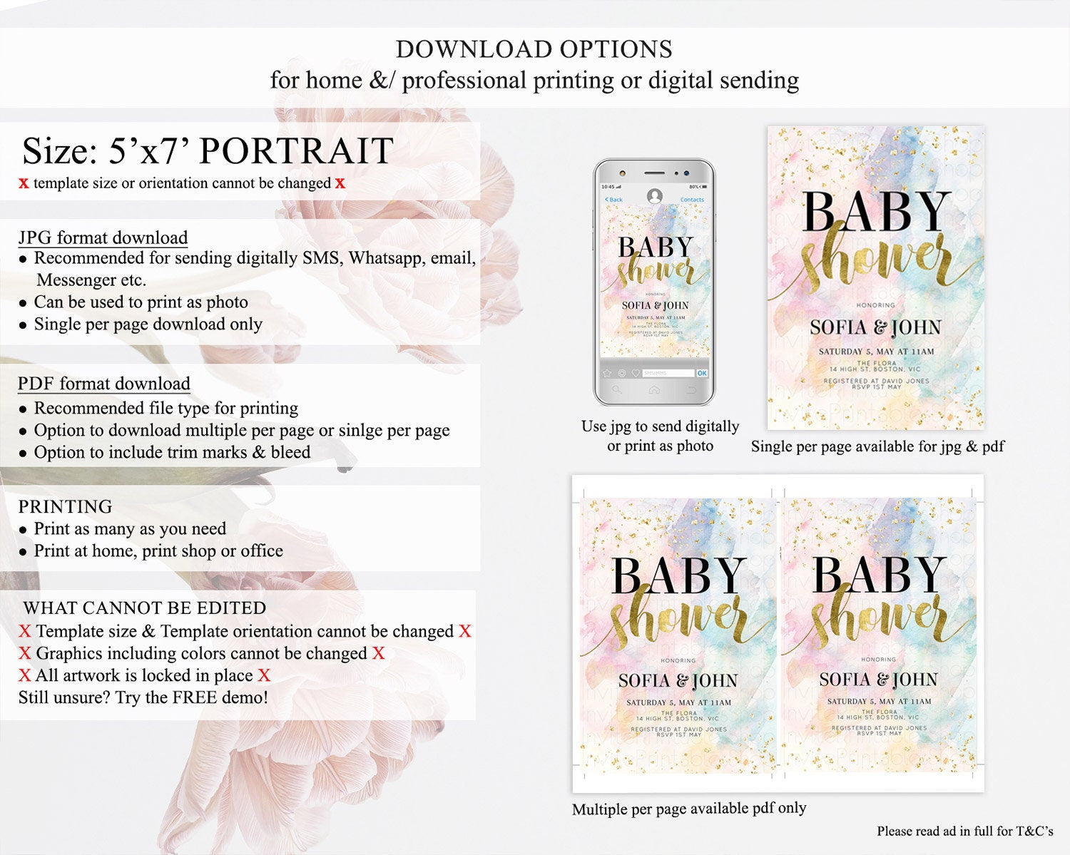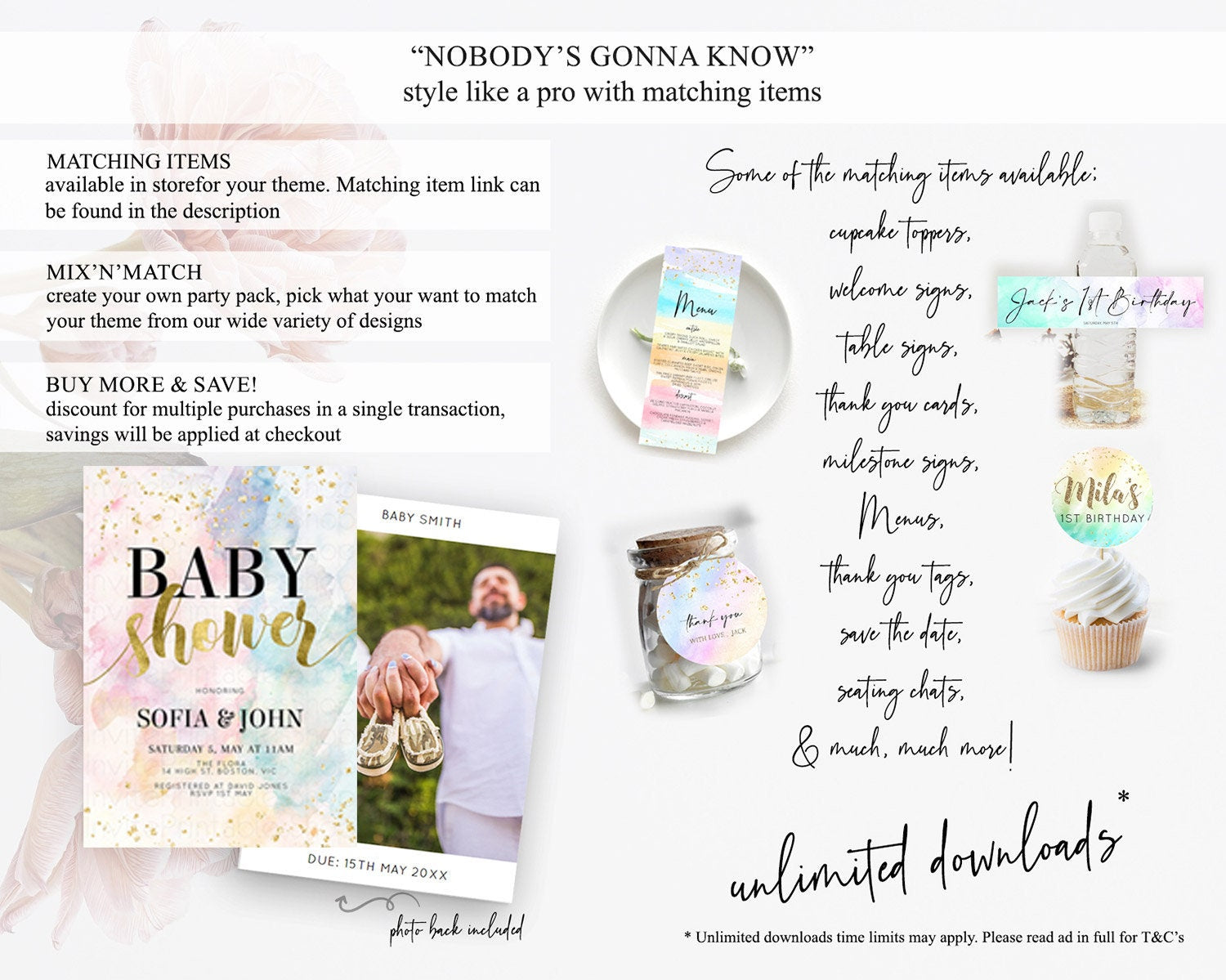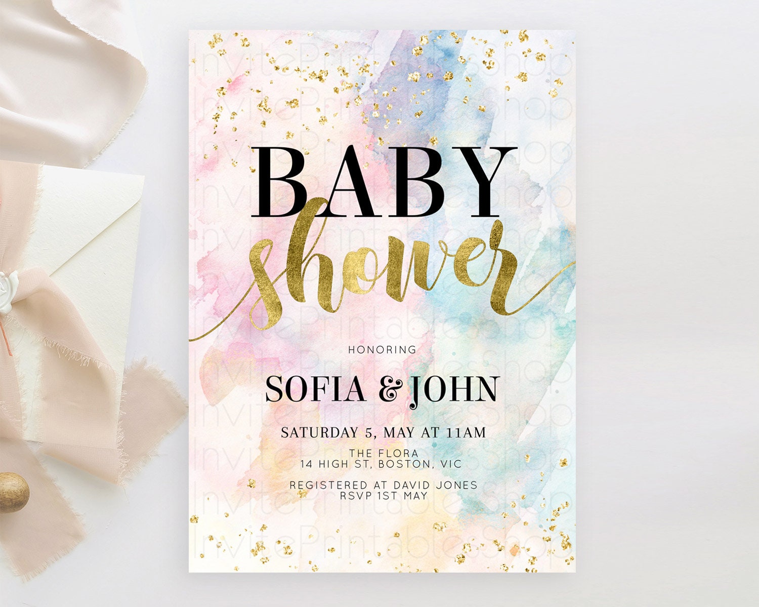 Pastel Baby Shower Invitation Rainbow Baby Shower Invitation Colorful Pastel Watercolor Invitation Gold Glitter Sprinkles Ombre D10265