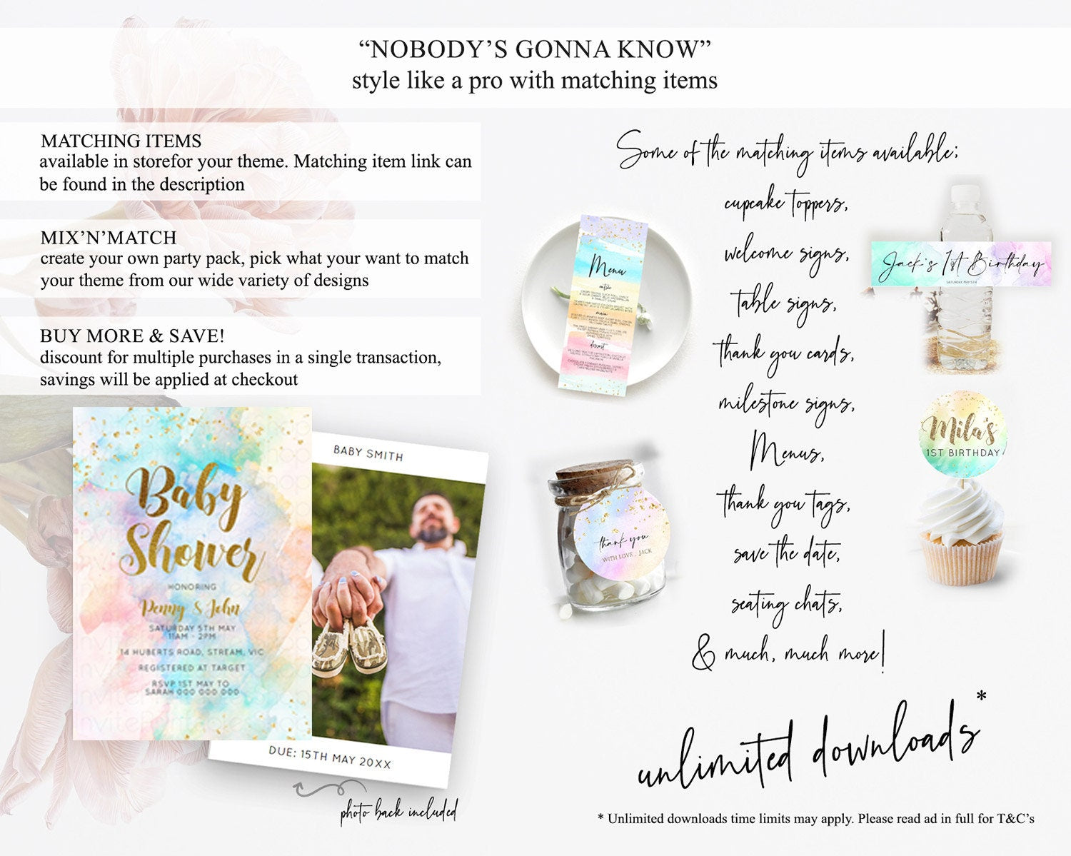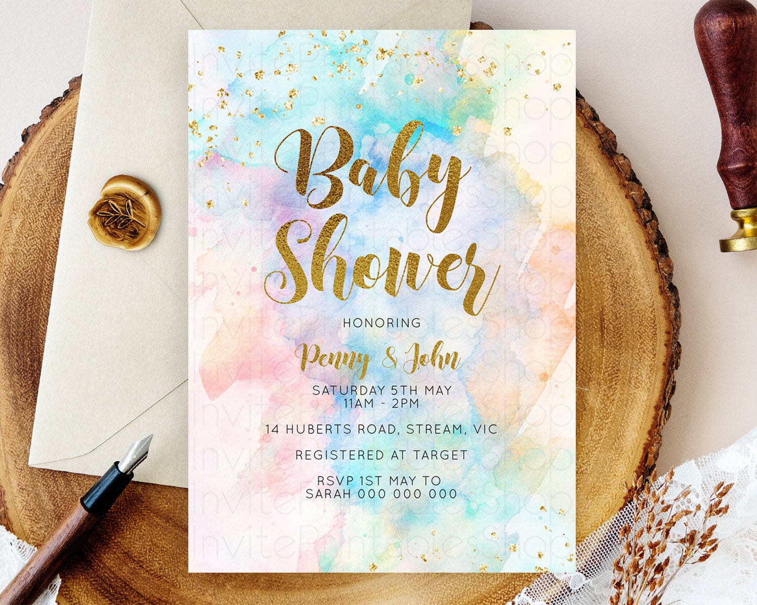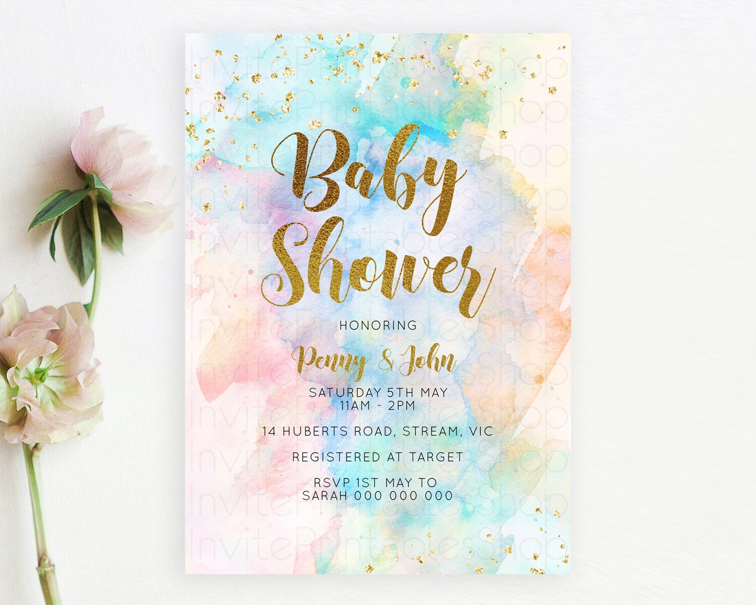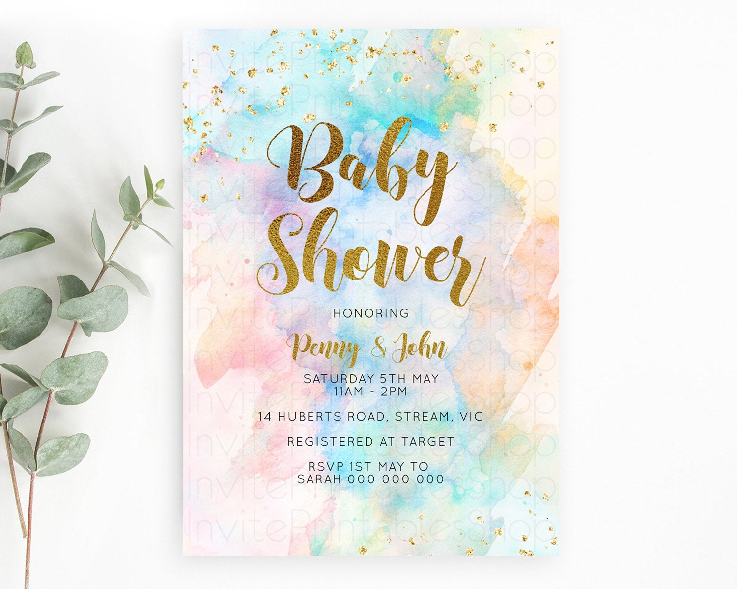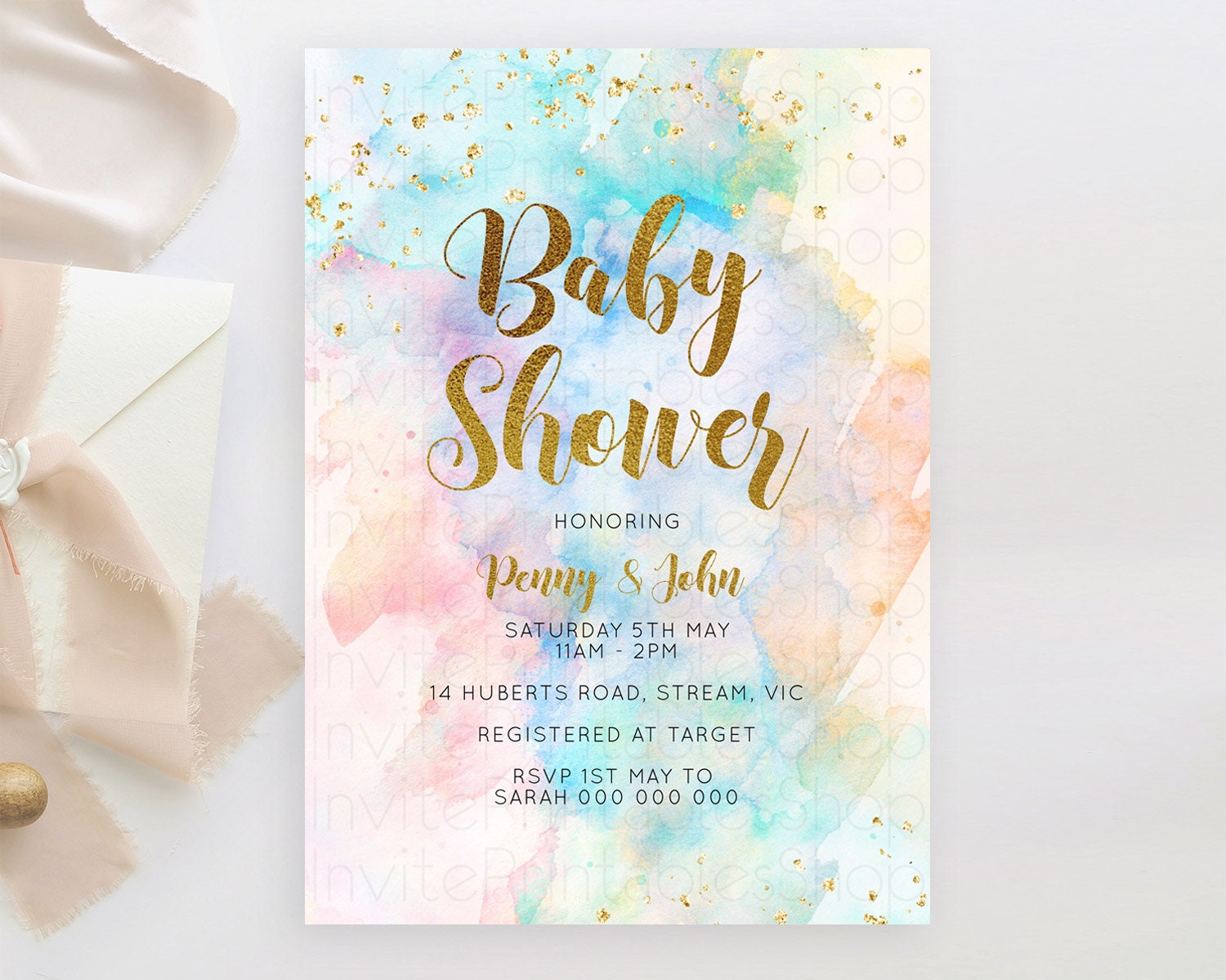 Pastel Baby Shower Invitation Rainbow Baby Shower Invitation Colorful Pastel Watercolor Invitation Gold Glitter Sprinkles Ombre D10272