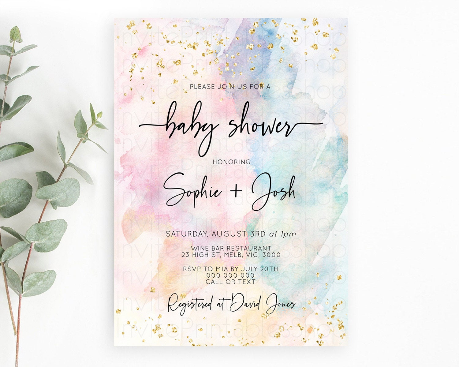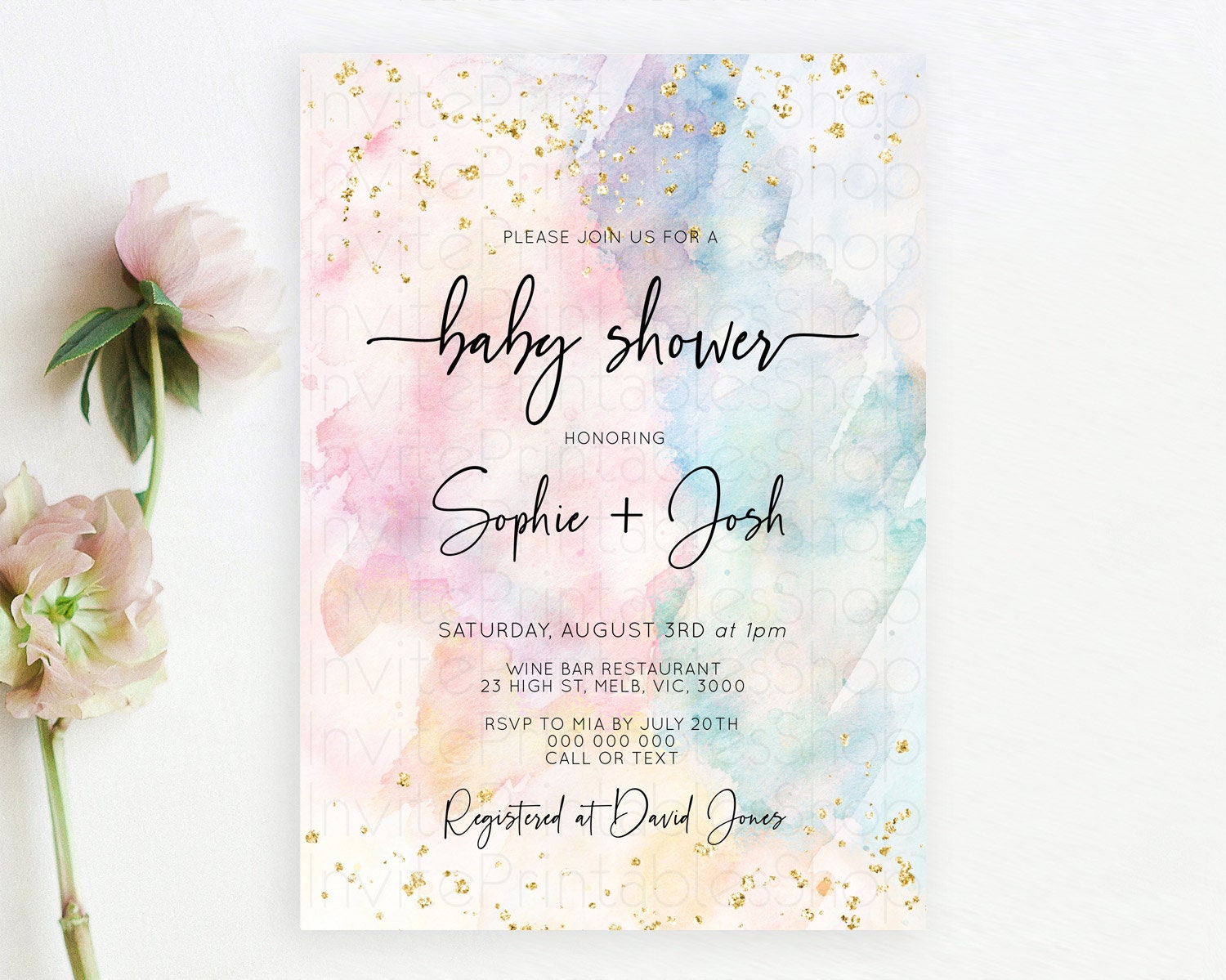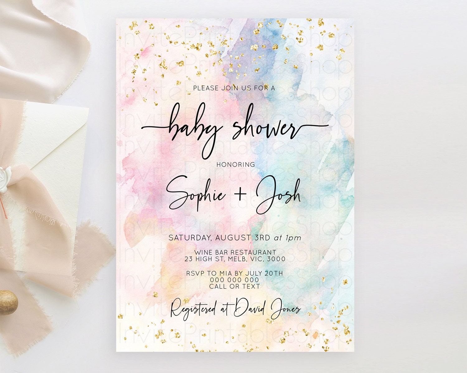 Pastel Baby Shower Invitation Rainbow Baby Shower Invitation Colorful Pastel Watercolor Invitation Gold Glitter Sprinkles Ombre D10276