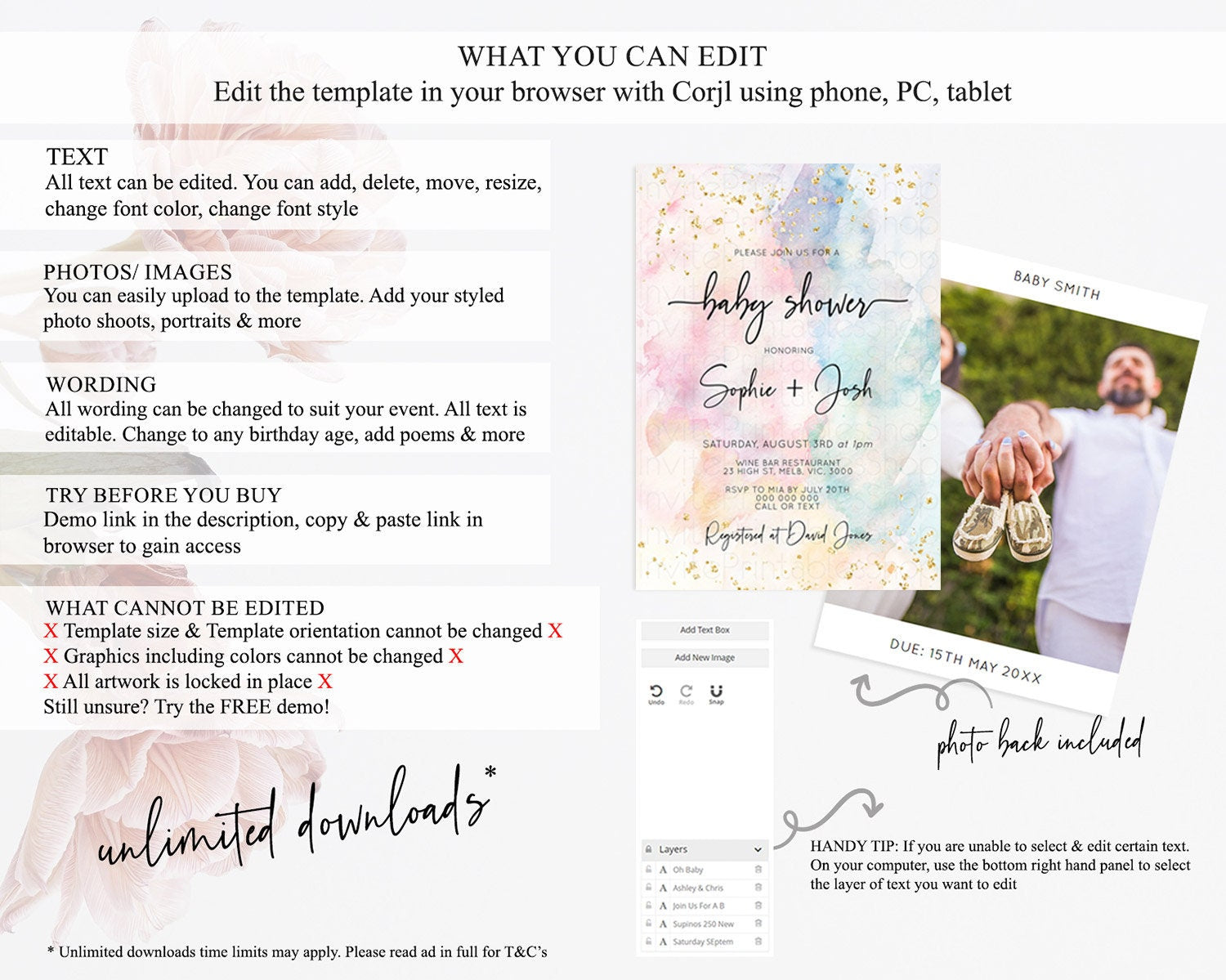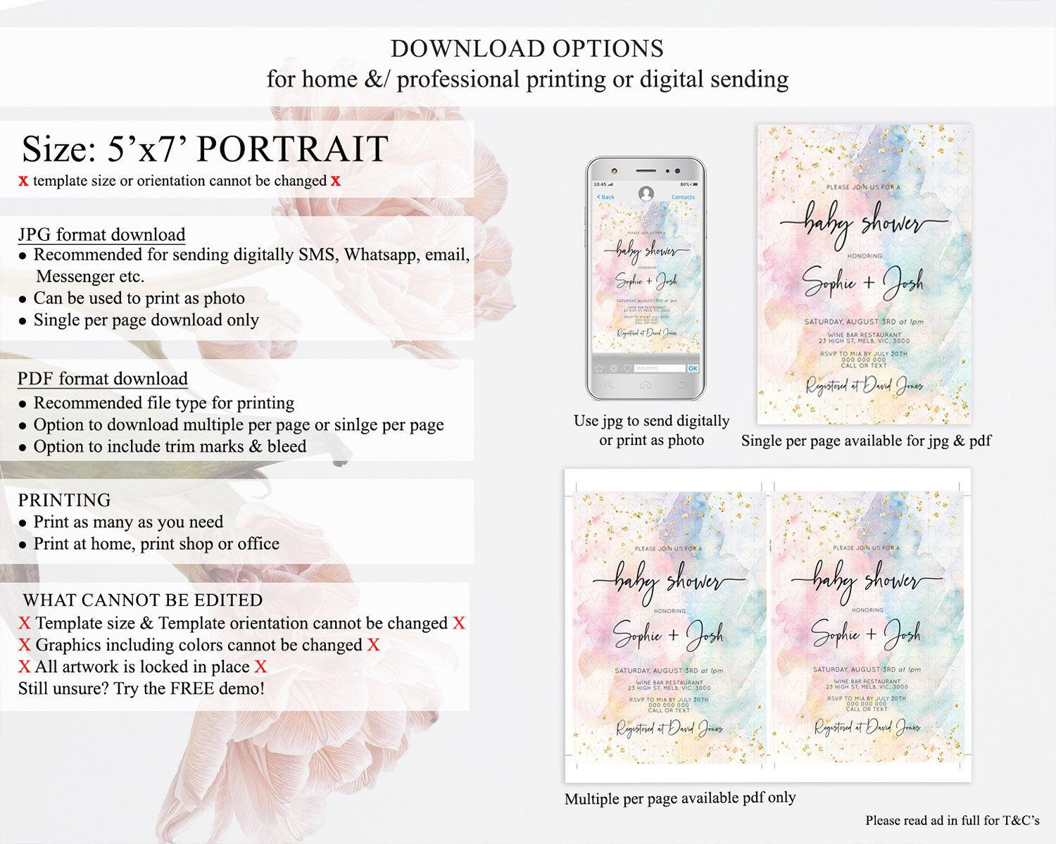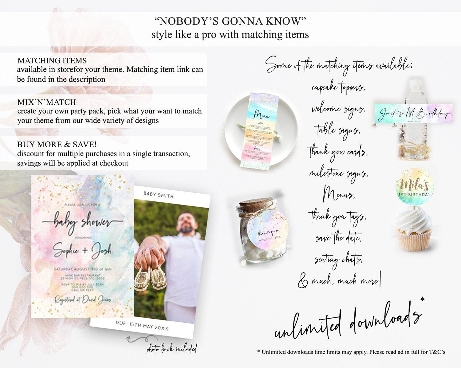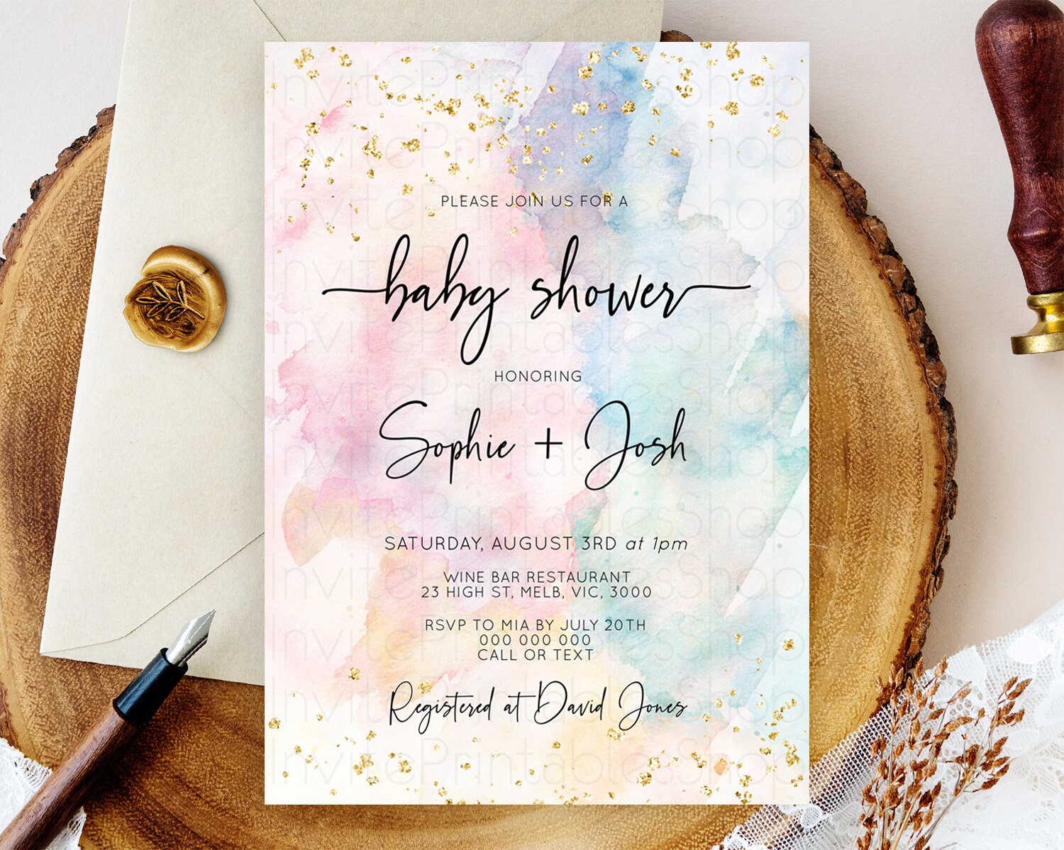 Pastel Baby Shower Invitation Rainbow Baby Shower Invitation Colorful Pastel Watercolor Invitation Gold Glitter Sprinkles Ombre D10276