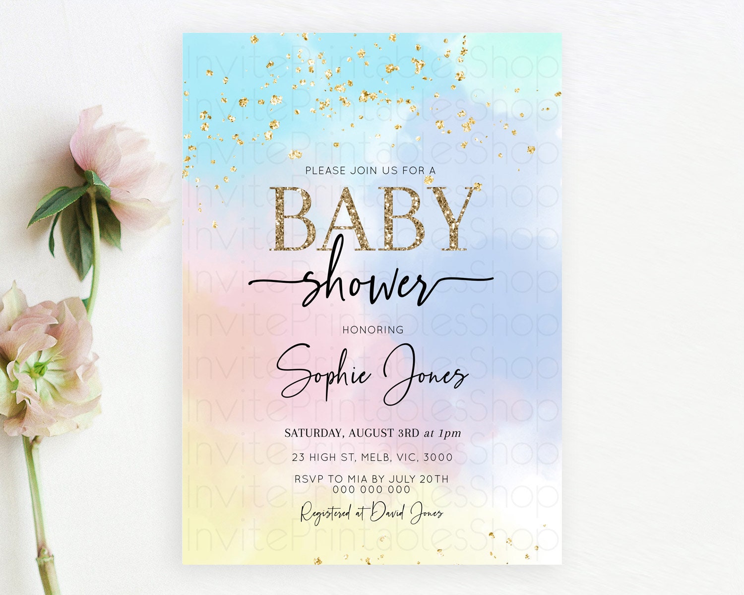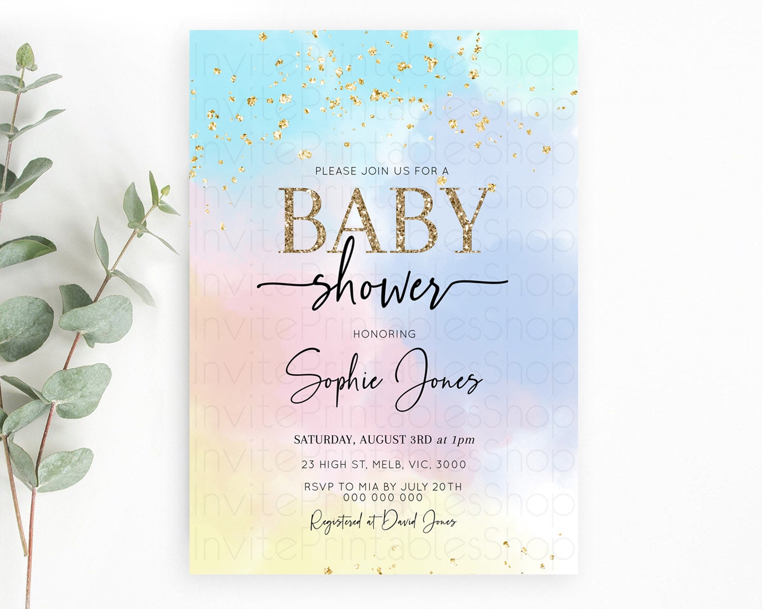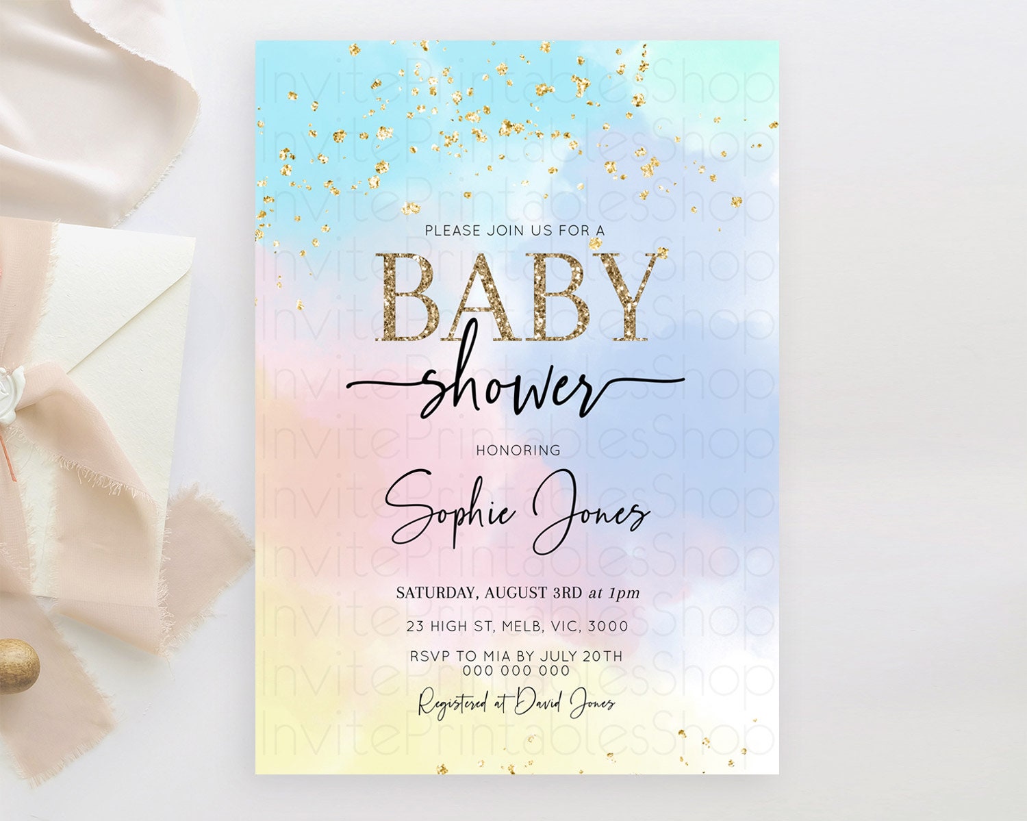 Pastel Baby Shower Invitation Rainbow Baby Shower Invitation Colorful Pastel Watercolor Invitation Gold Glitter Sprinkles Ombre D10368