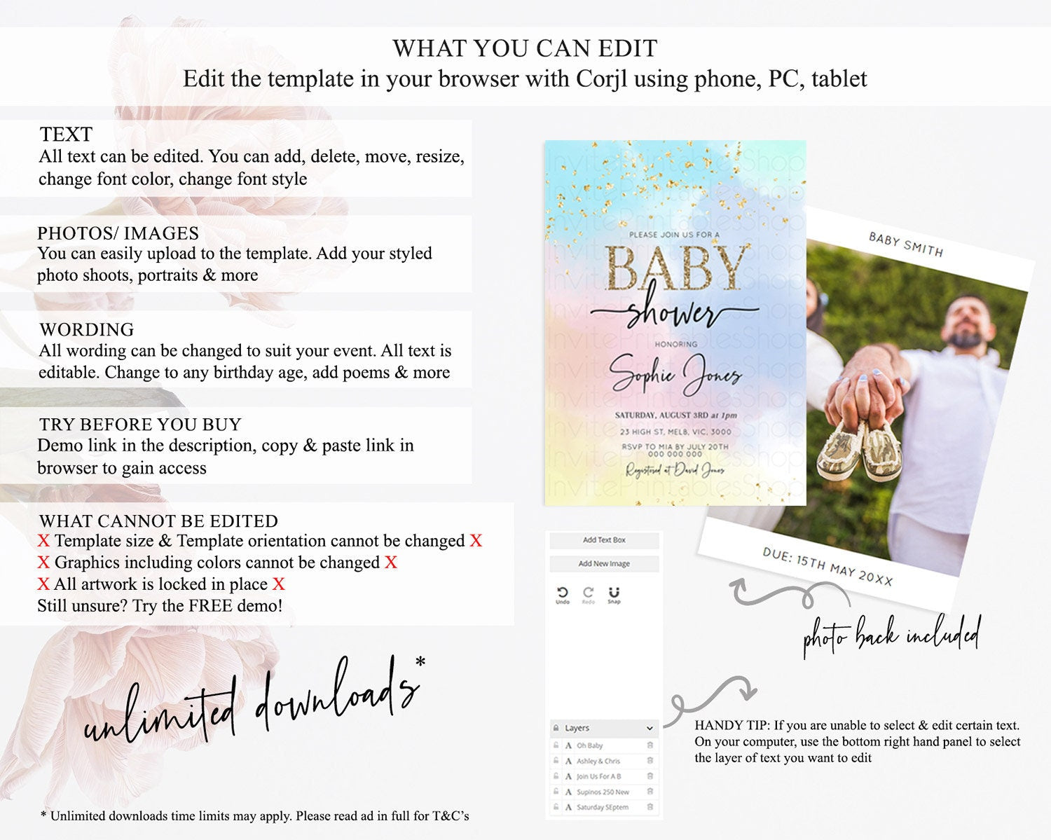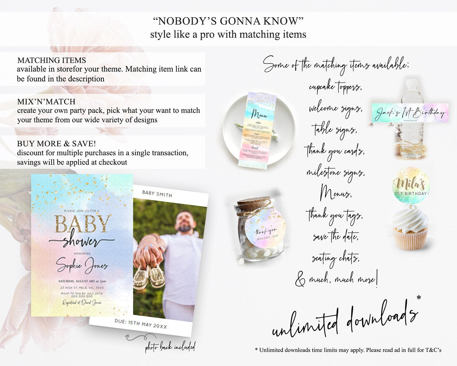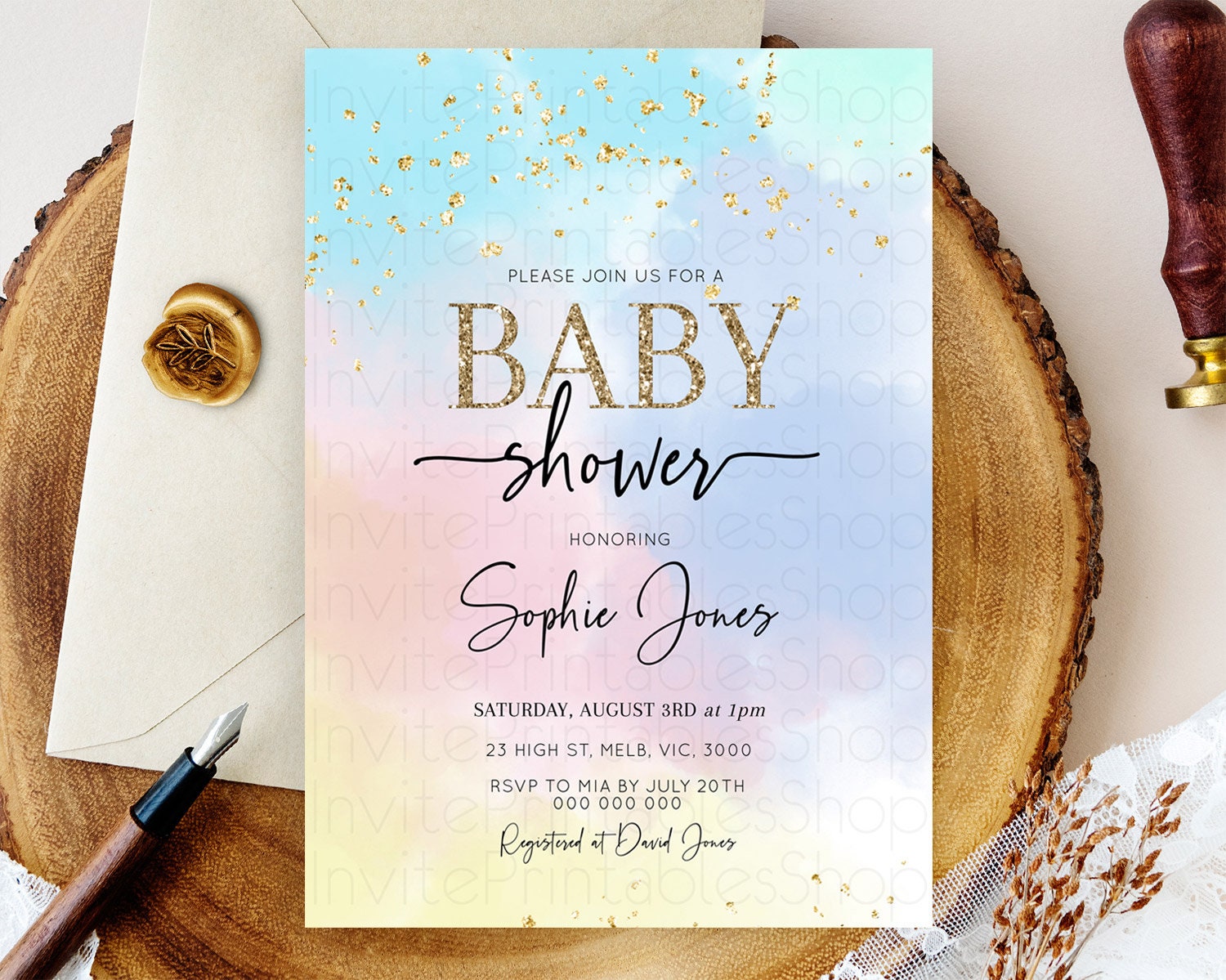 Pastel Baby Shower Invitation Rainbow Baby Shower Invitation Colorful Pastel Watercolor Invitation Gold Glitter Sprinkles Ombre D10368