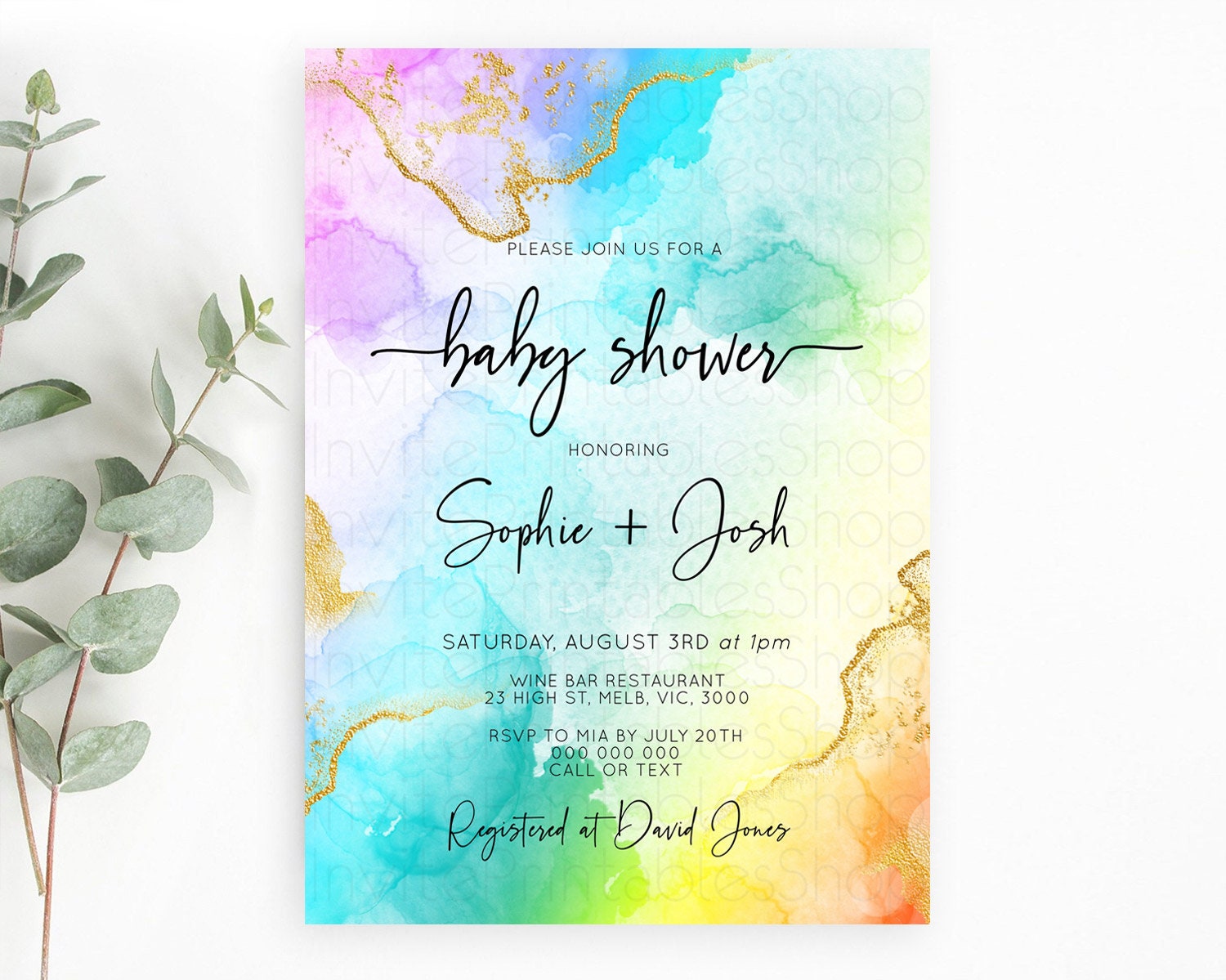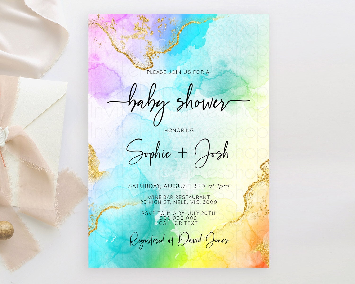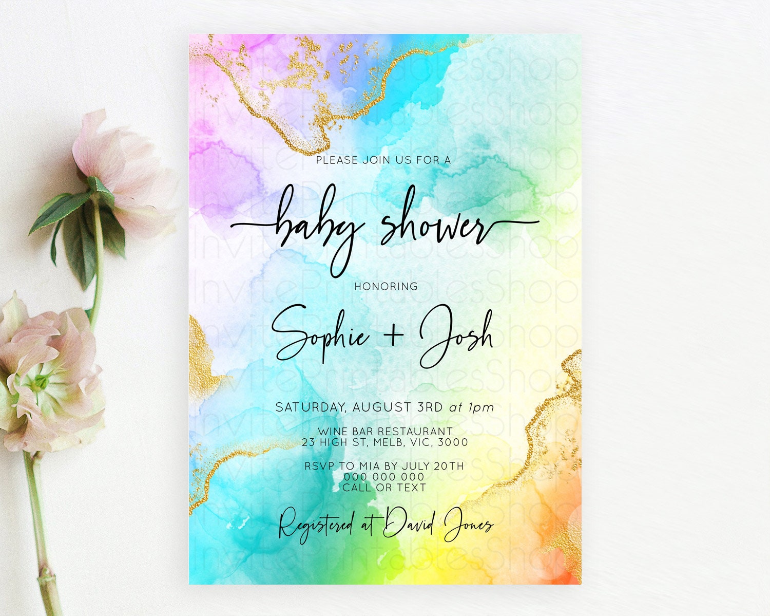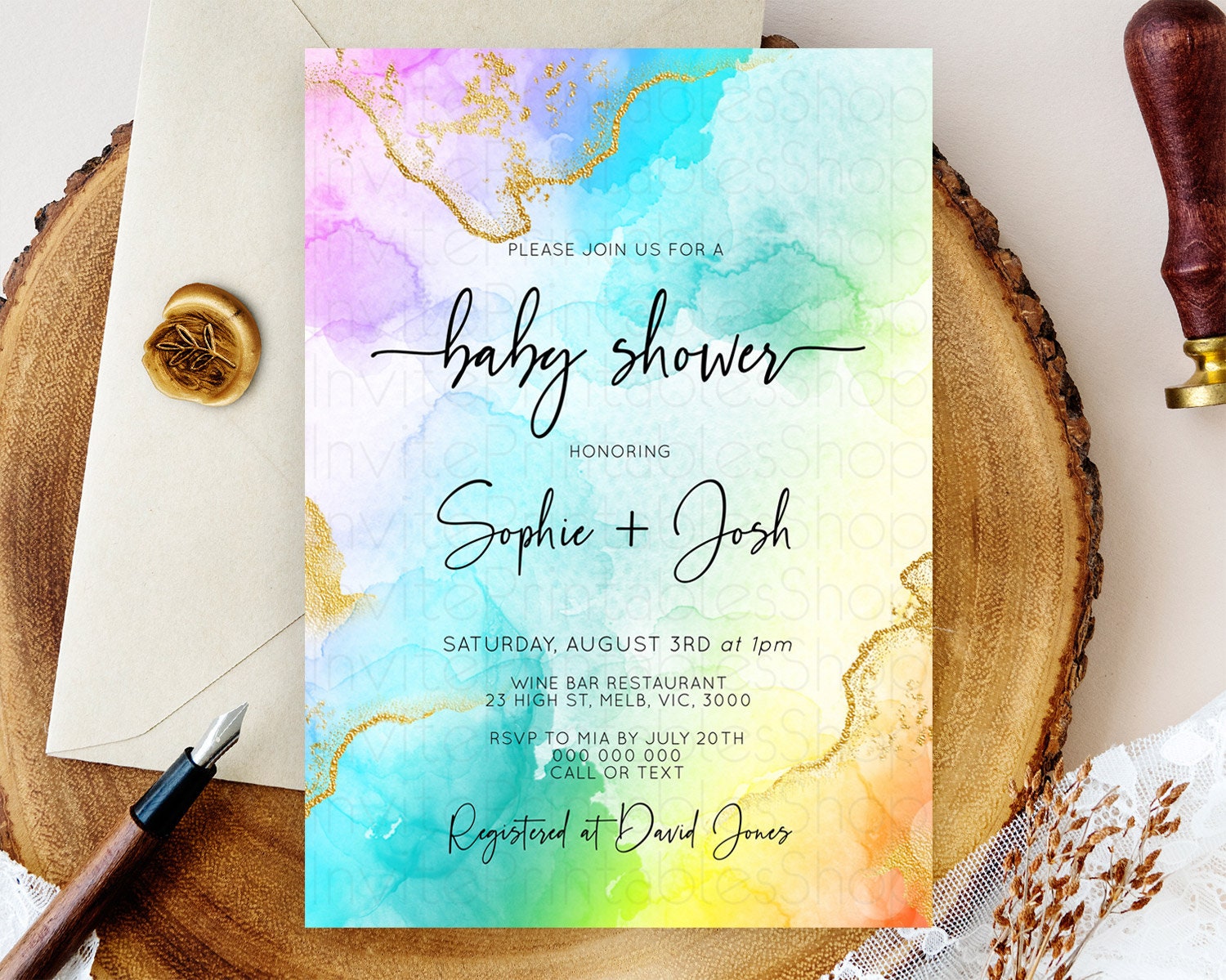 Pastel Baby Shower Invitation Rainbow Baby Shower Invitation Colorful Pastel Watercolor Invitation Gold Glitter Sprinkles Ombre D10390