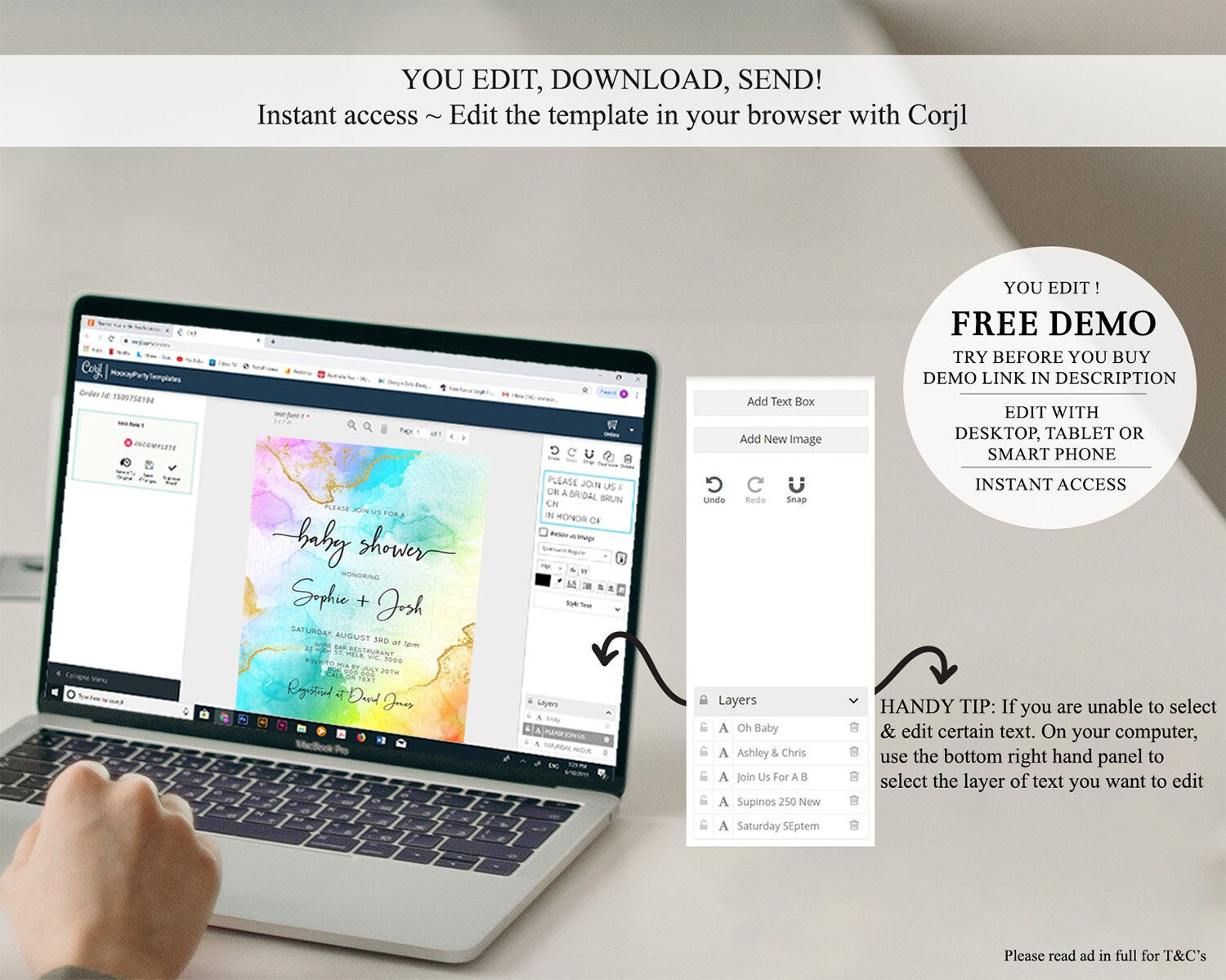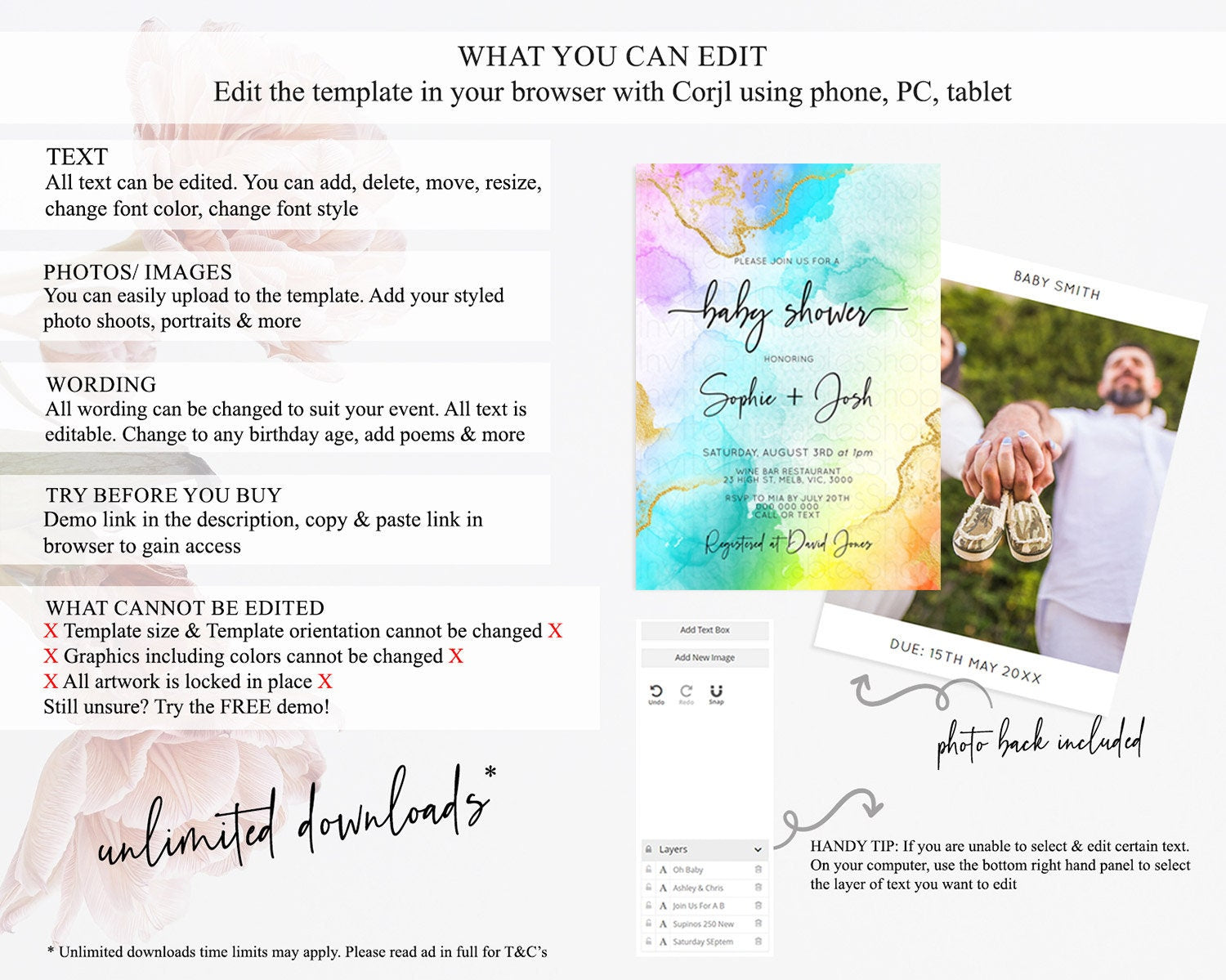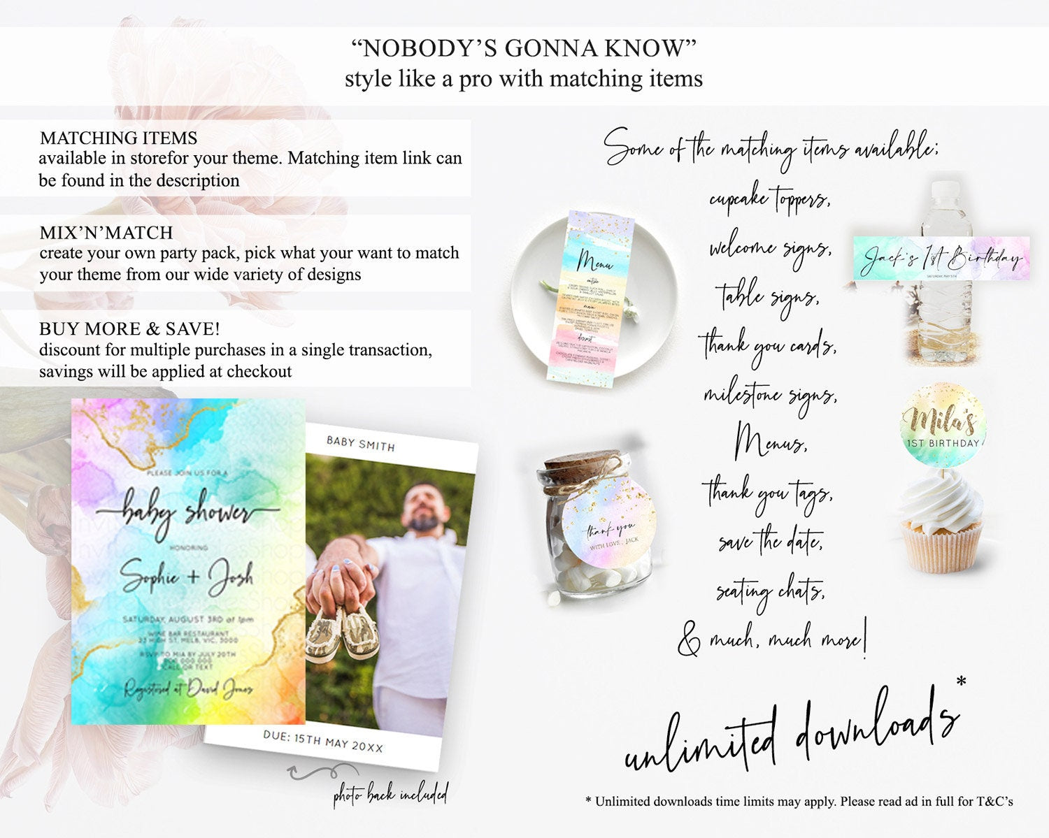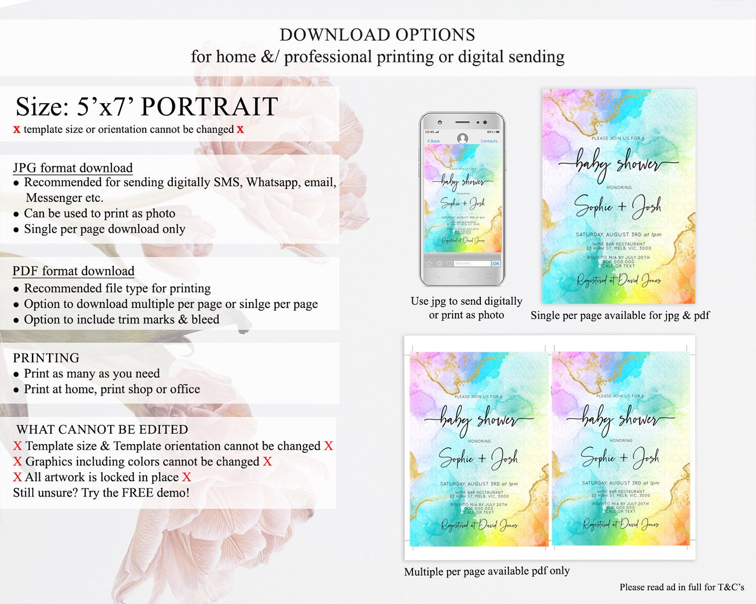 Pastel Baby Shower Invitation Rainbow Baby Shower Invitation Colorful Pastel Watercolor Invitation Gold Glitter Sprinkles Ombre D10390