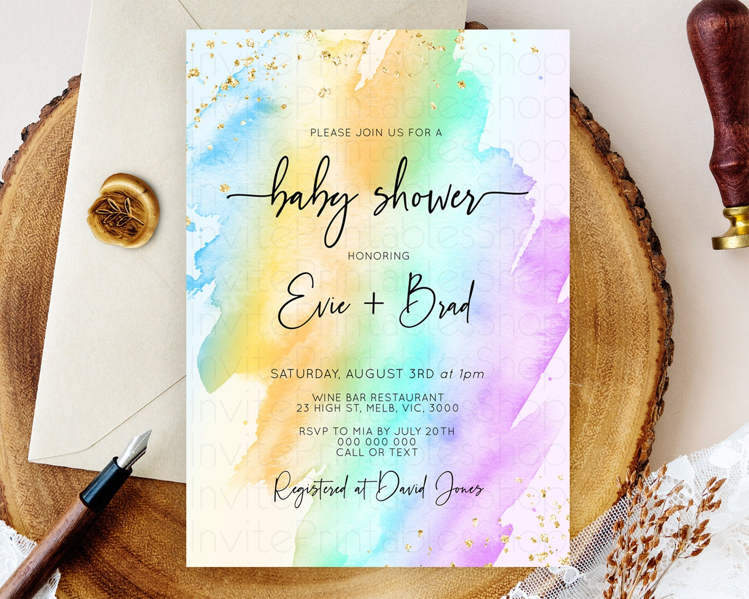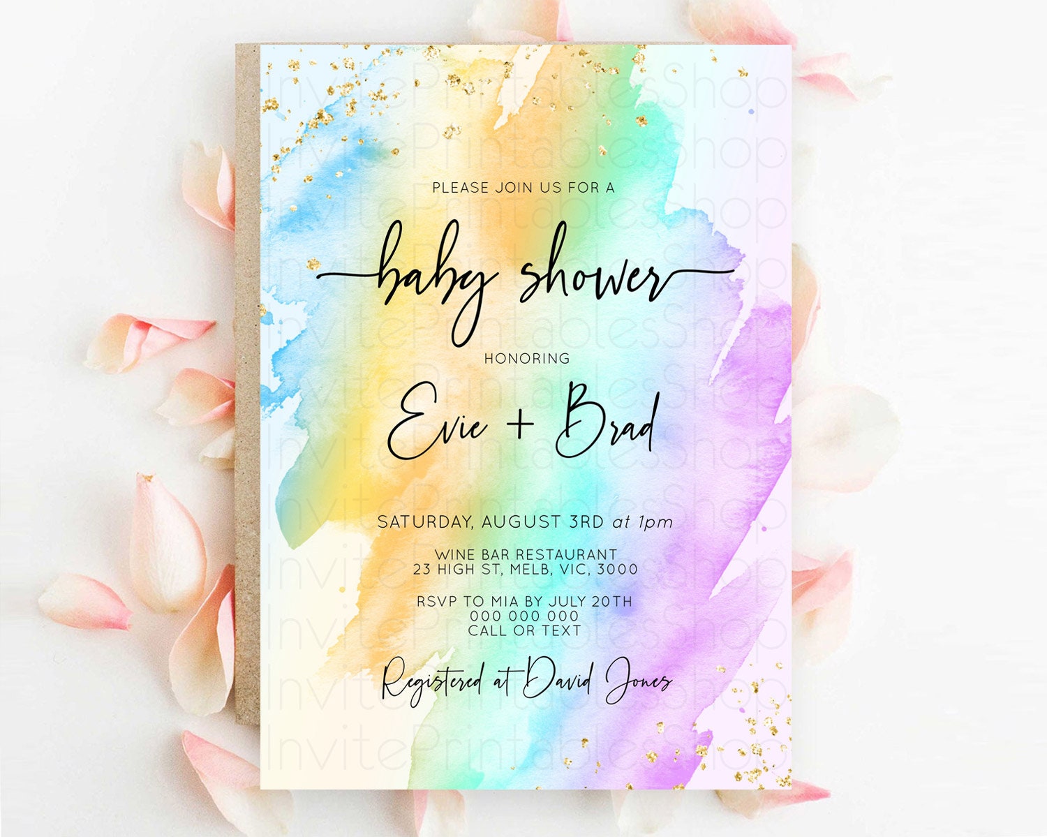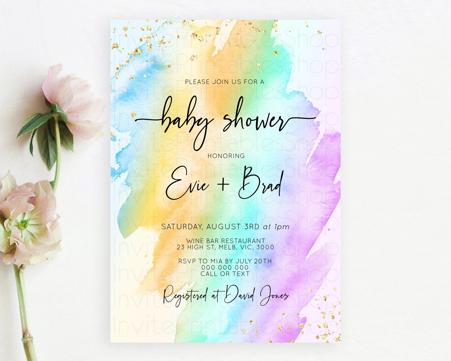 Pastel Baby Shower Invitation Rainbow Baby Shower Invitation Colorful Pastel Watercolor Invitation Gold Glitter Sprinkles Ombre D10425