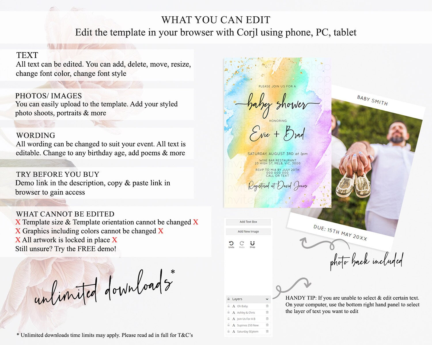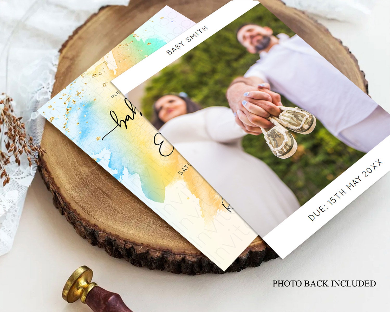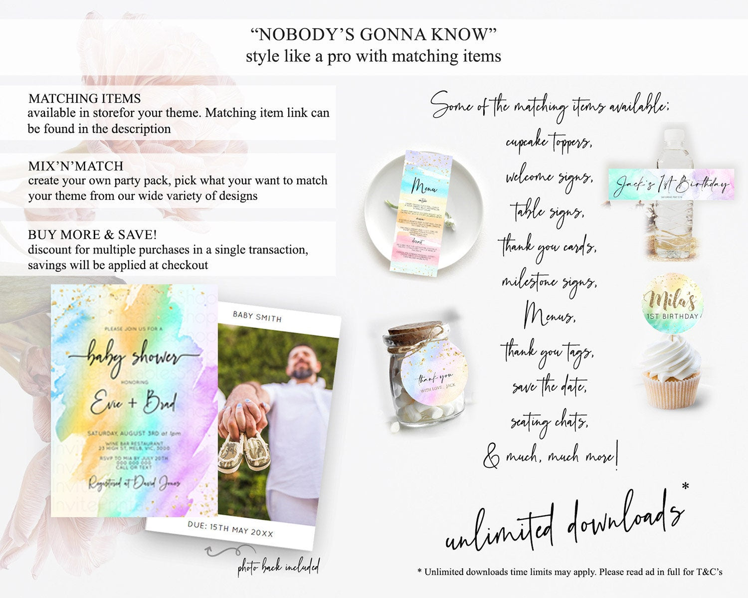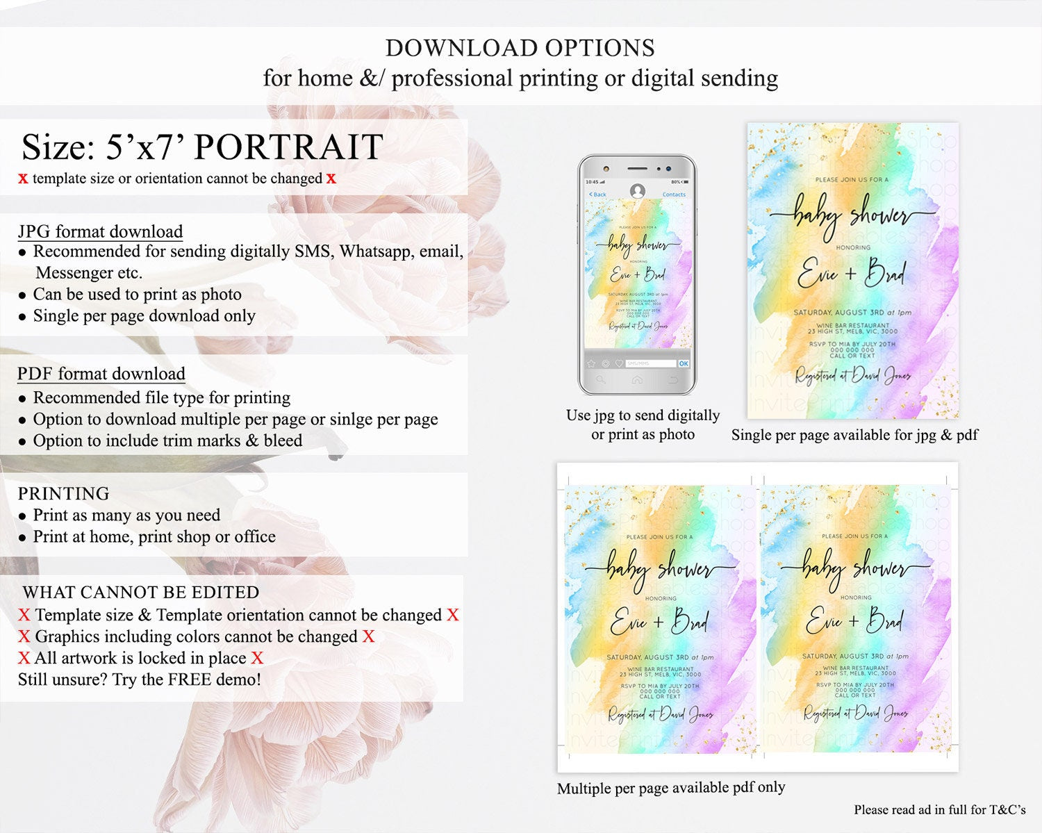 Pastel Baby Shower Invitation Rainbow Baby Shower Invitation Colorful Pastel Watercolor Invitation Gold Glitter Sprinkles Ombre D10425