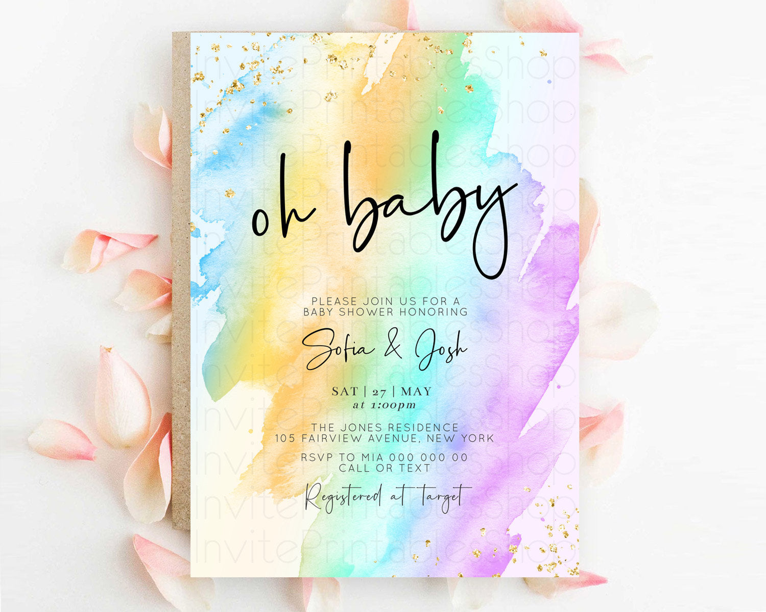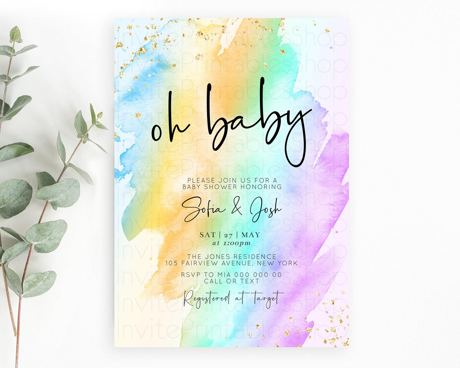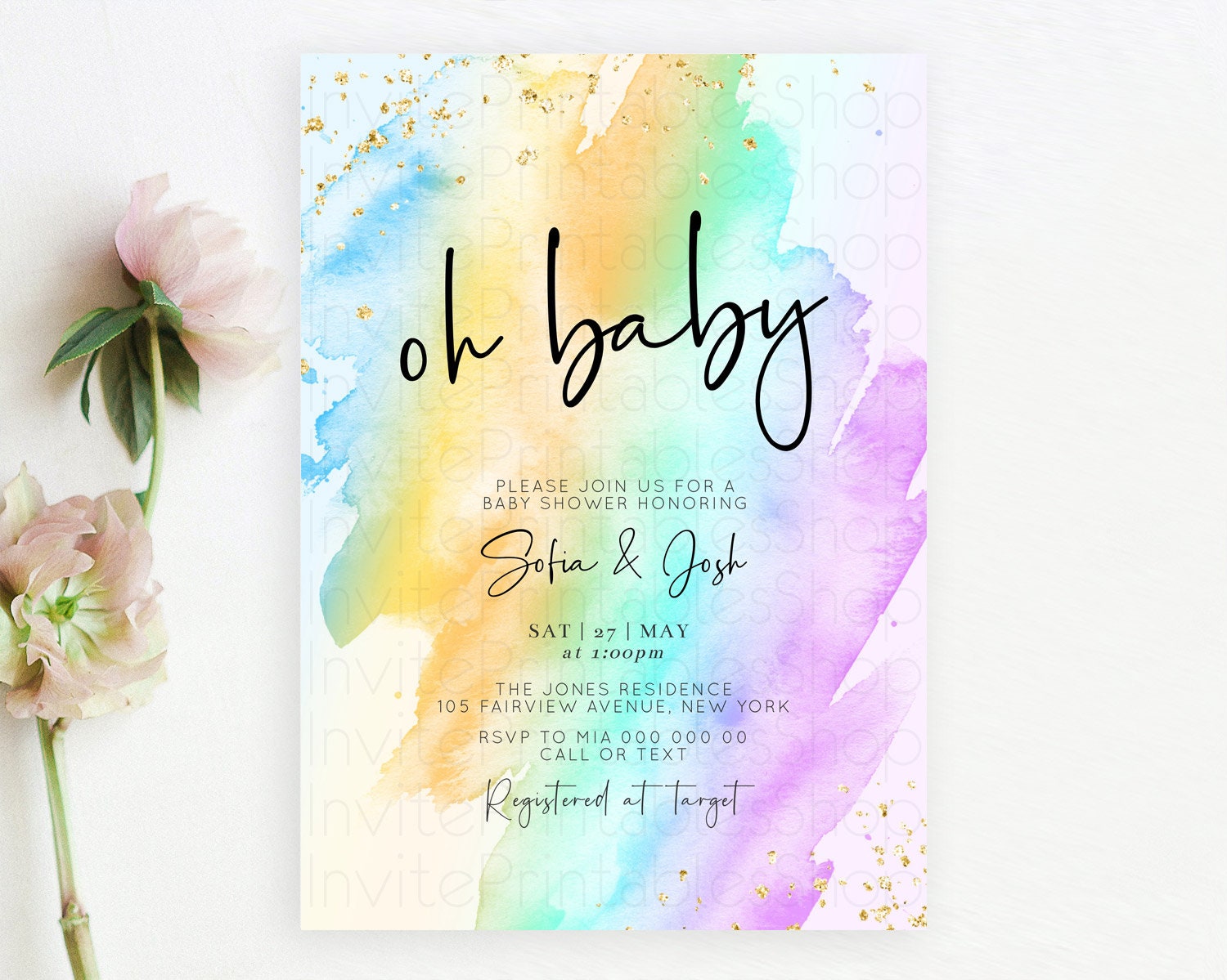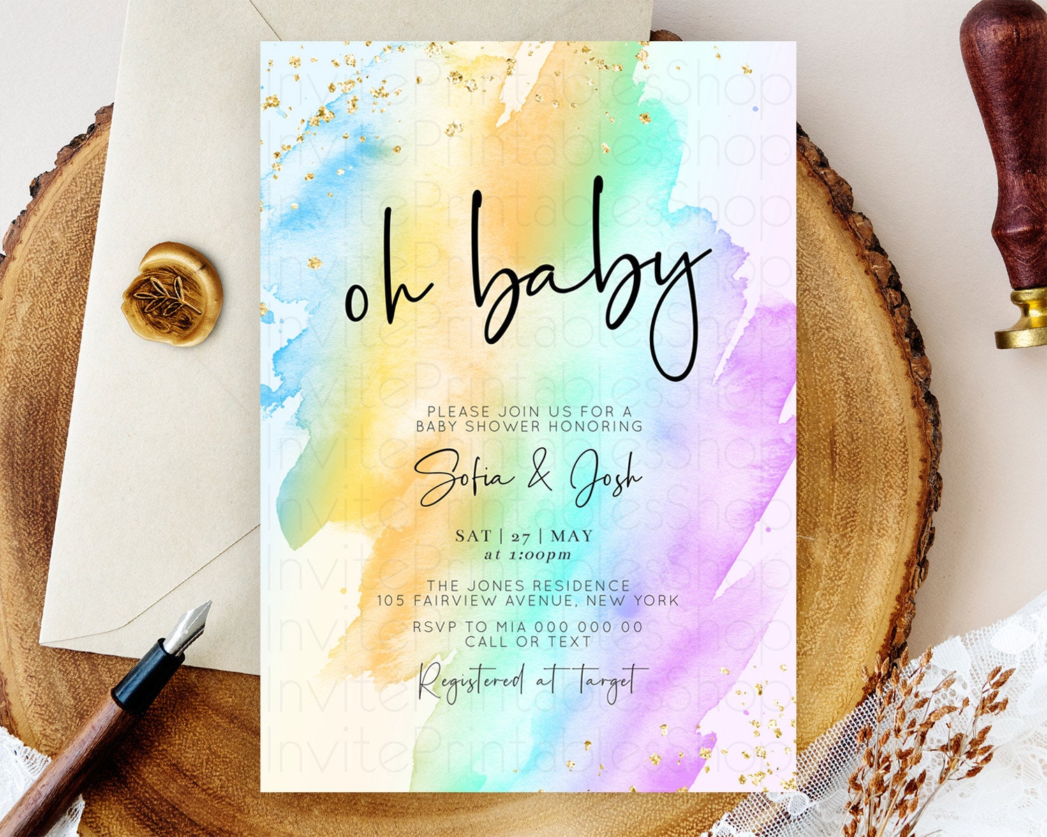 Pastel Baby Shower Invitation Rainbow Baby Shower Invitation Colorful Pastel Watercolor Invitation Gold Glitter Sprinkles Ombre D10427
