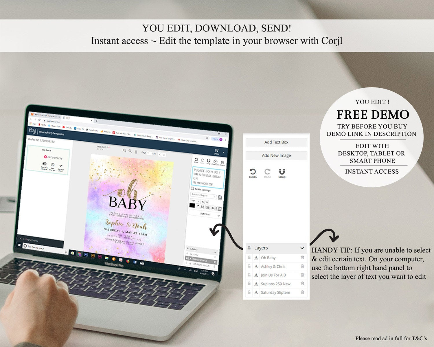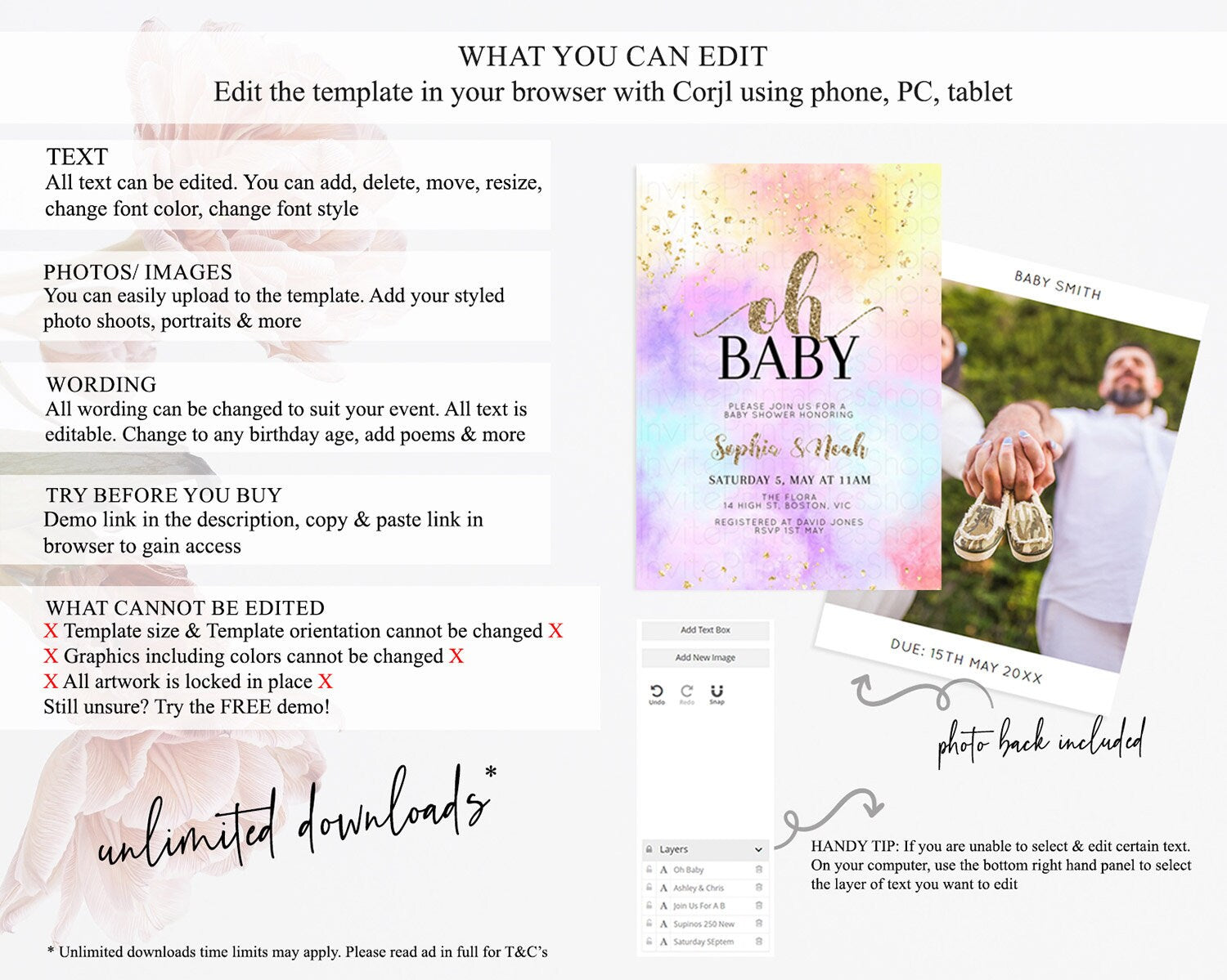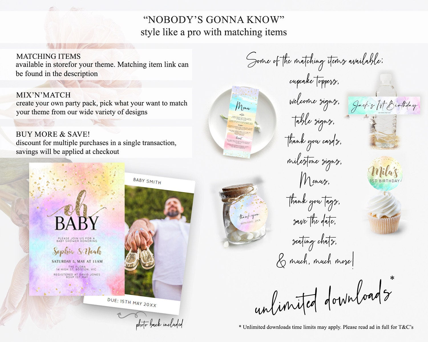 Pastel Baby Shower Invitation Rainbow Baby Shower Invitation Colorful Pastel Watercolor Invitation Gold Glitter Sprinkles Ombre D10435