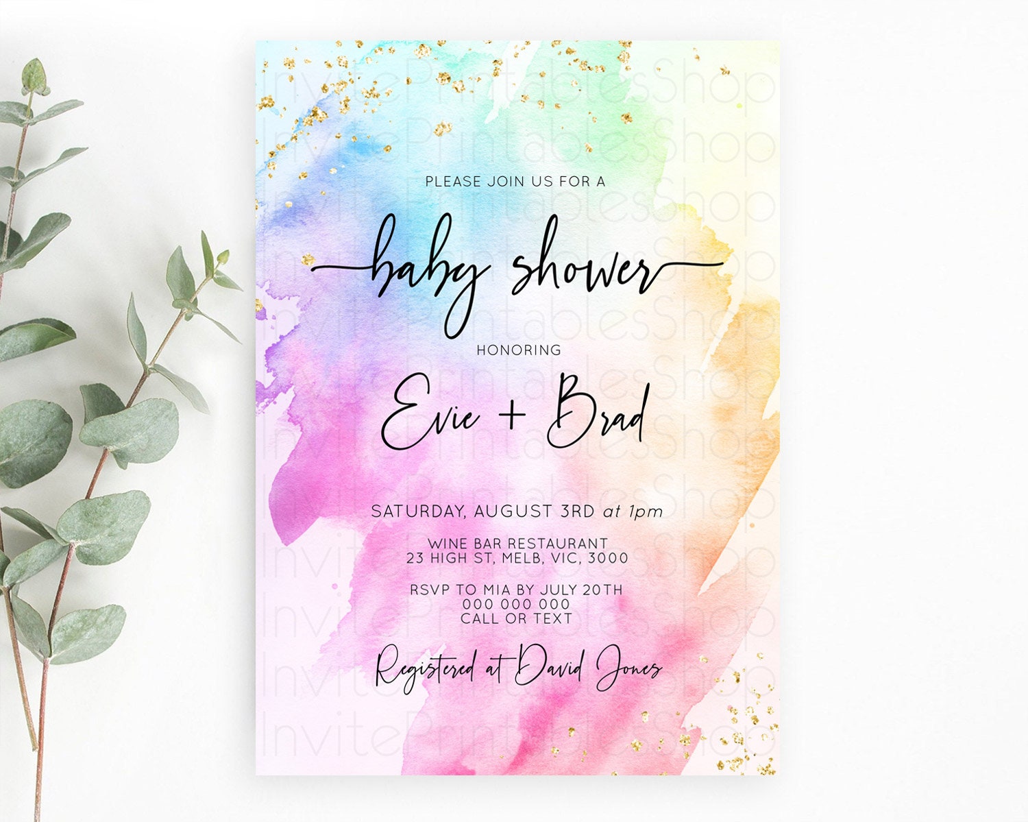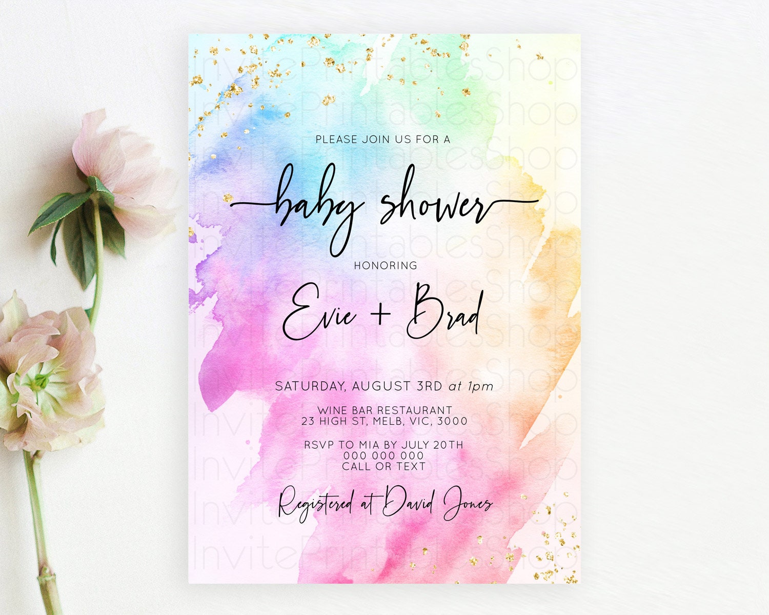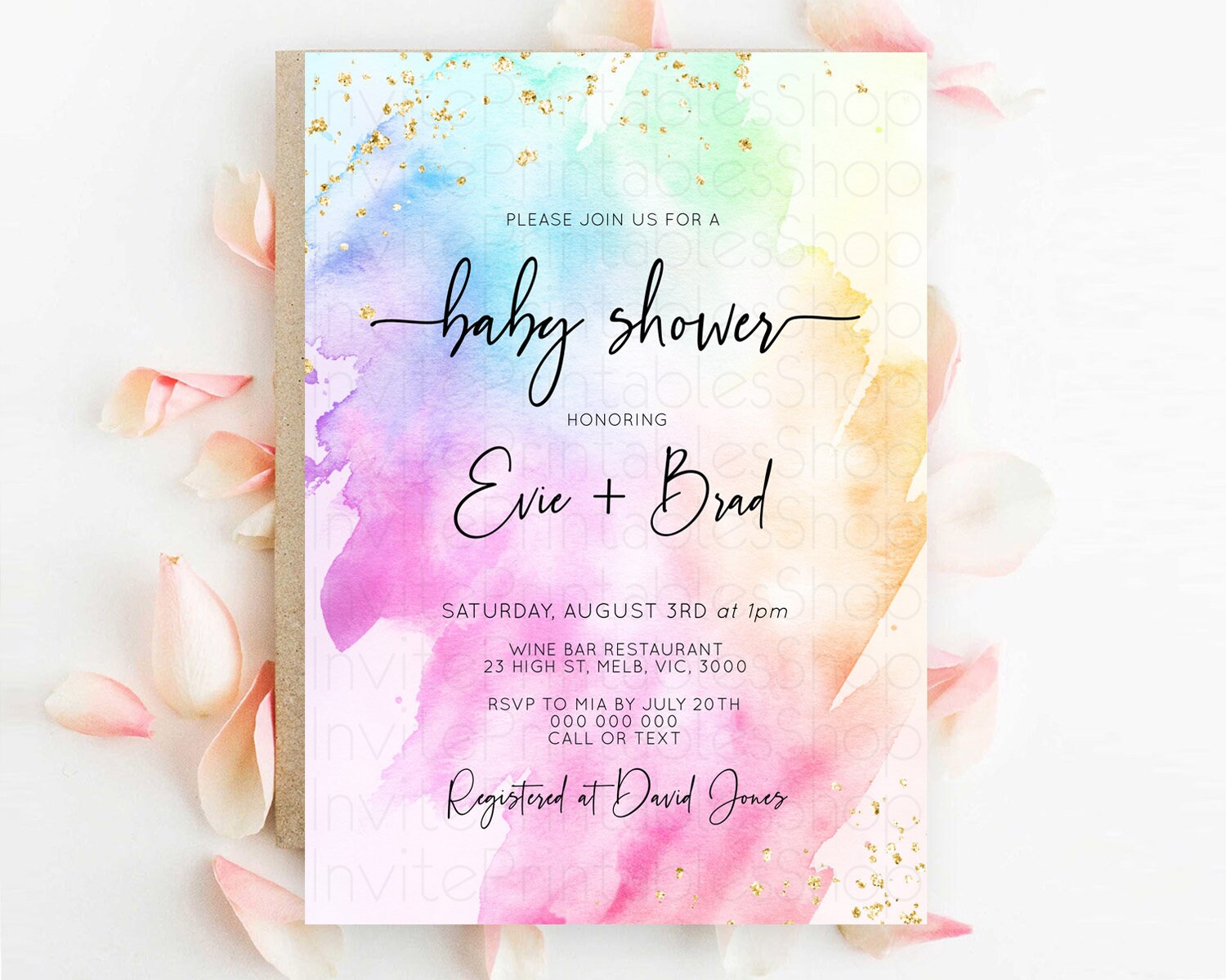 Pastel Baby Shower Invitation Rainbow Baby Shower Invitation Colorful Pastel Watercolor Invitation Gold Glitter Sprinkles Ombre D10449