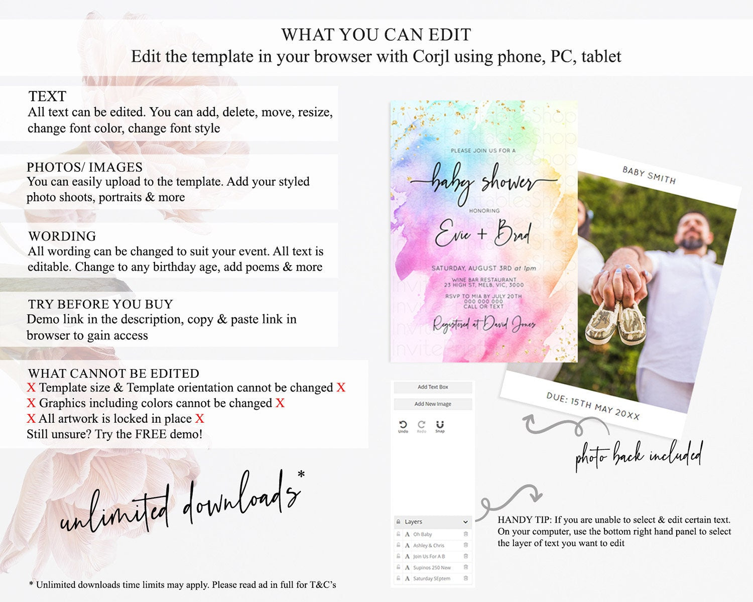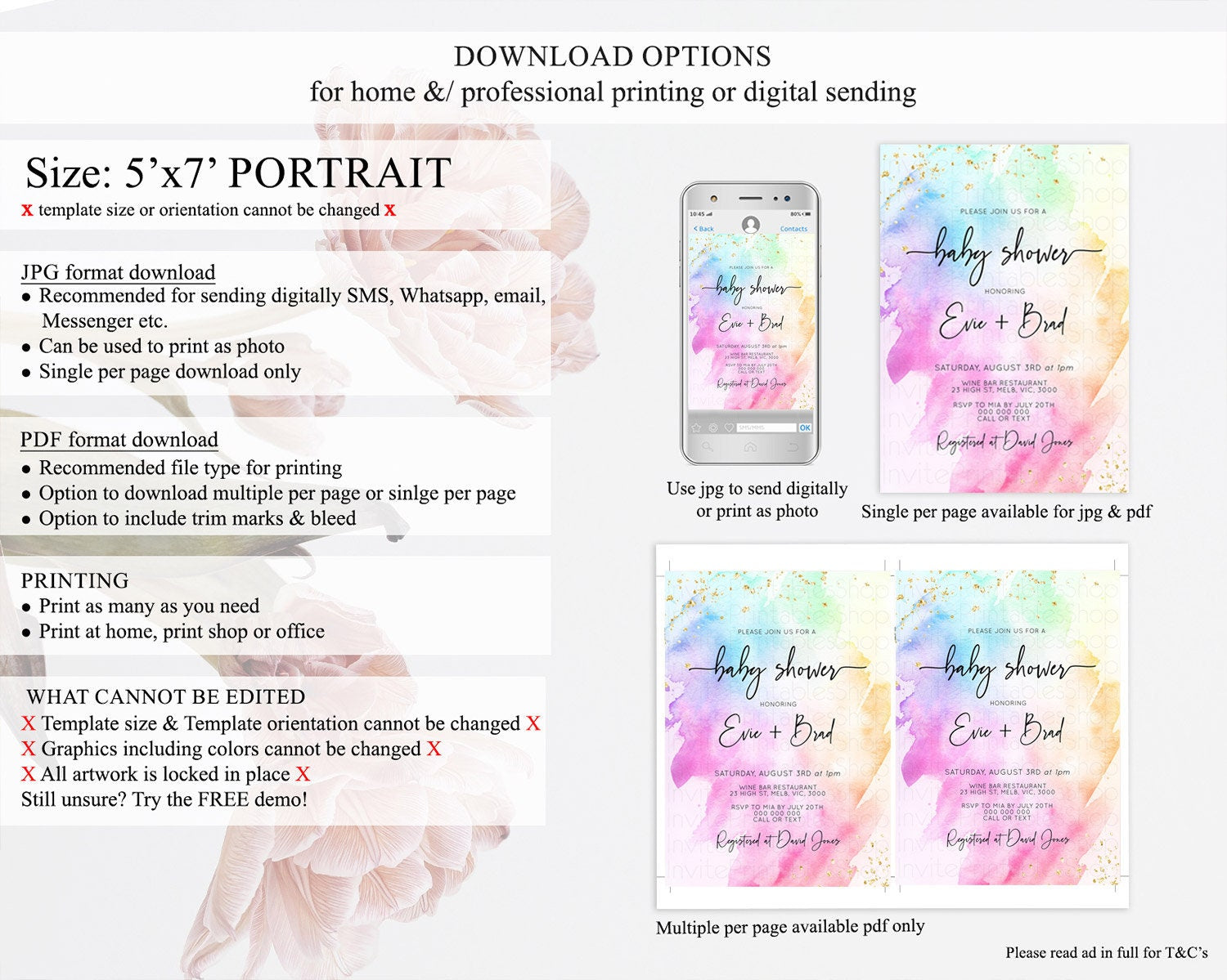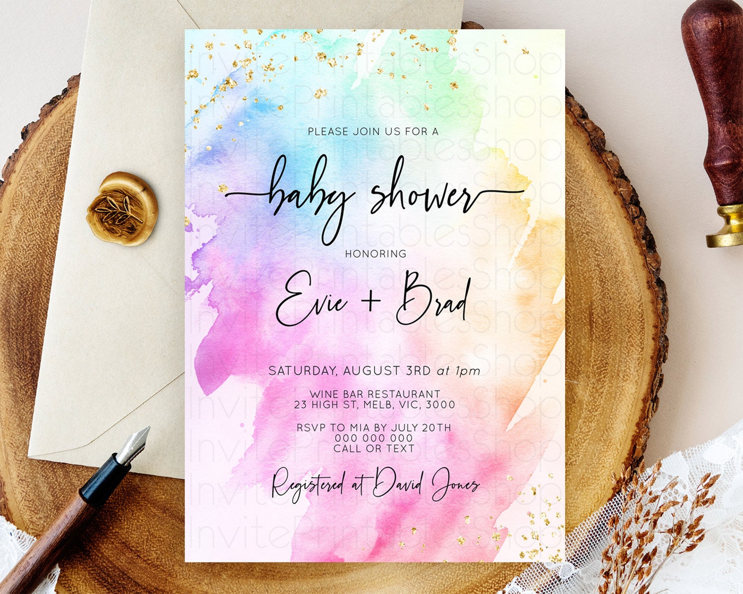 Pastel Baby Shower Invitation Rainbow Baby Shower Invitation Colorful Pastel Watercolor Invitation Gold Glitter Sprinkles Ombre D10449