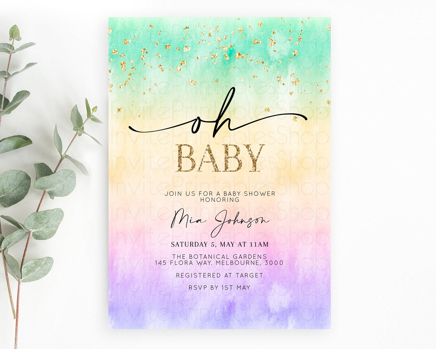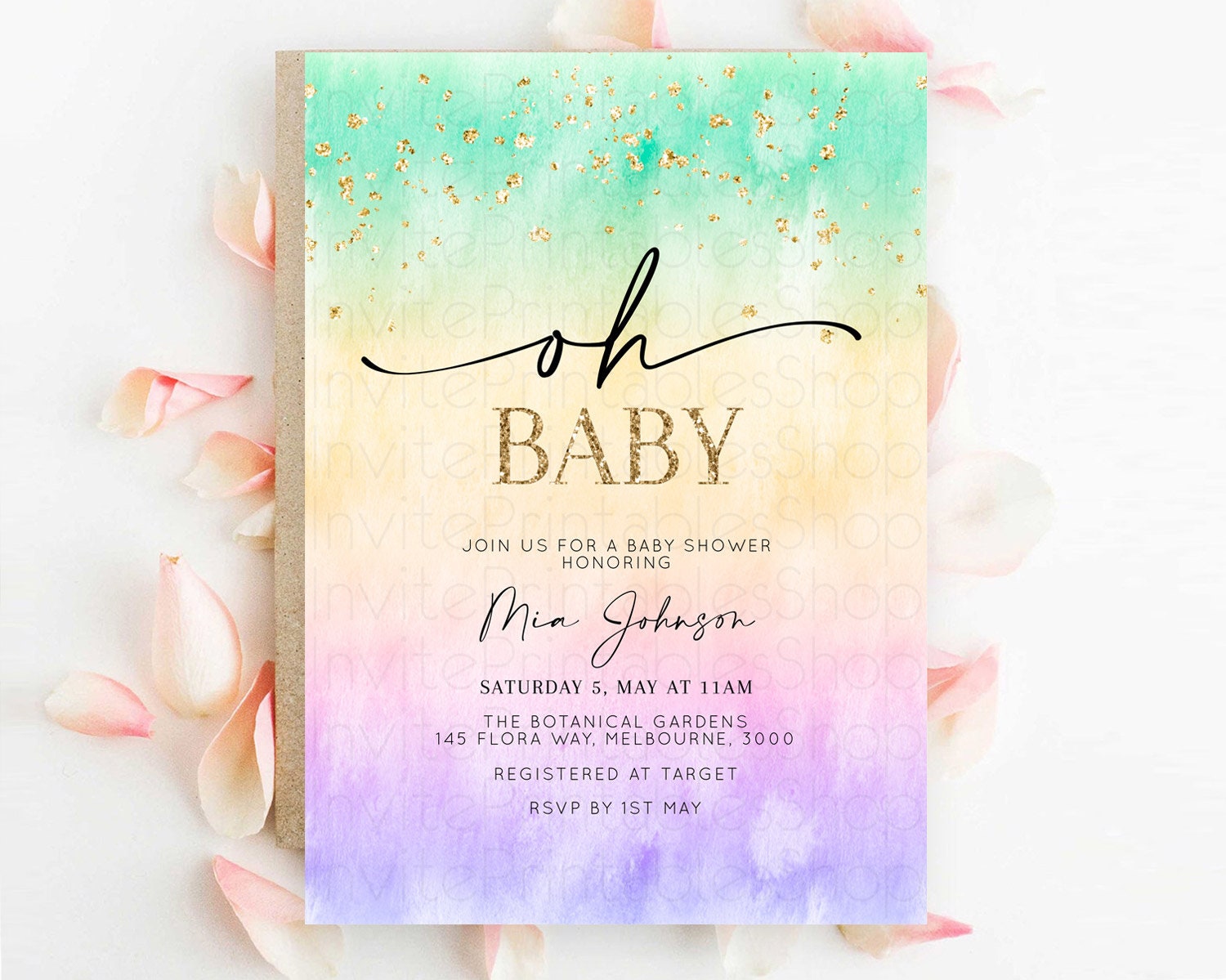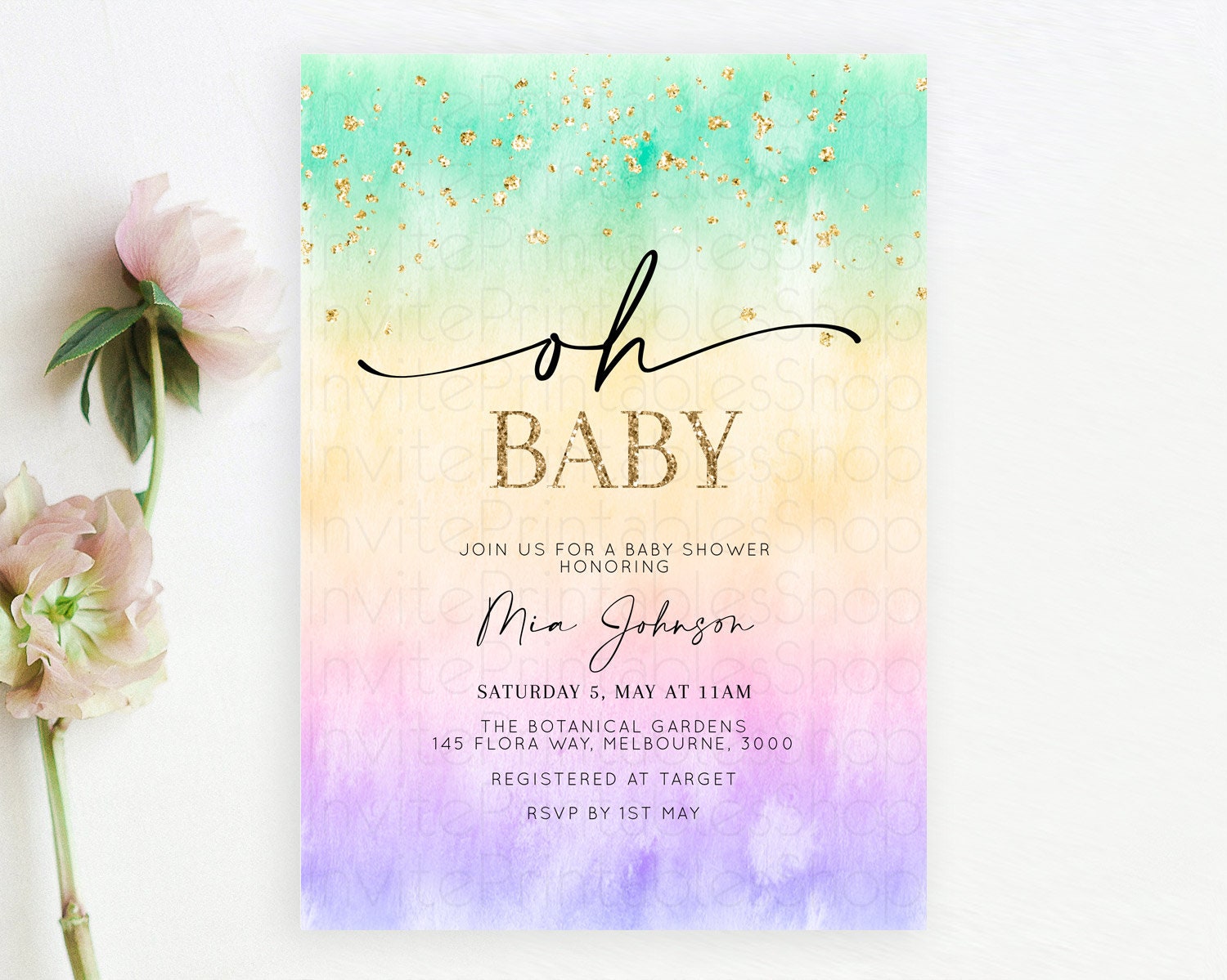 Pastel Baby Shower Invitation Rainbow Baby Shower Invitation Colorful Pastel Watercolor Invitation Gold Glitter Sprinkles Ombre D10481