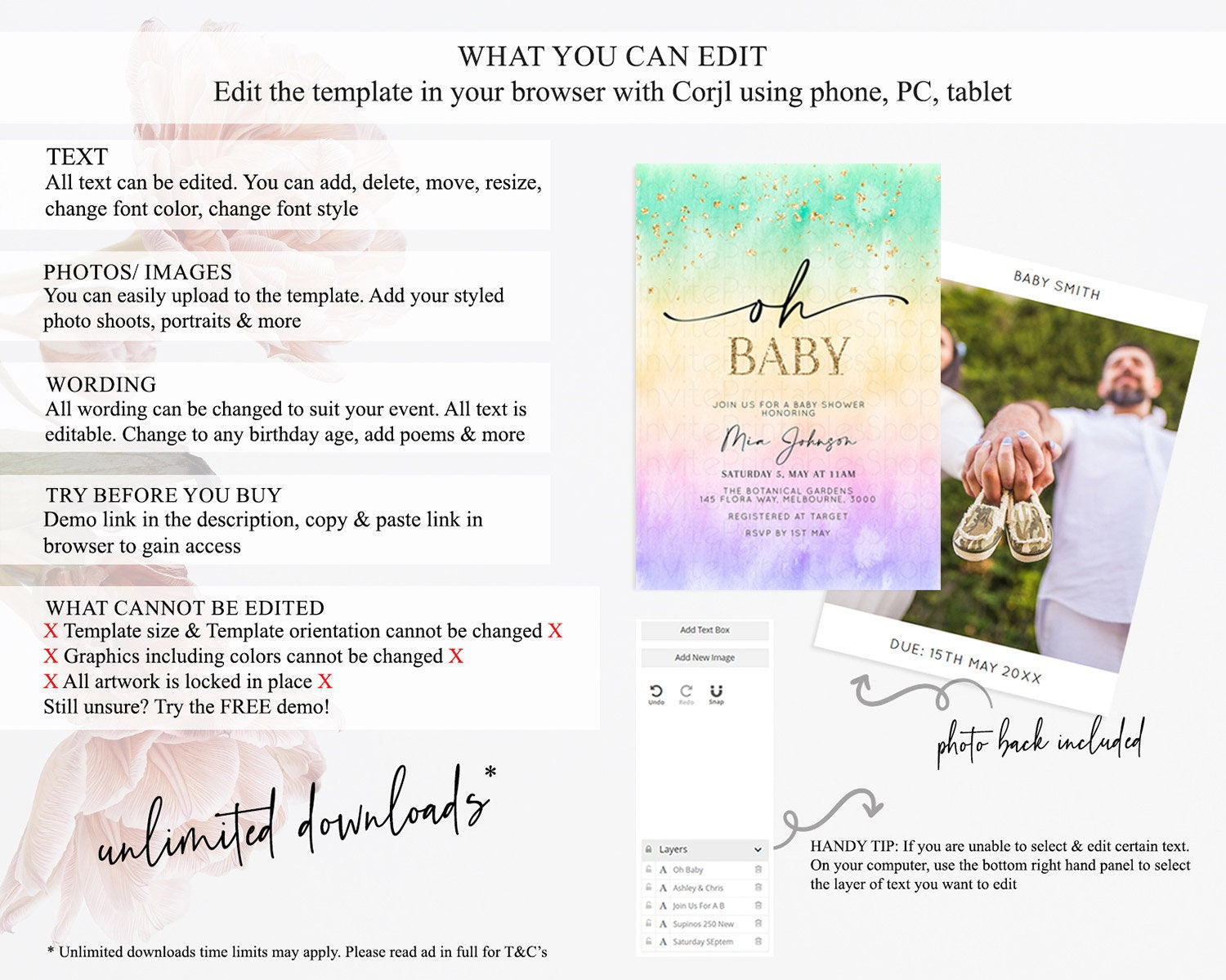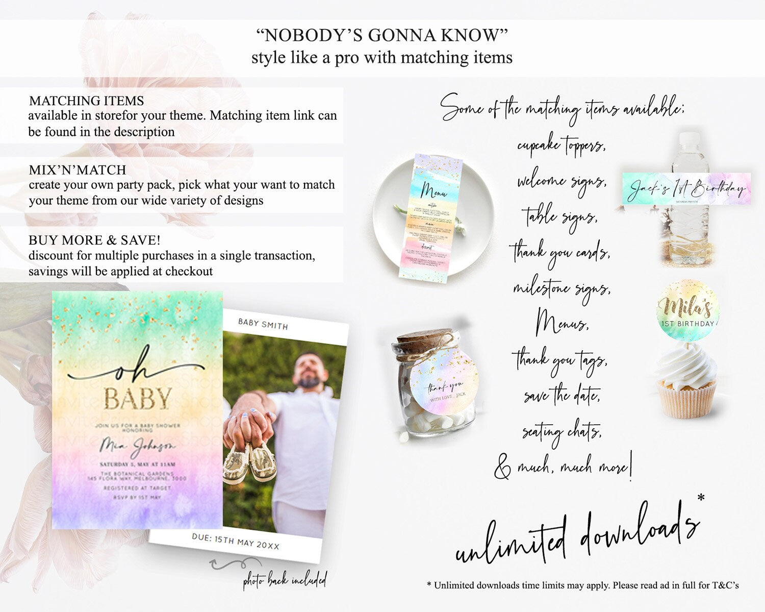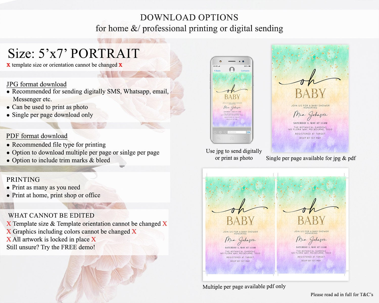 Pastel Baby Shower Invitation Rainbow Baby Shower Invitation Colorful Pastel Watercolor Invitation Gold Glitter Sprinkles Ombre D10481