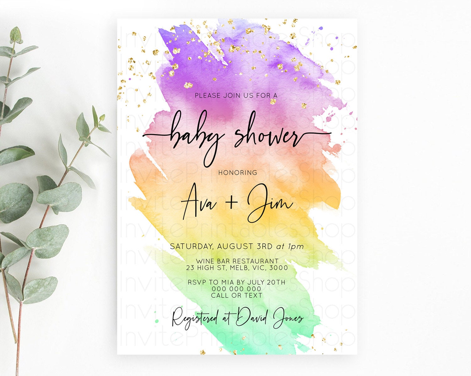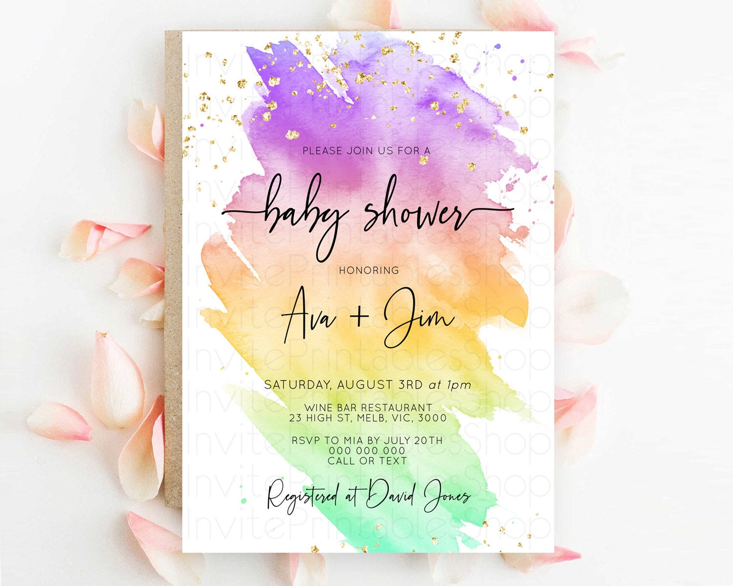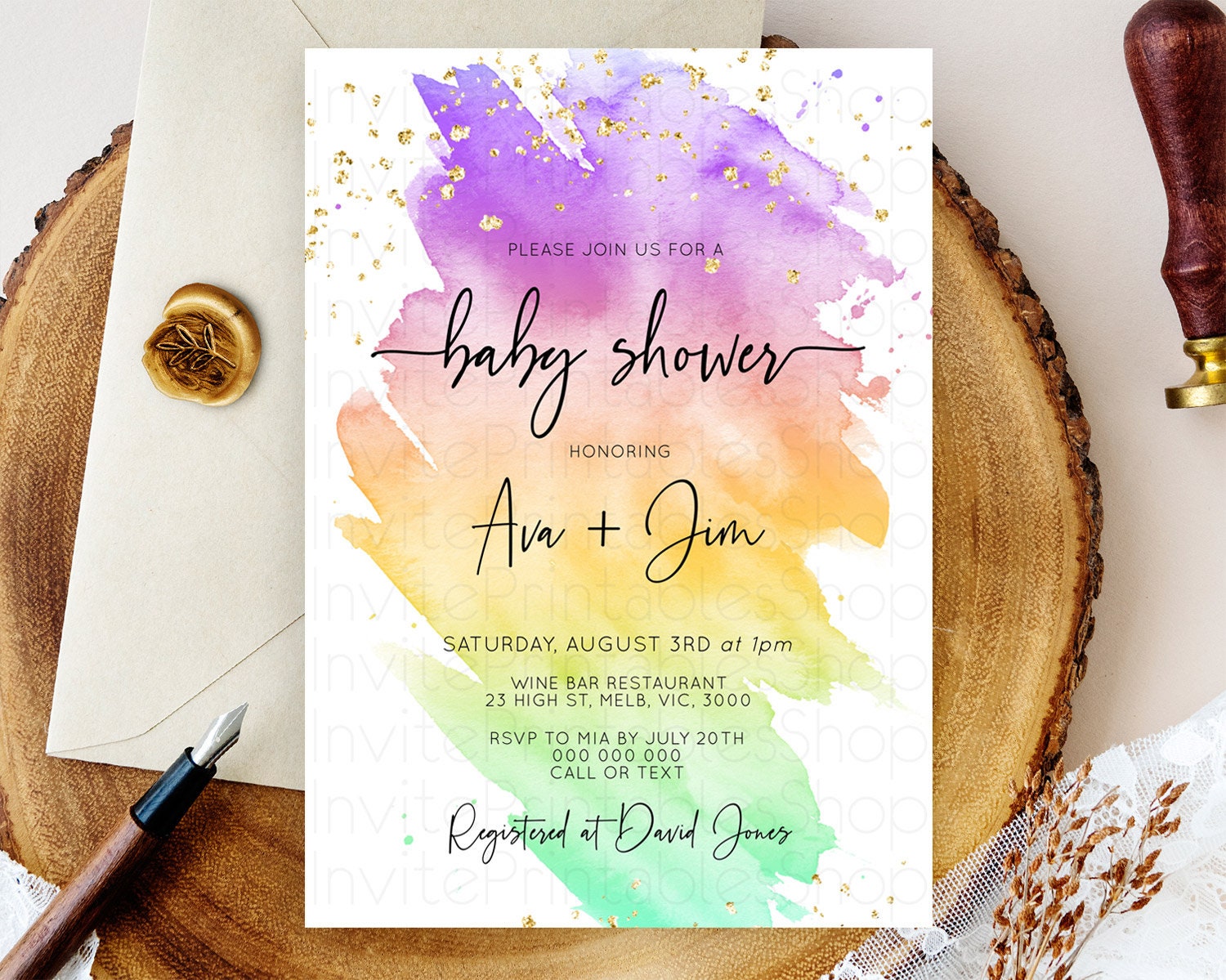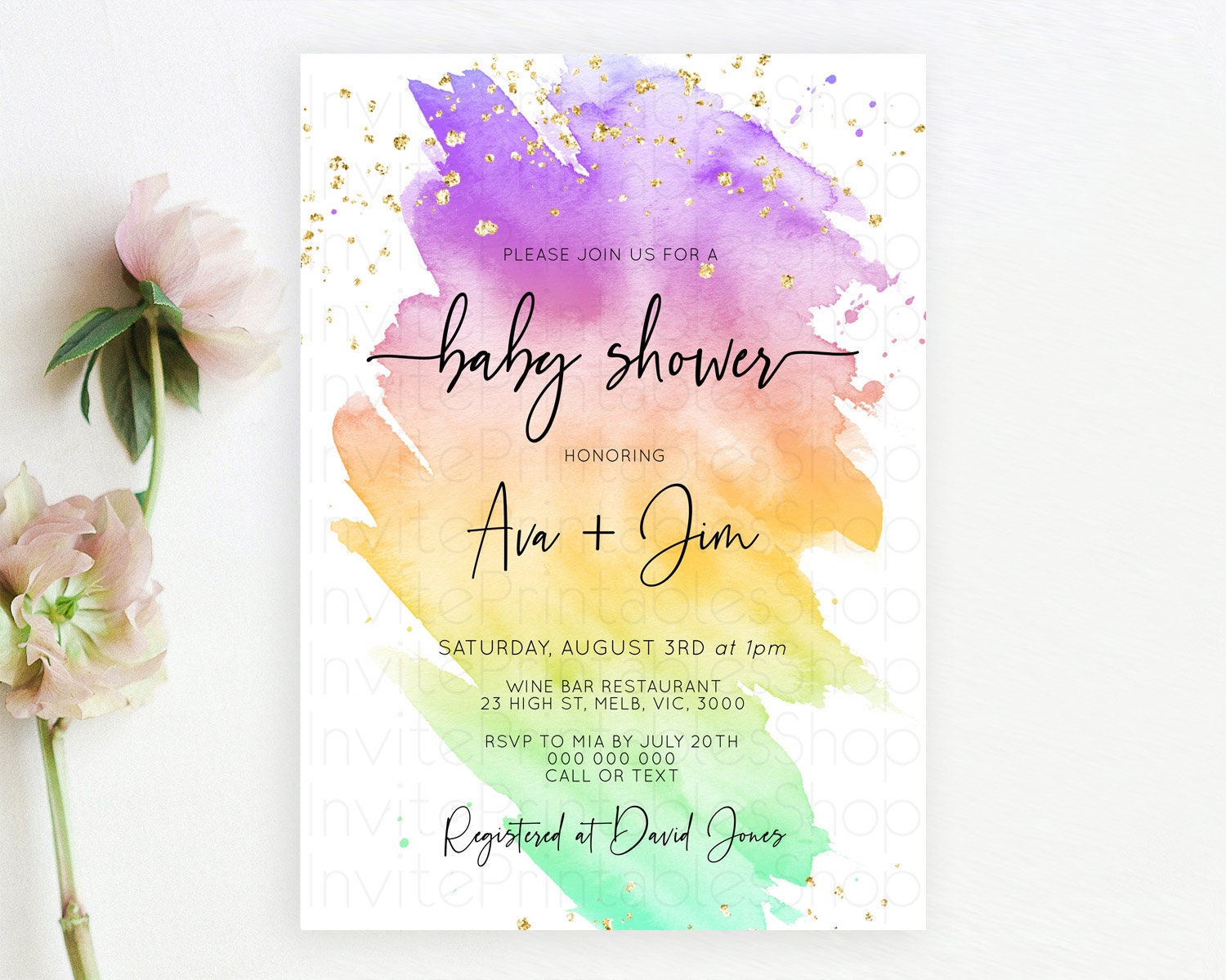 Pastel Baby Shower Invitation Rainbow Baby Shower Invitation Colorful Pastel Watercolor Invitation Gold Glitter Sprinkles Ombre D10518