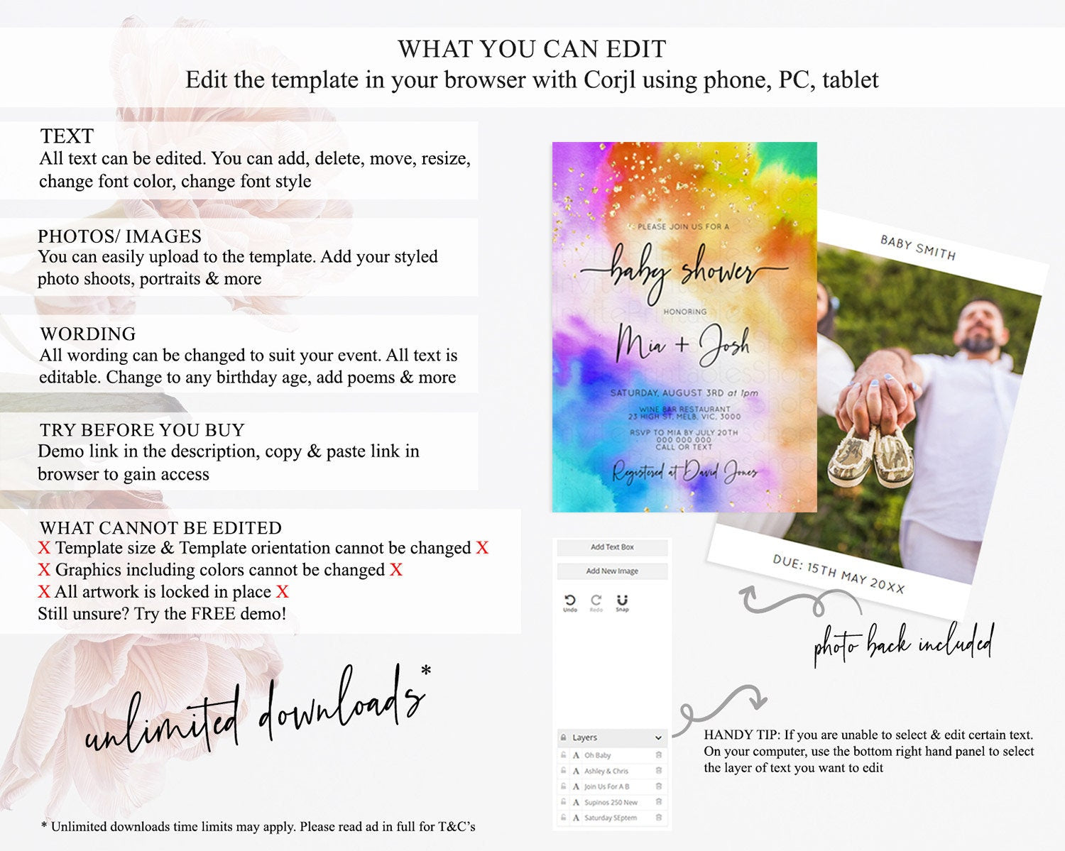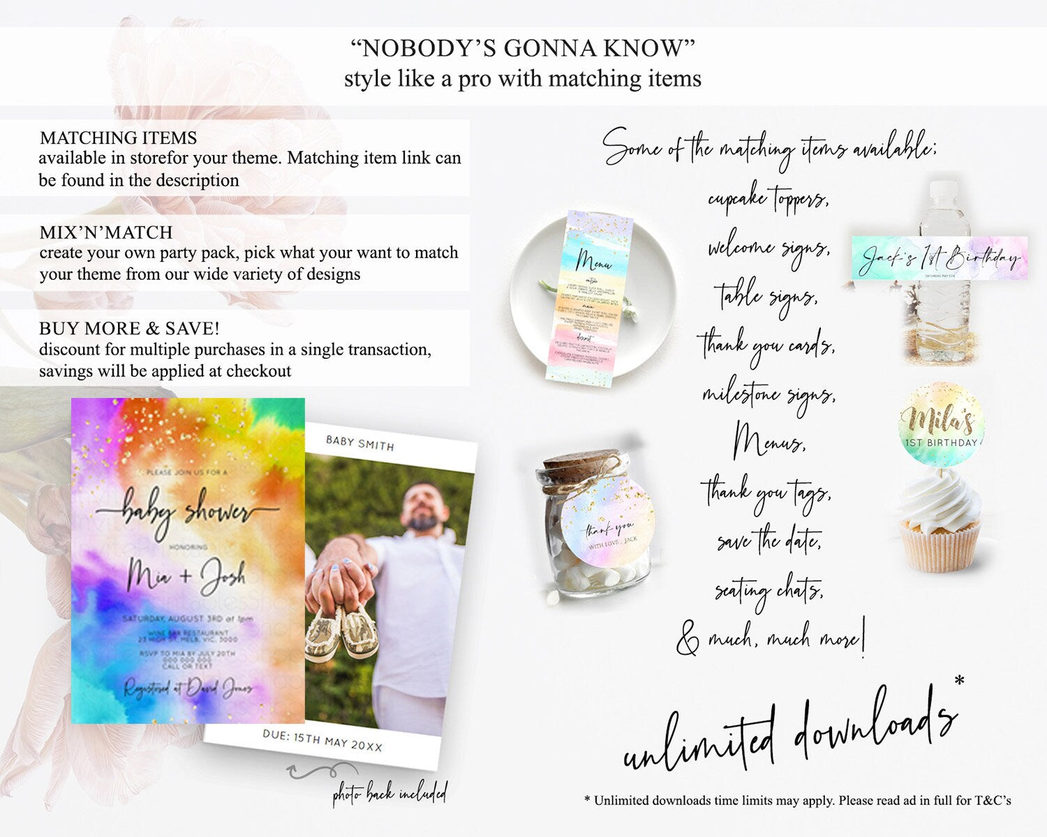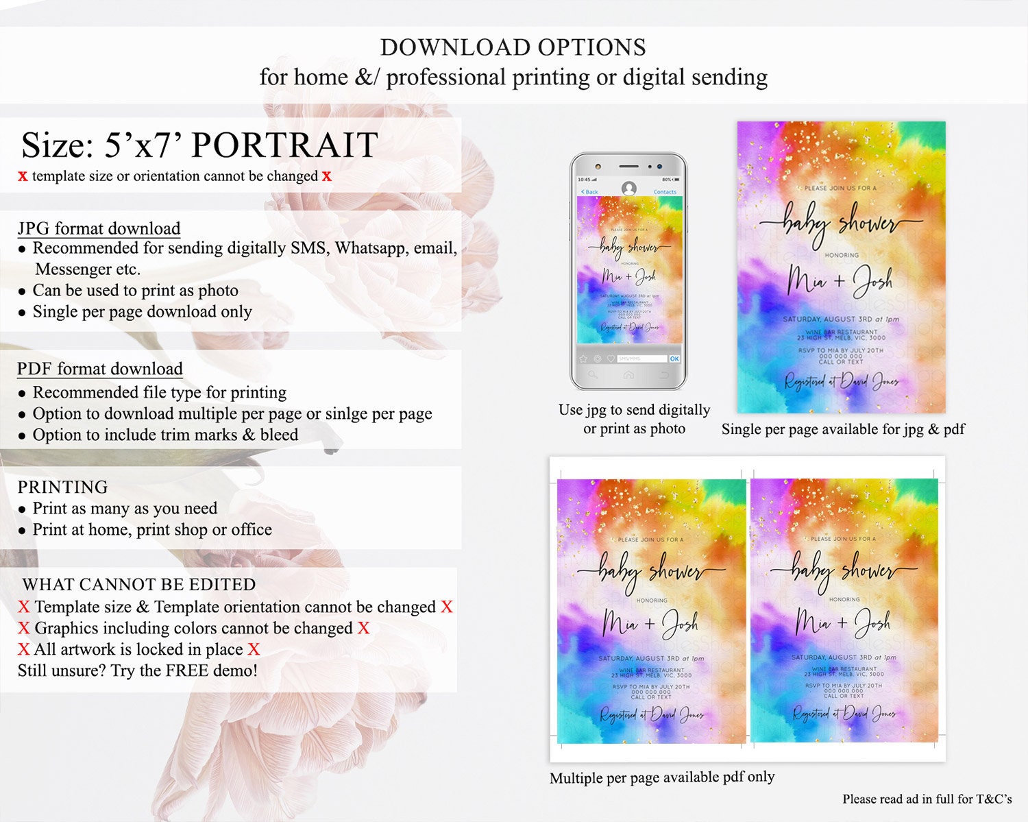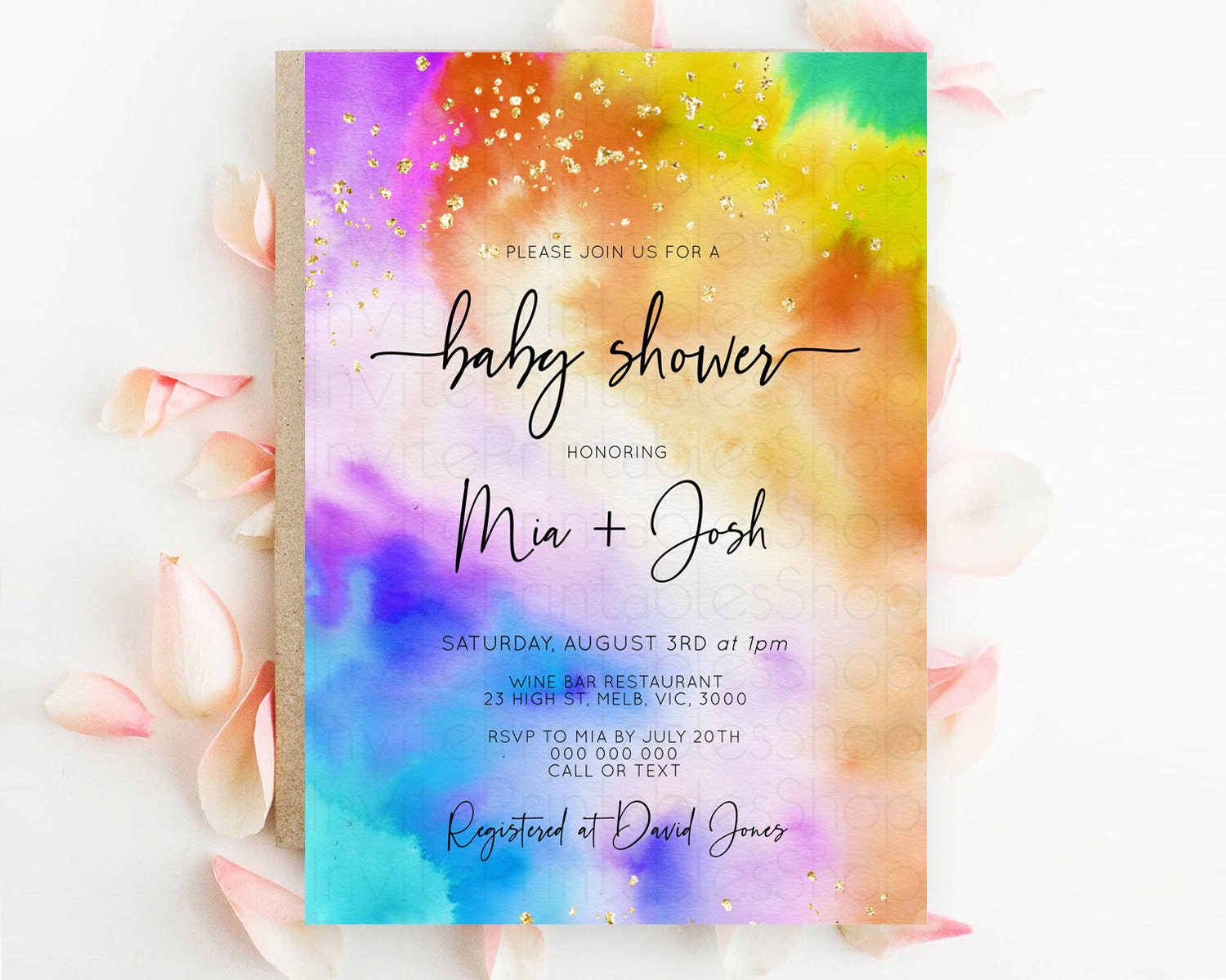 Pastel Baby Shower Invitation Rainbow Baby Shower Invitation Colorful Pastel Watercolor Invitation Gold Glitter Sprinkles Ombre D10530