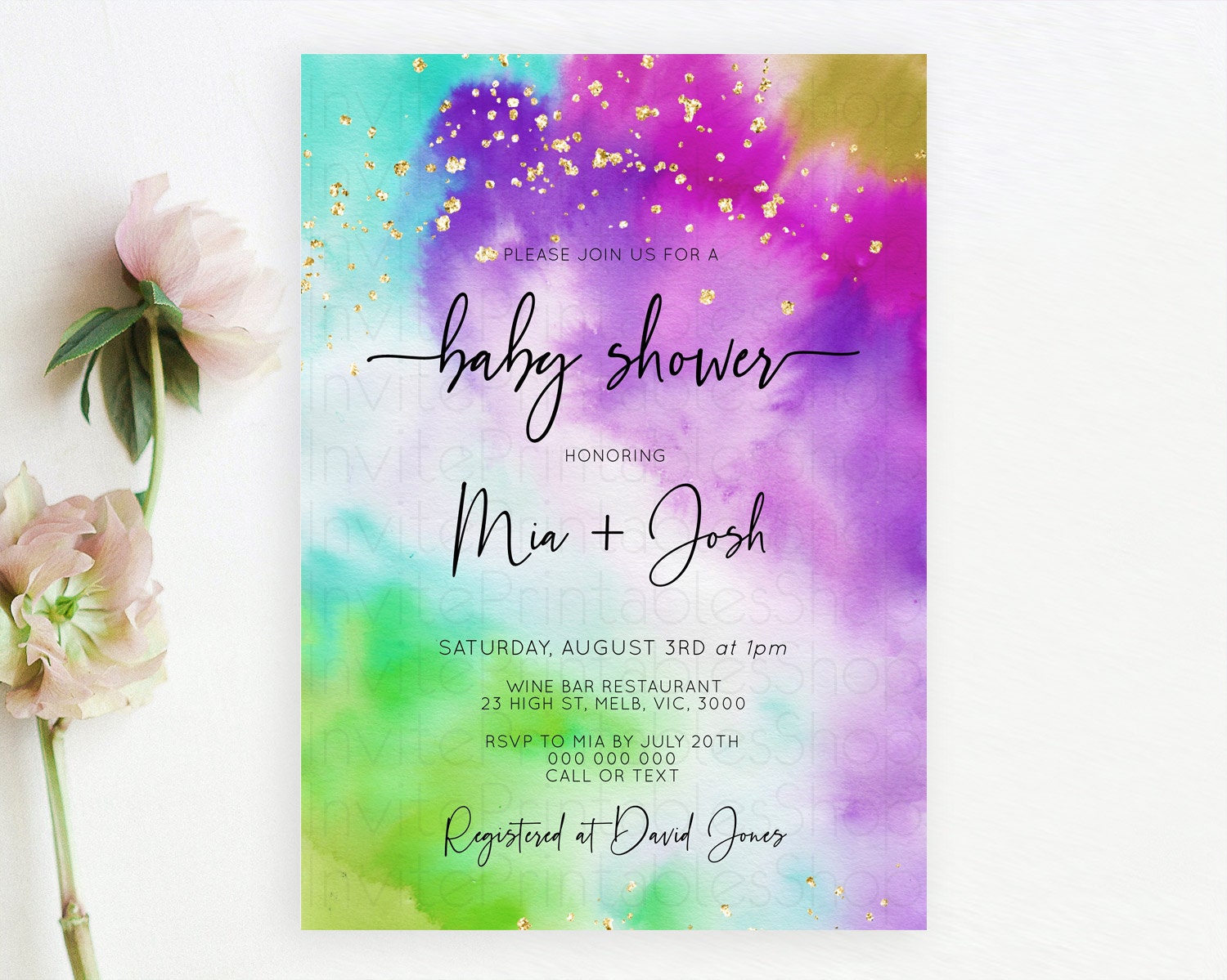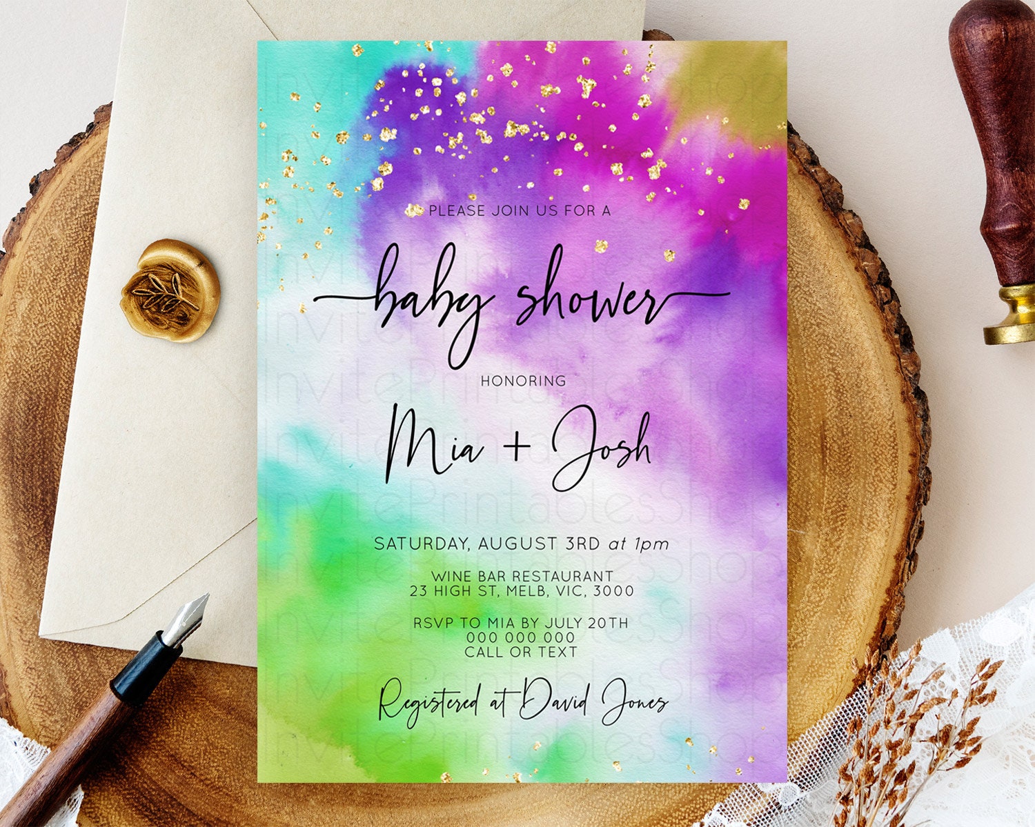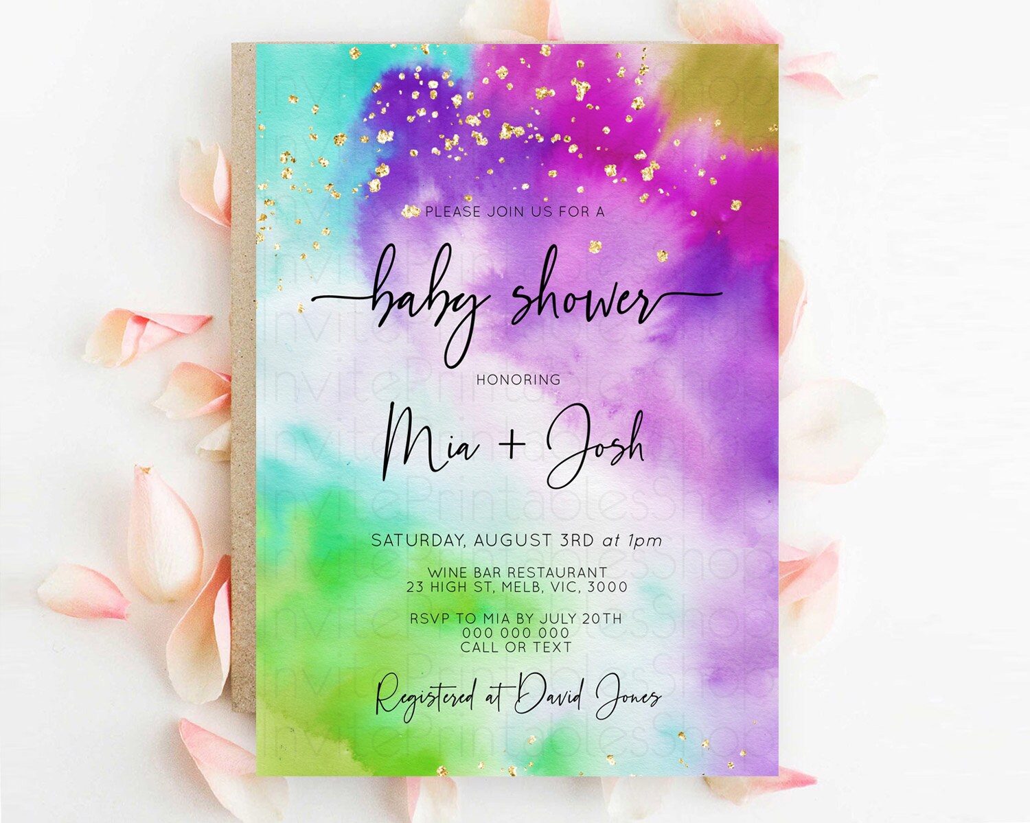 Pastel Baby Shower Invitation Rainbow Baby Shower Invitation Colorful Pastel Watercolor Invitation Gold Glitter Sprinkles Ombre D10536