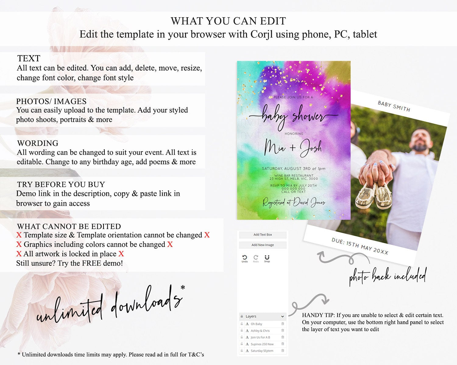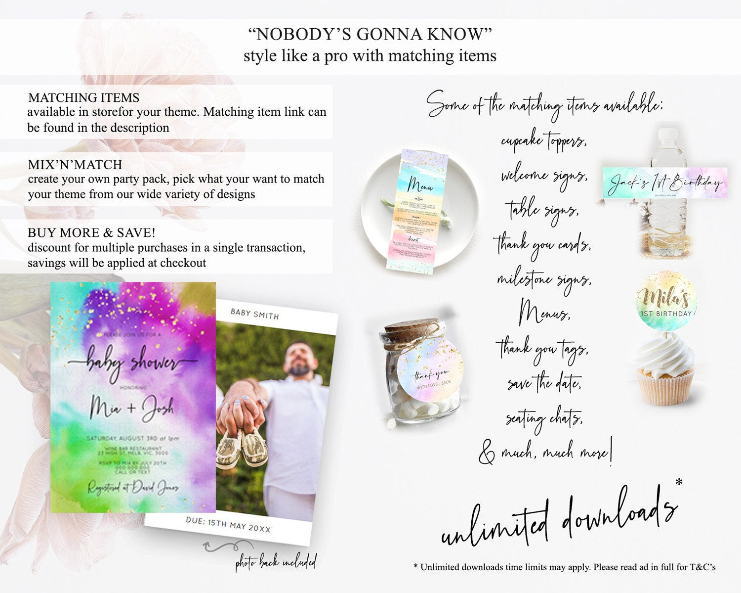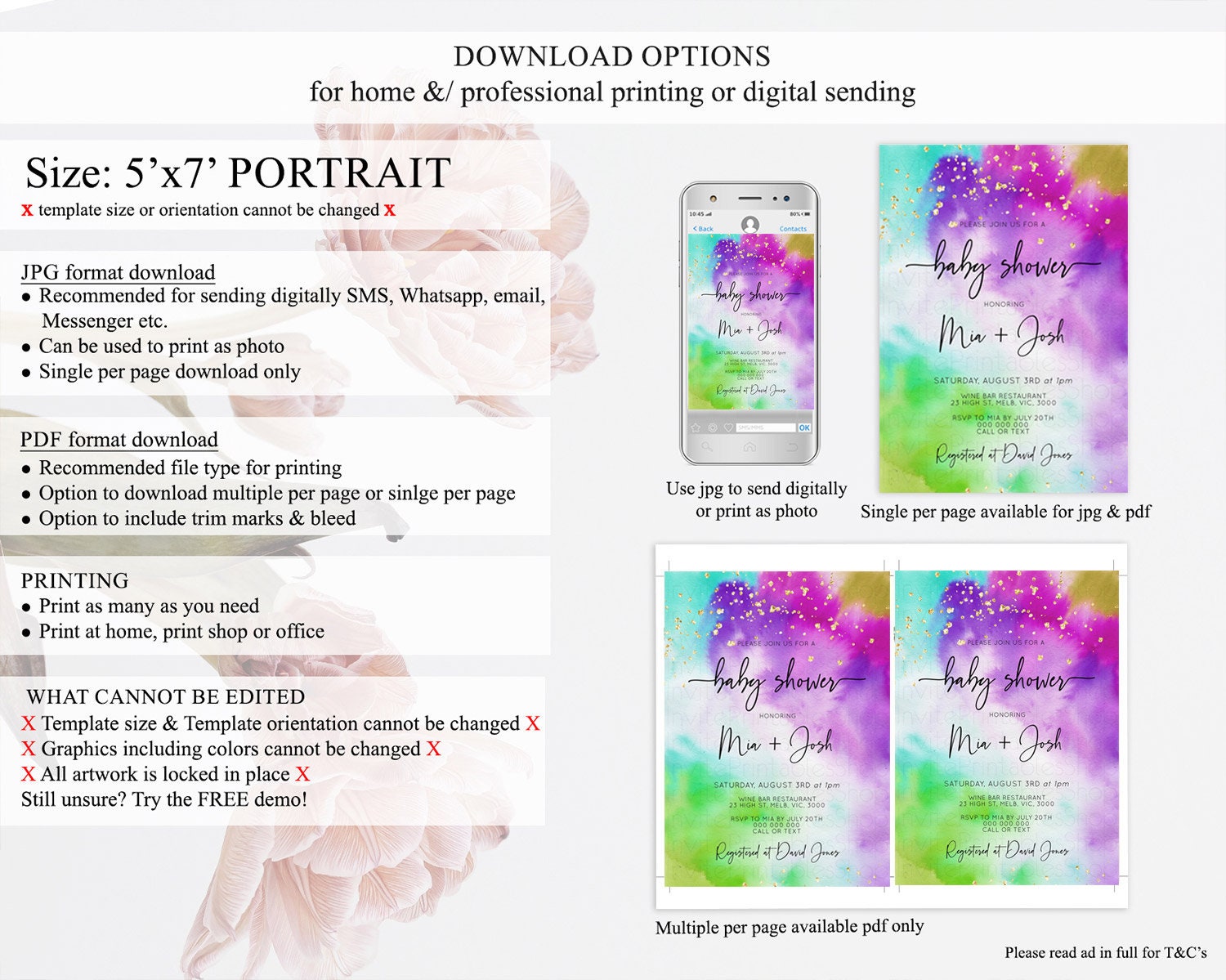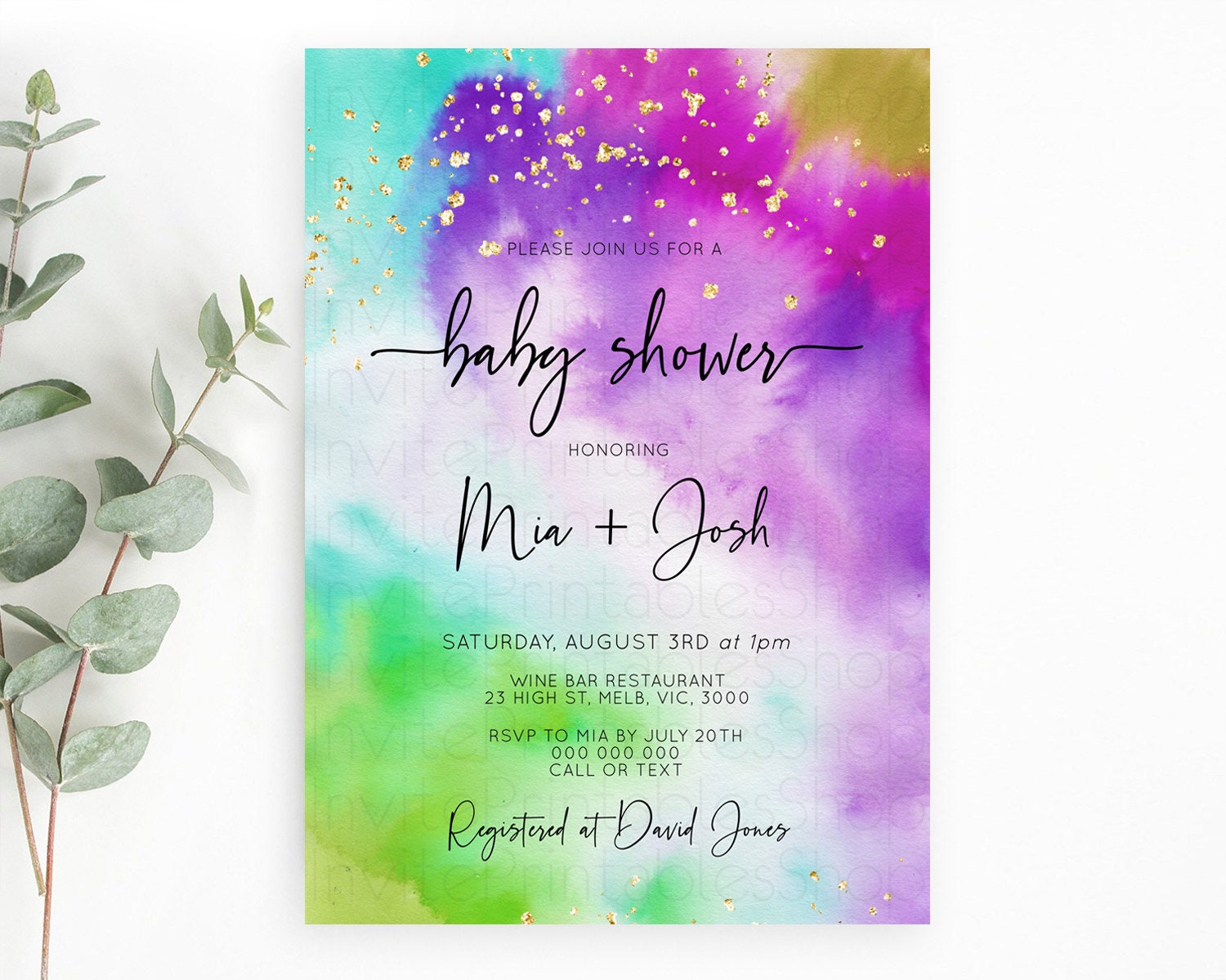 Pastel Baby Shower Invitation Rainbow Baby Shower Invitation Colorful Pastel Watercolor Invitation Gold Glitter Sprinkles Ombre D10536