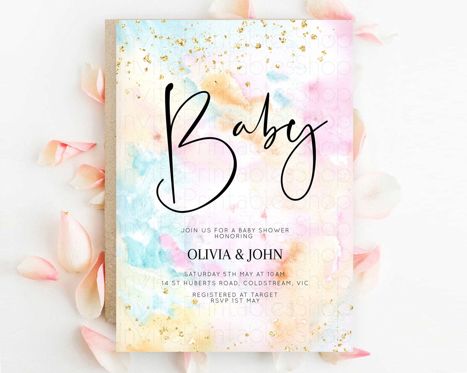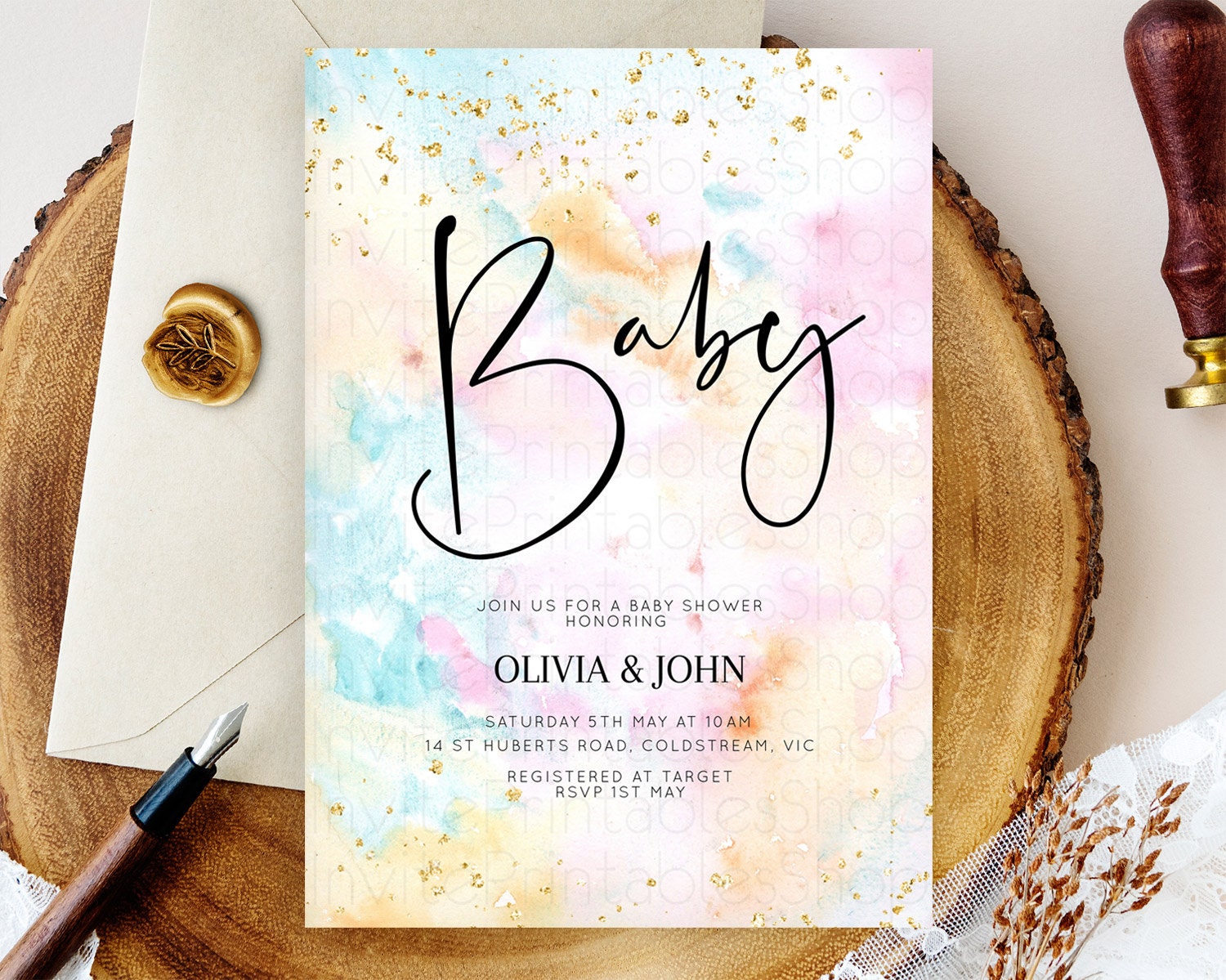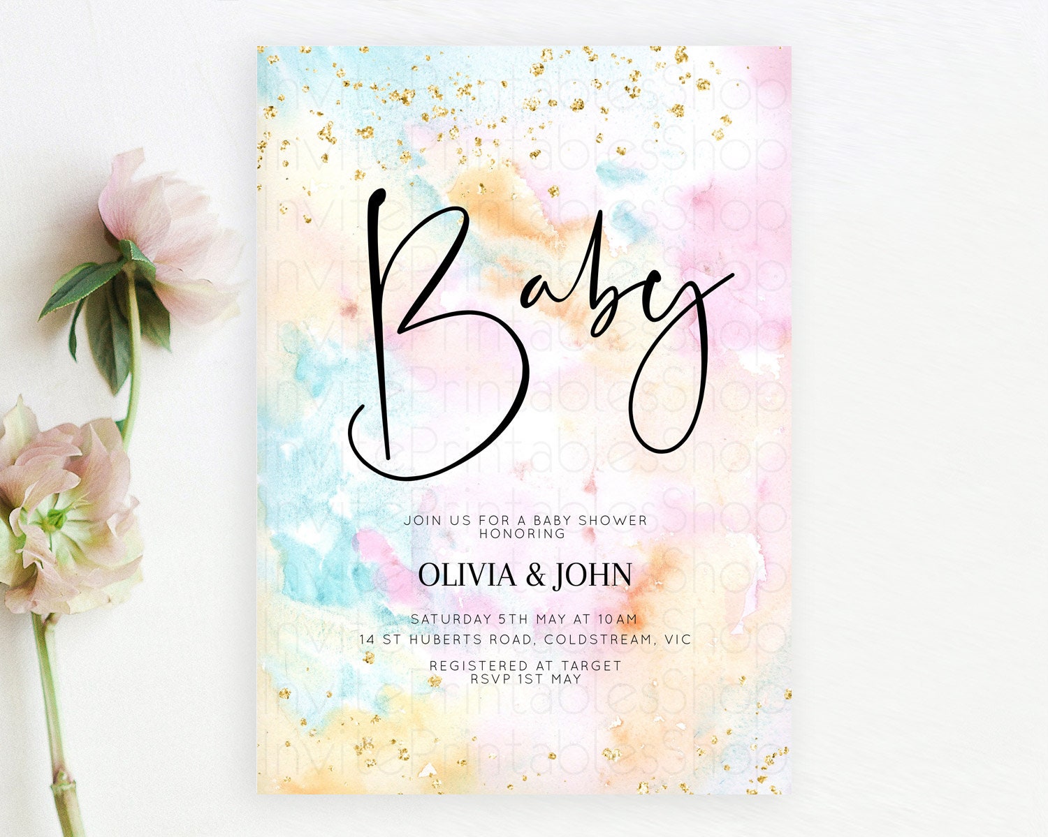Pastel Baby Shower Invitation Rainbow Baby Shower Invitation Colorful Pastel Watercolor Invitation Gold Glitter Sprinkles Ombre D10548
