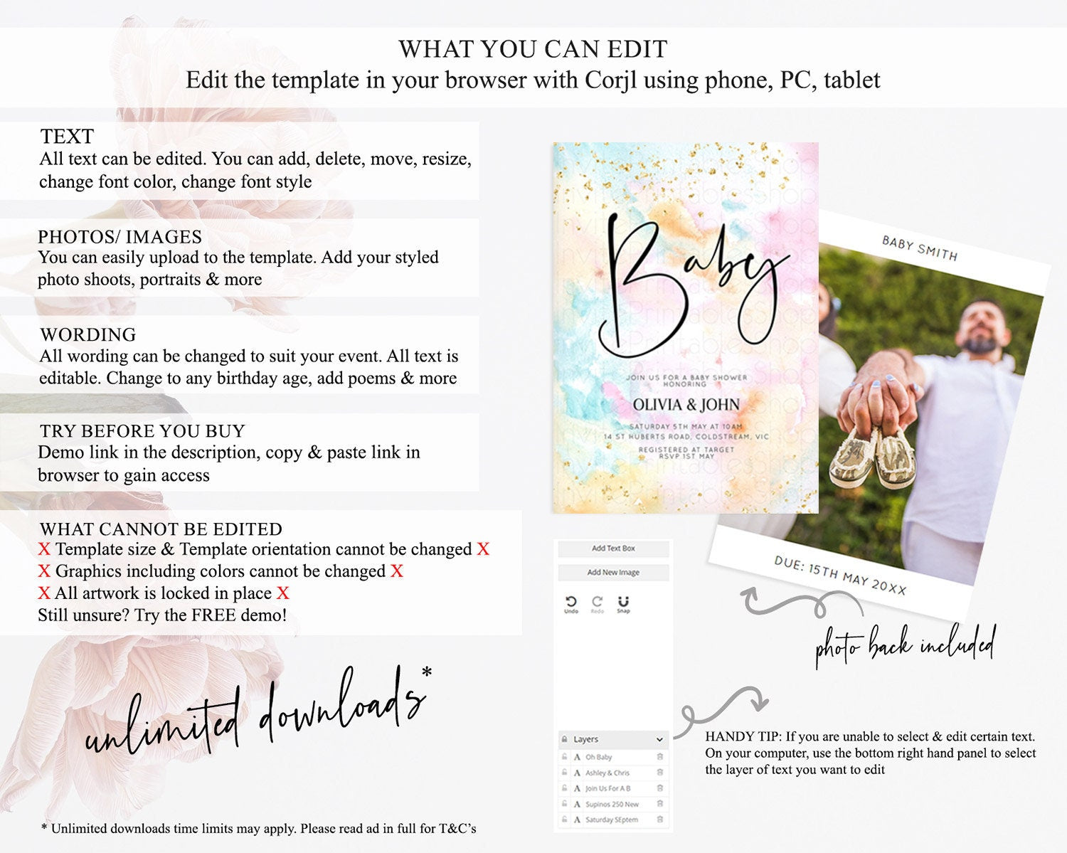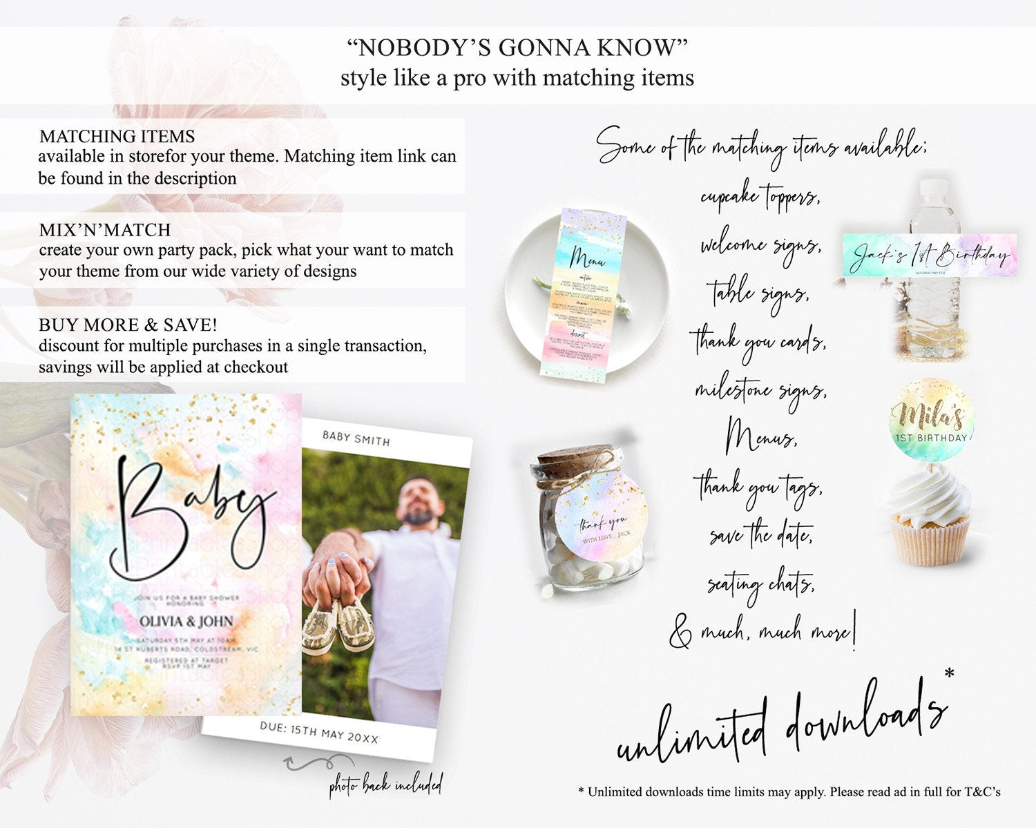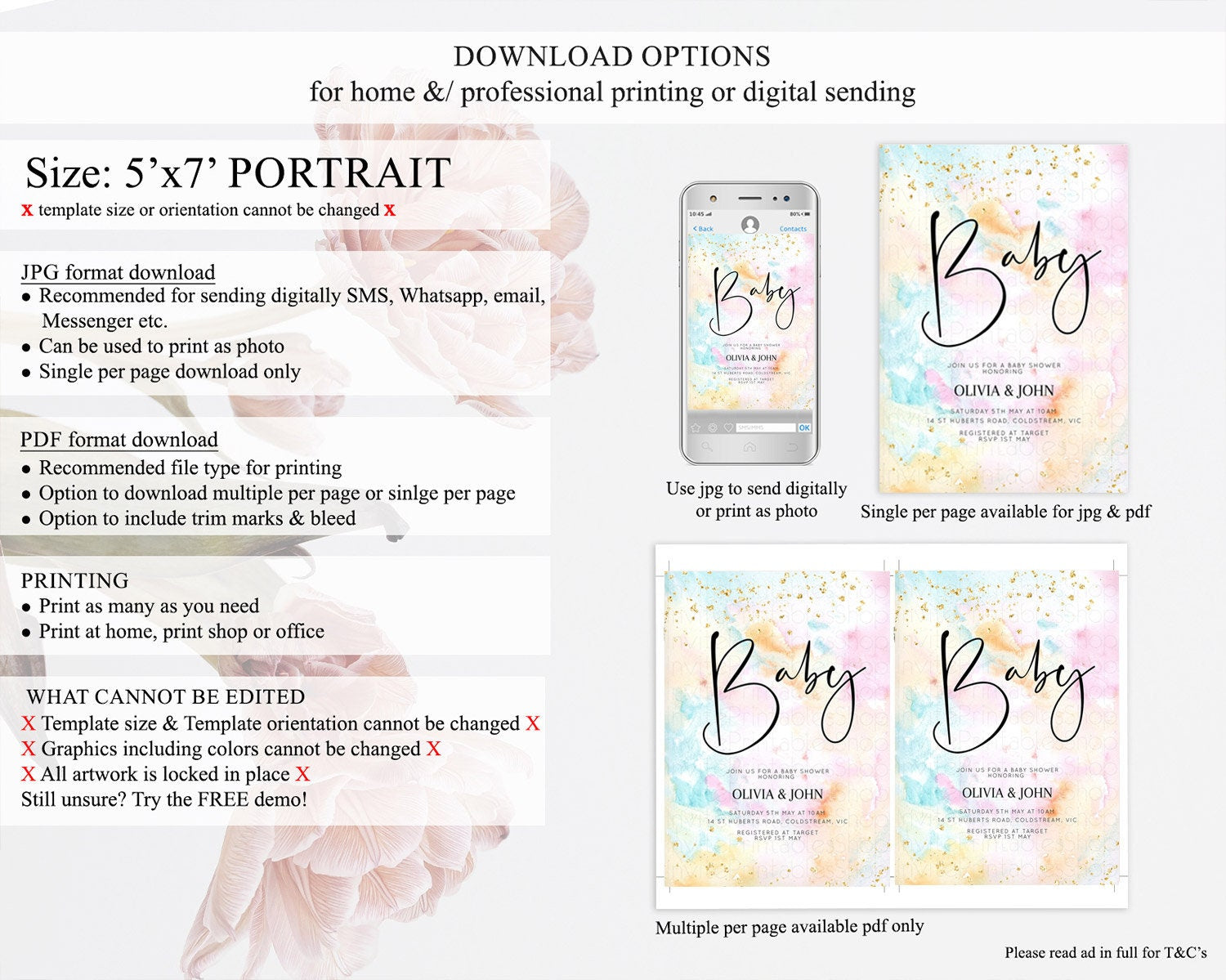 Pastel Baby Shower Invitation Rainbow Baby Shower Invitation Colorful Pastel Watercolor Invitation Gold Glitter Sprinkles Ombre D10548