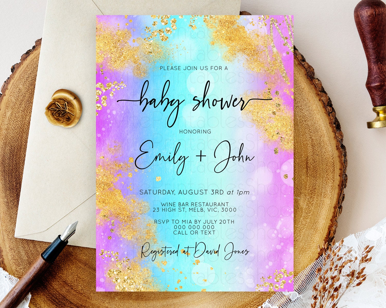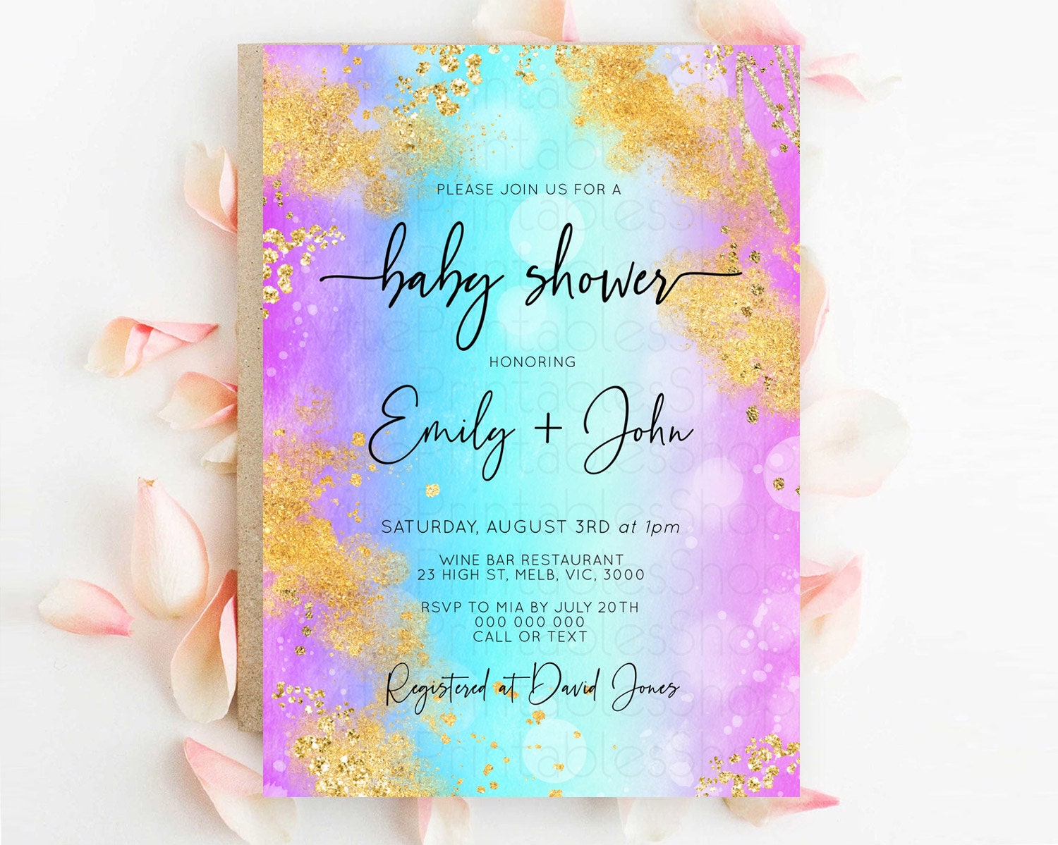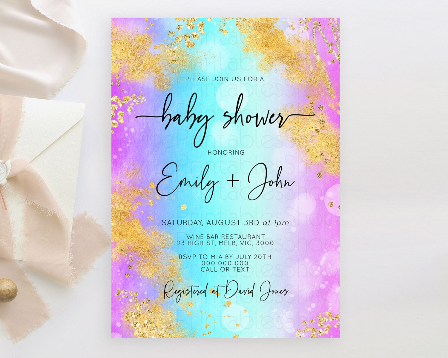Pastel Baby Shower Invitation Rainbow Baby Shower Invitation Colorful Pastel Watercolor Invitation Gold Glitter Sprinkles Ombre D10564