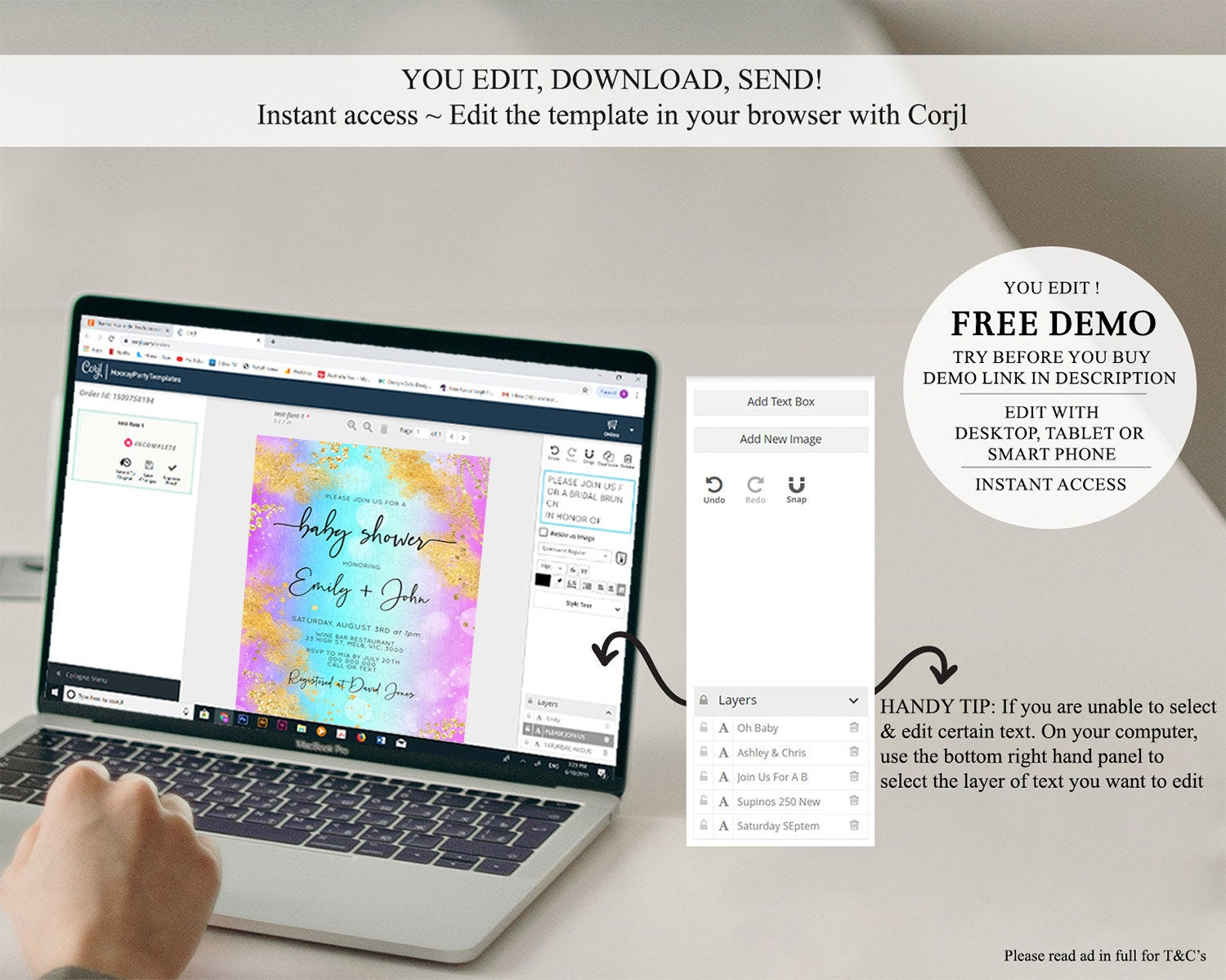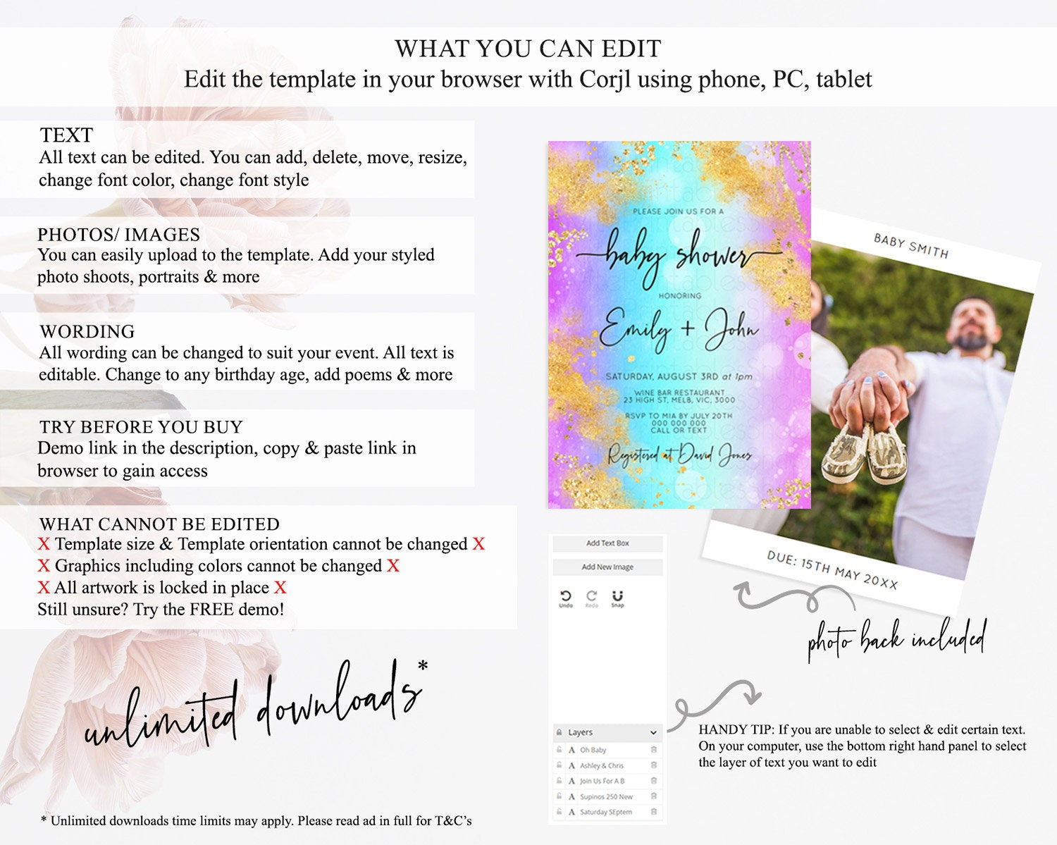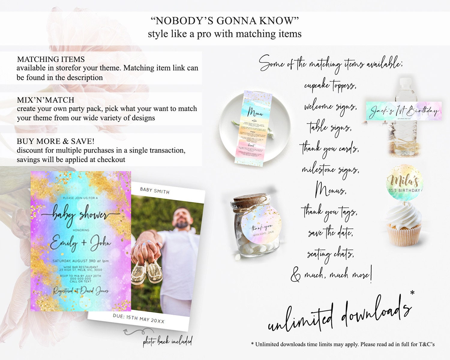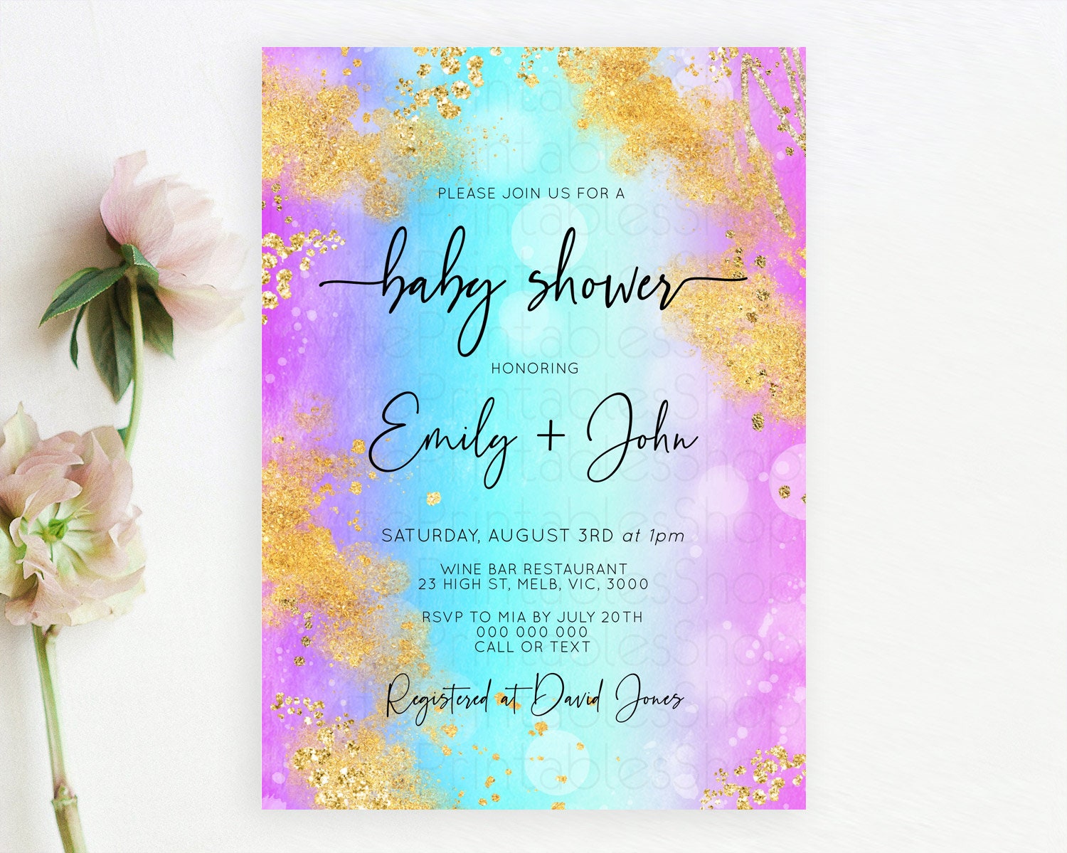 Pastel Baby Shower Invitation Rainbow Baby Shower Invitation Colorful Pastel Watercolor Invitation Gold Glitter Sprinkles Ombre D10564