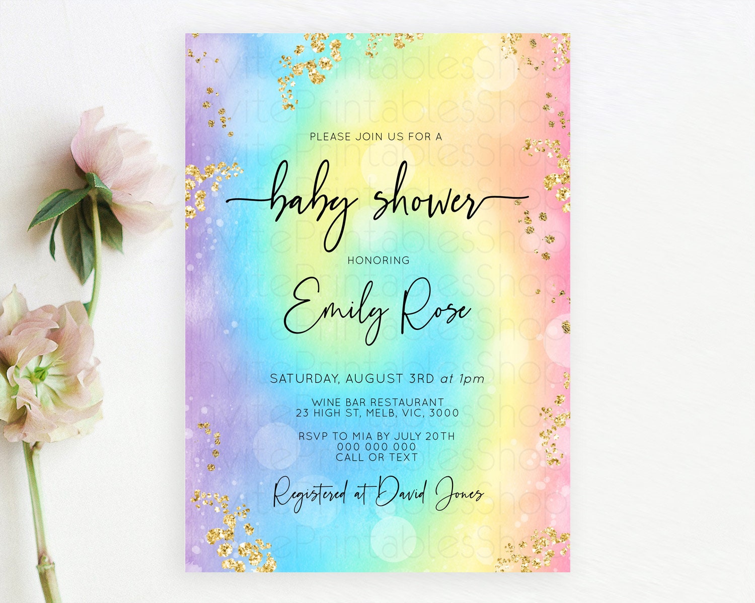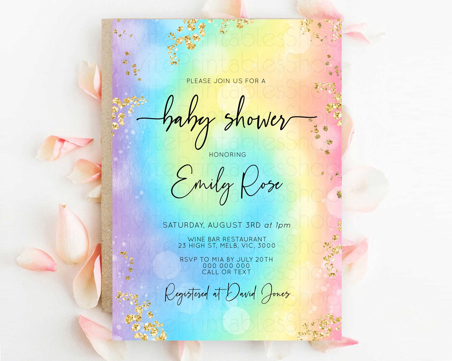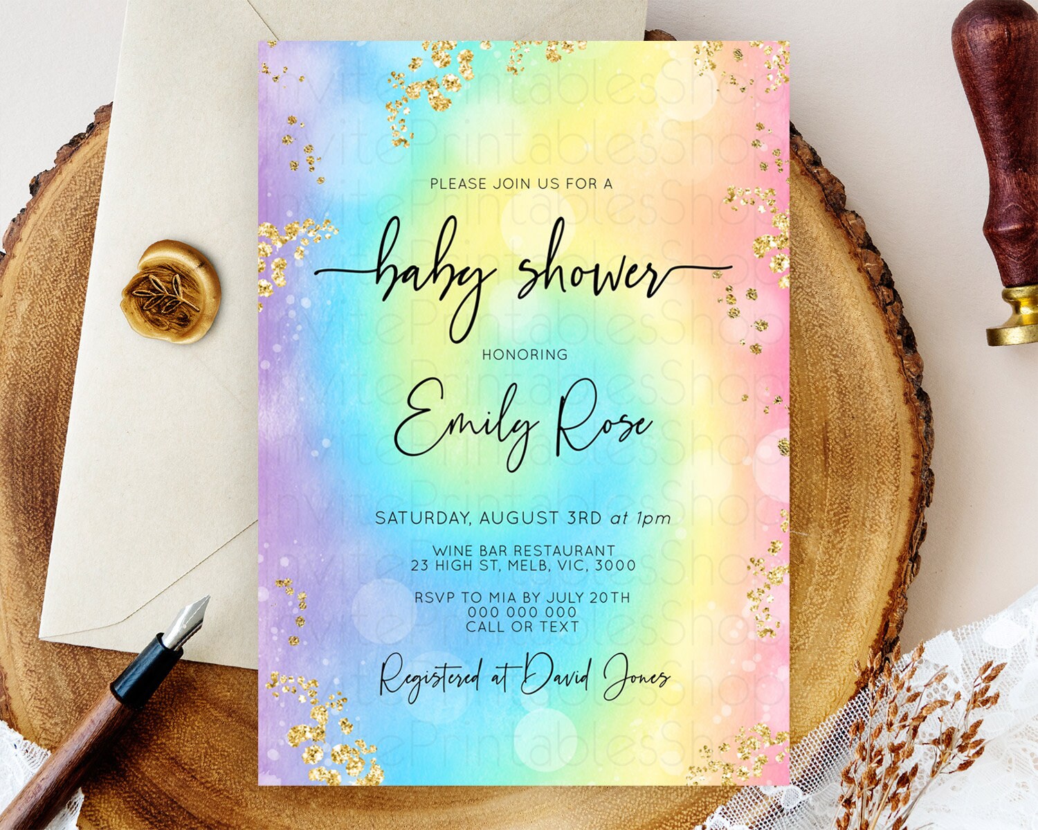 Pastel Baby Shower Invitation Rainbow Baby Shower Invitation Colorful Pastel Watercolor Invitation Gold Glitter Sprinkles Ombre D10568