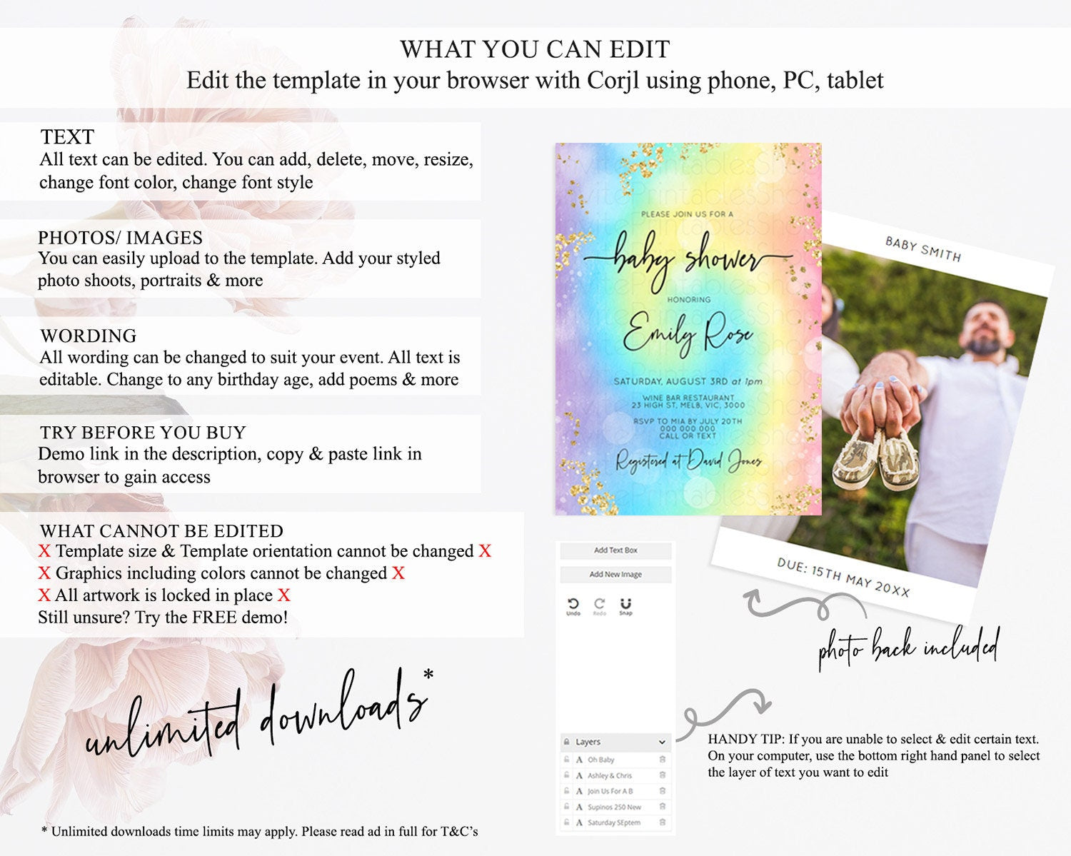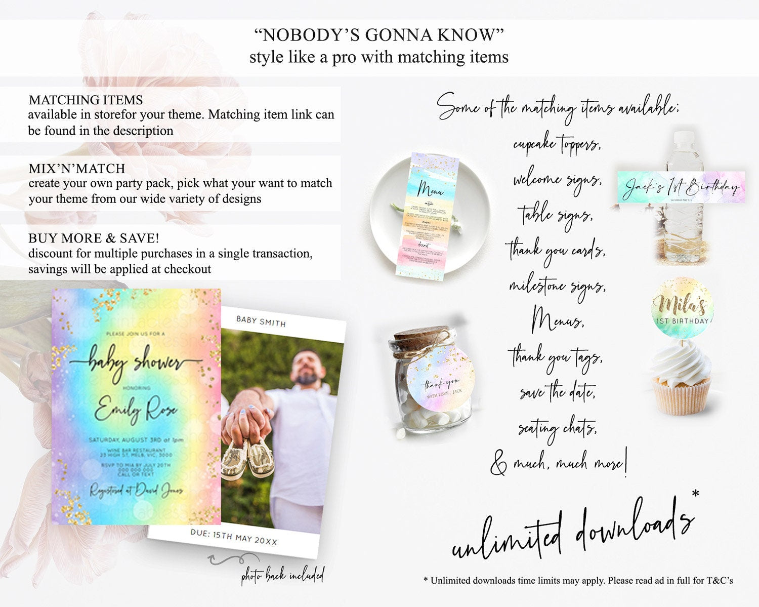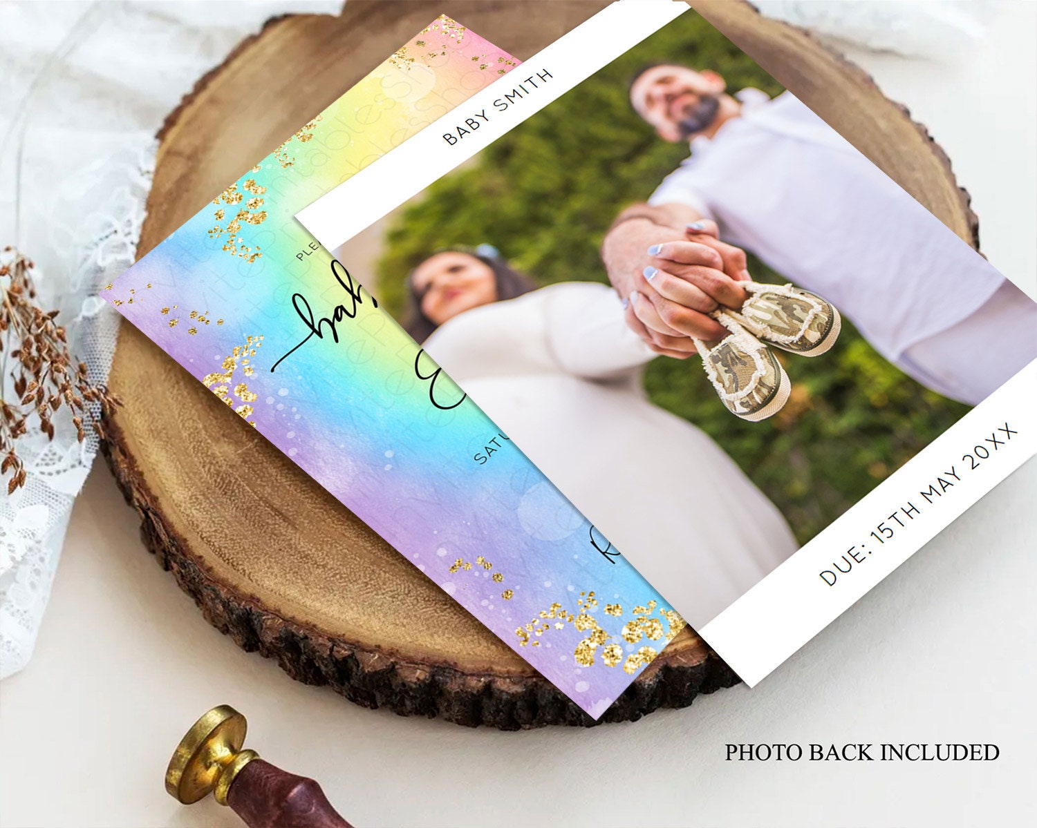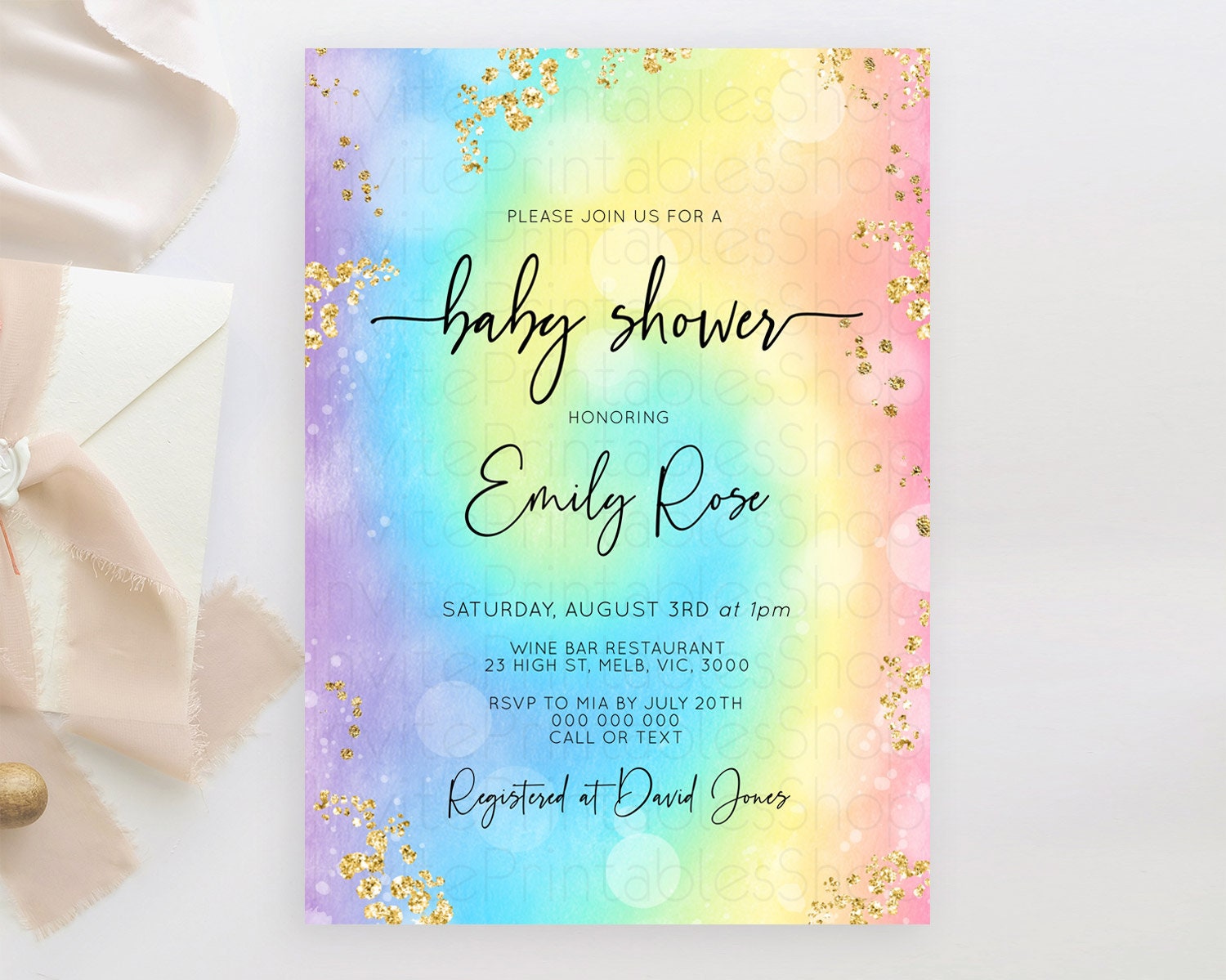 Pastel Baby Shower Invitation Rainbow Baby Shower Invitation Colorful Pastel Watercolor Invitation Gold Glitter Sprinkles Ombre D10568