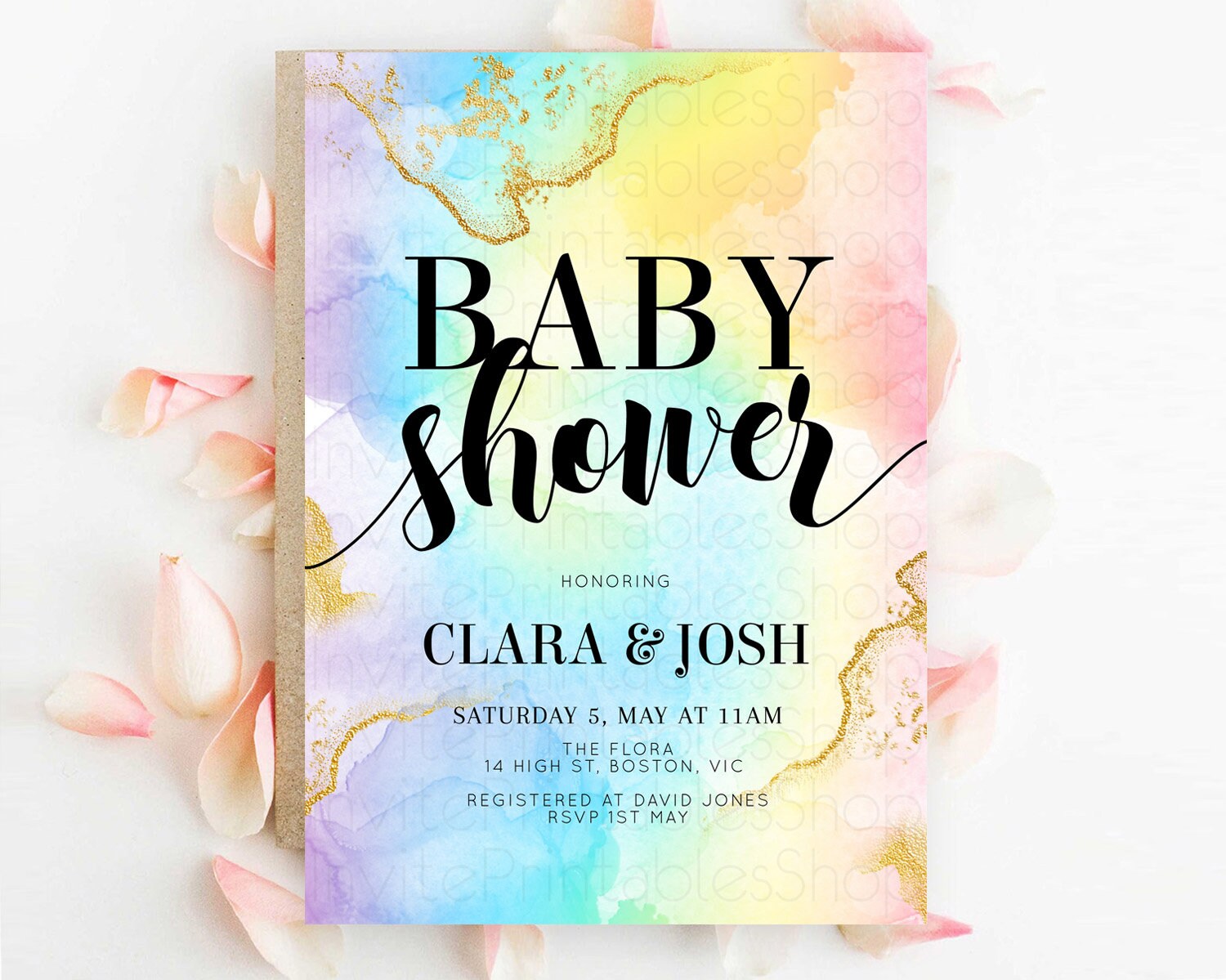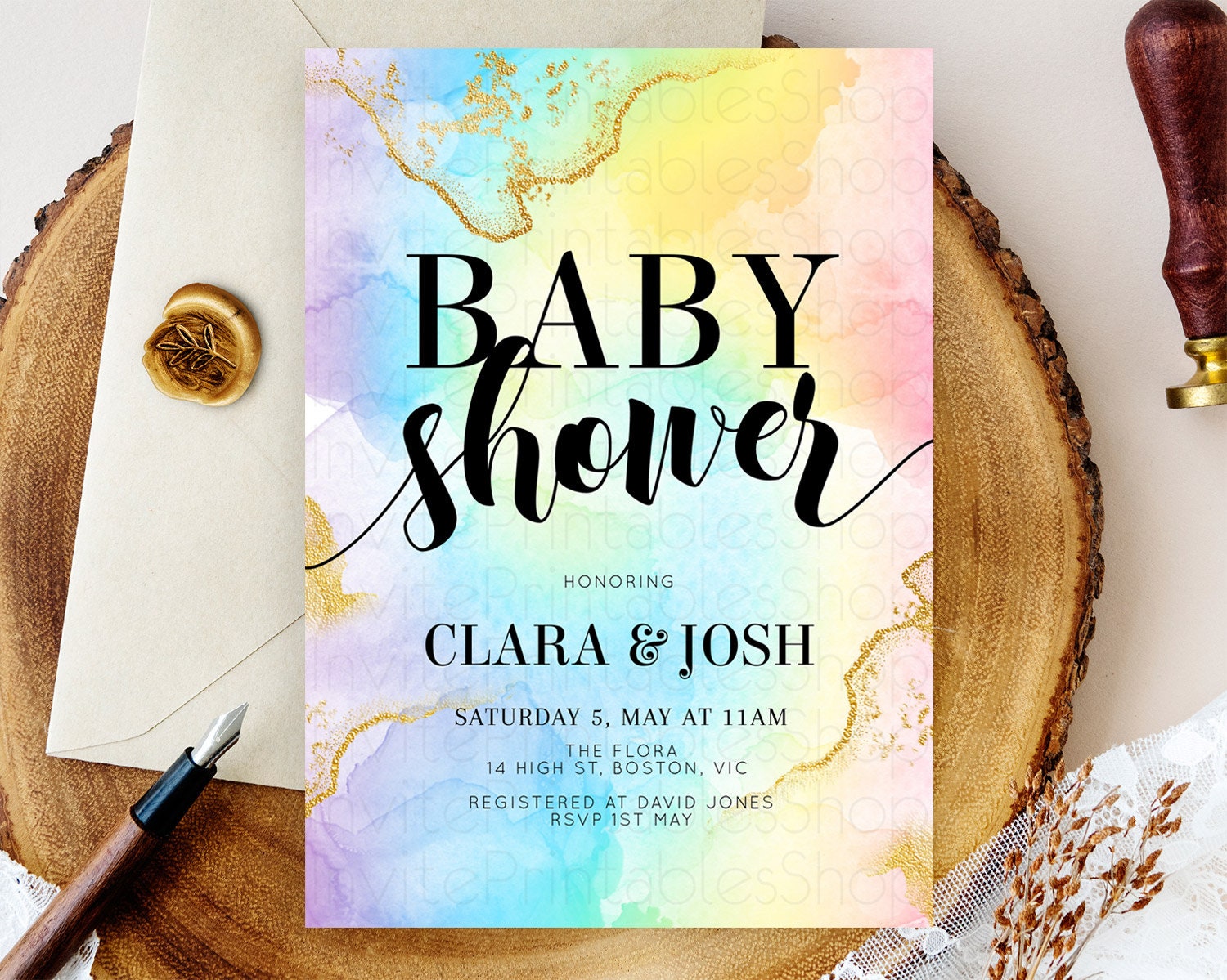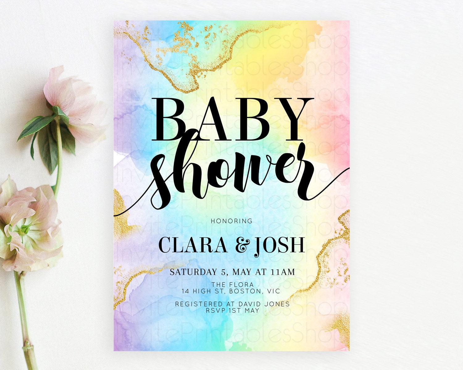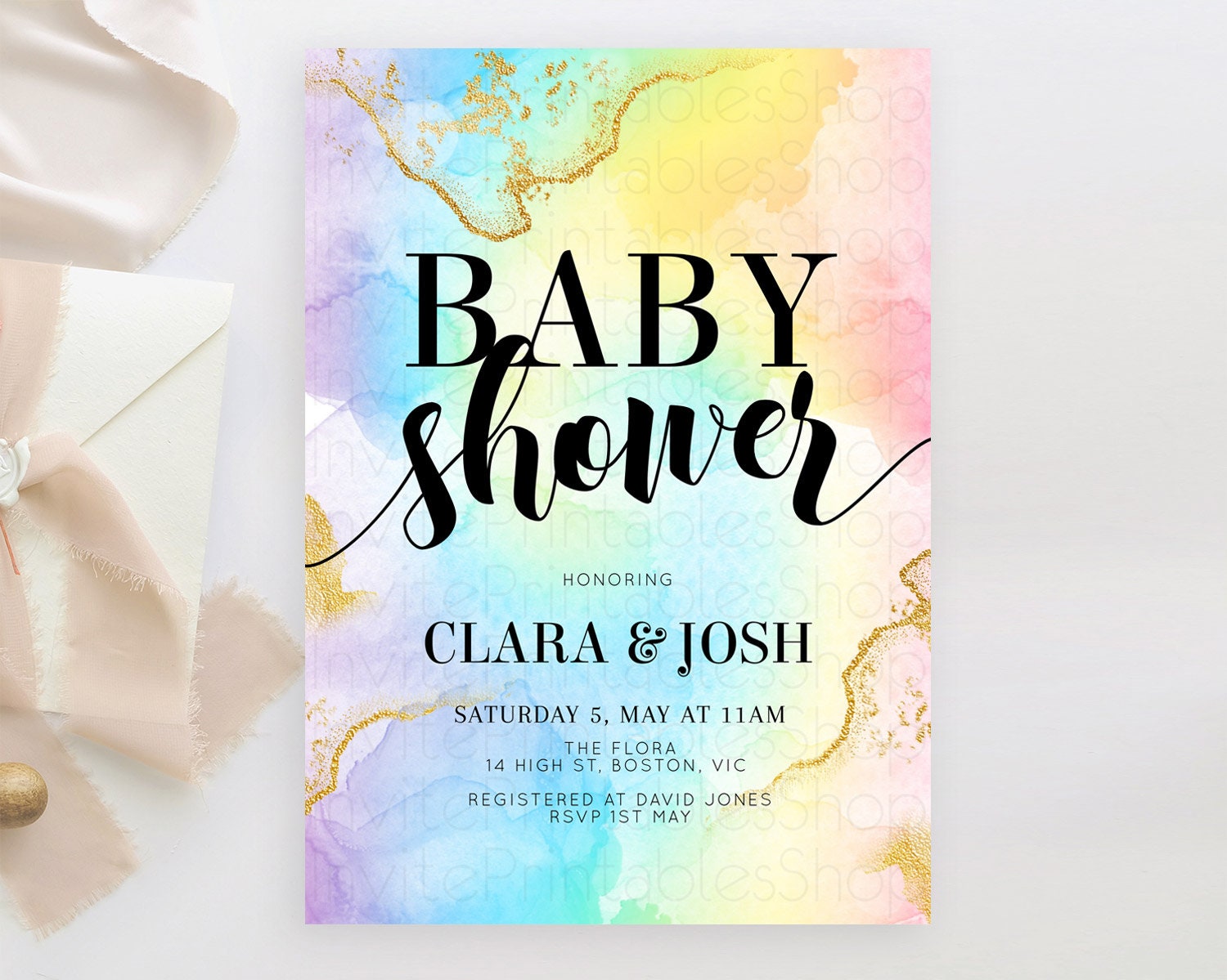 Pastel Baby Shower Invitation Rainbow Baby Shower Invitation Colorful Pastel Watercolor Invitation Gold Glitter Sprinkles Ombre D10589
