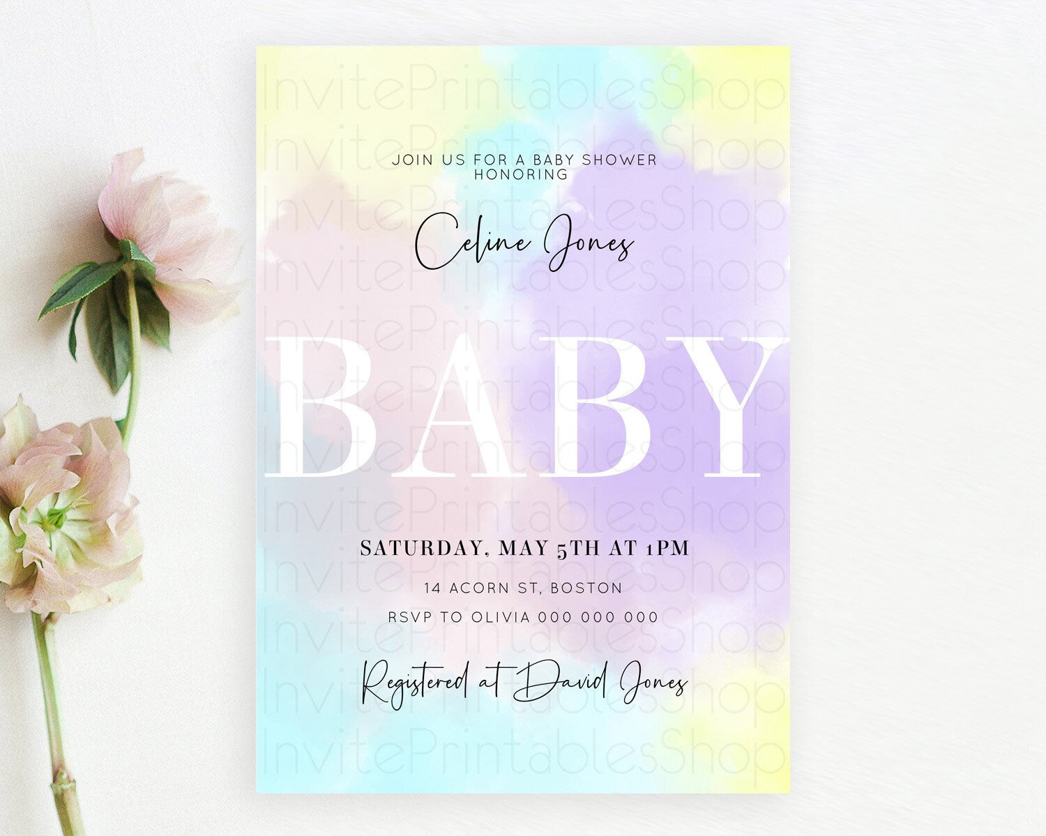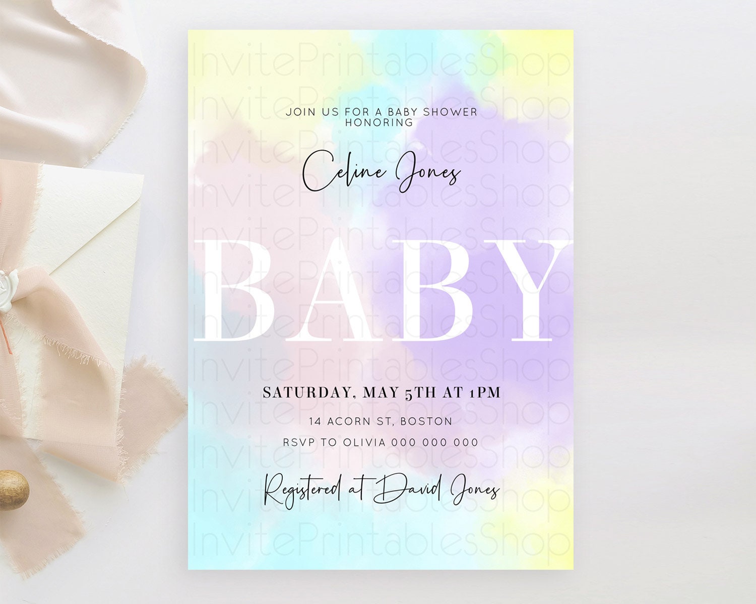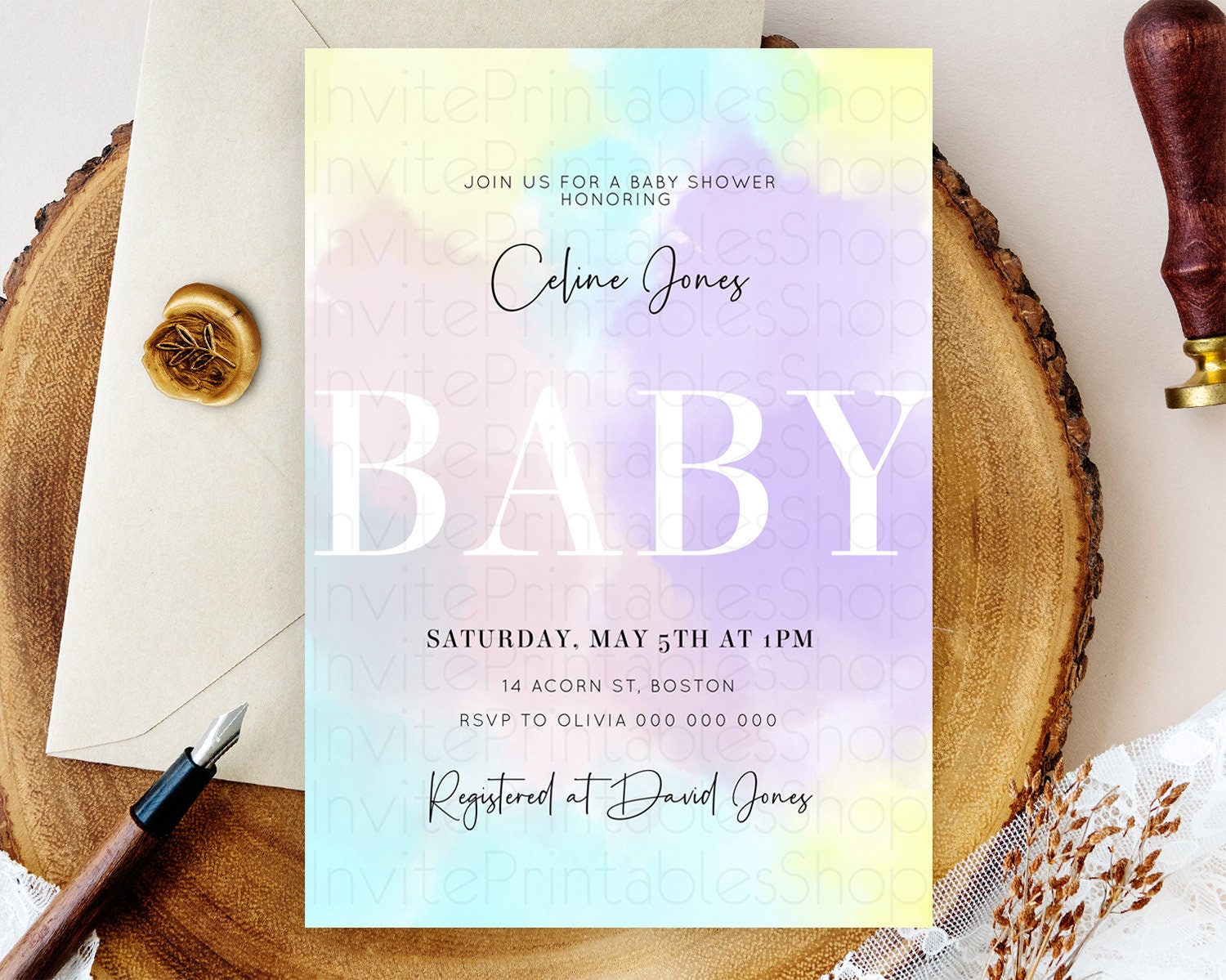 Pastel Baby Shower Invitation Rainbow Baby Shower Invitation Colorful Pastel Watercolor Invitation Gold Glitter Sprinkles Ombre D10617
