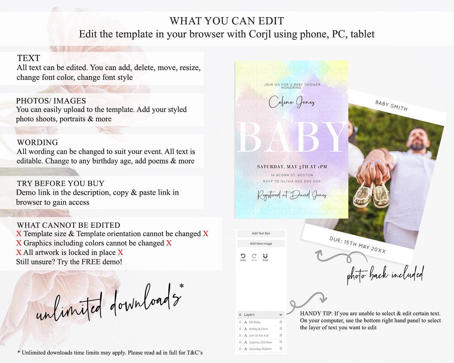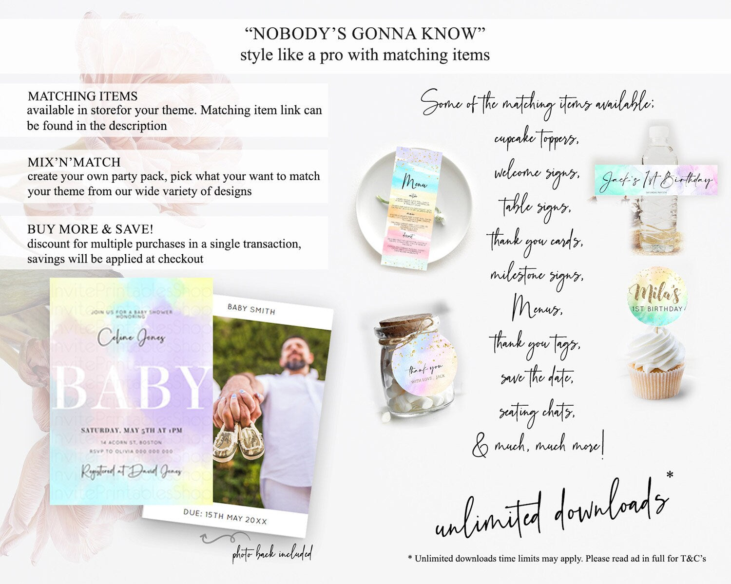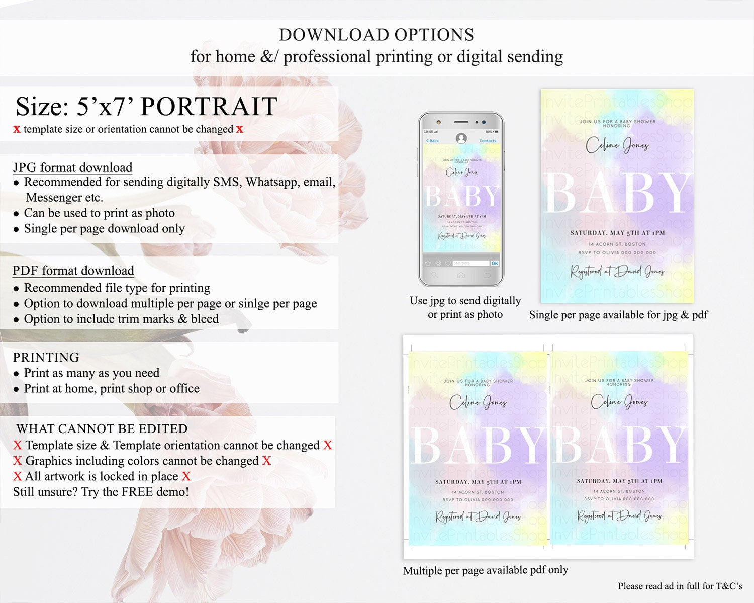 Pastel Baby Shower Invitation Rainbow Baby Shower Invitation Colorful Pastel Watercolor Invitation Gold Glitter Sprinkles Ombre D10617