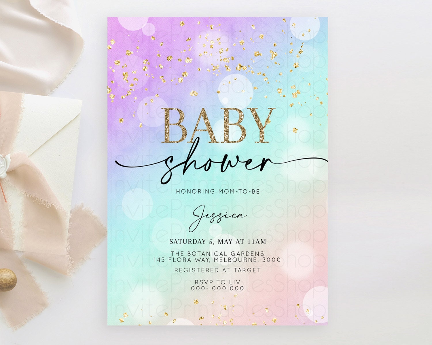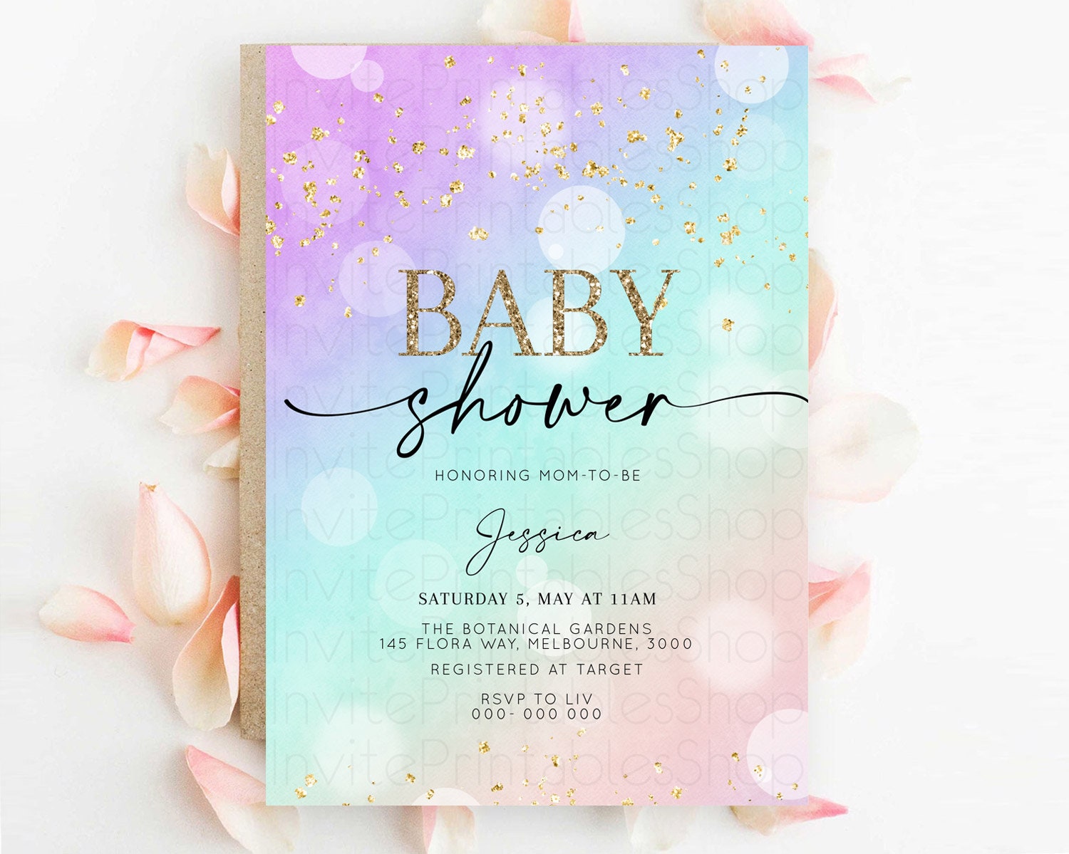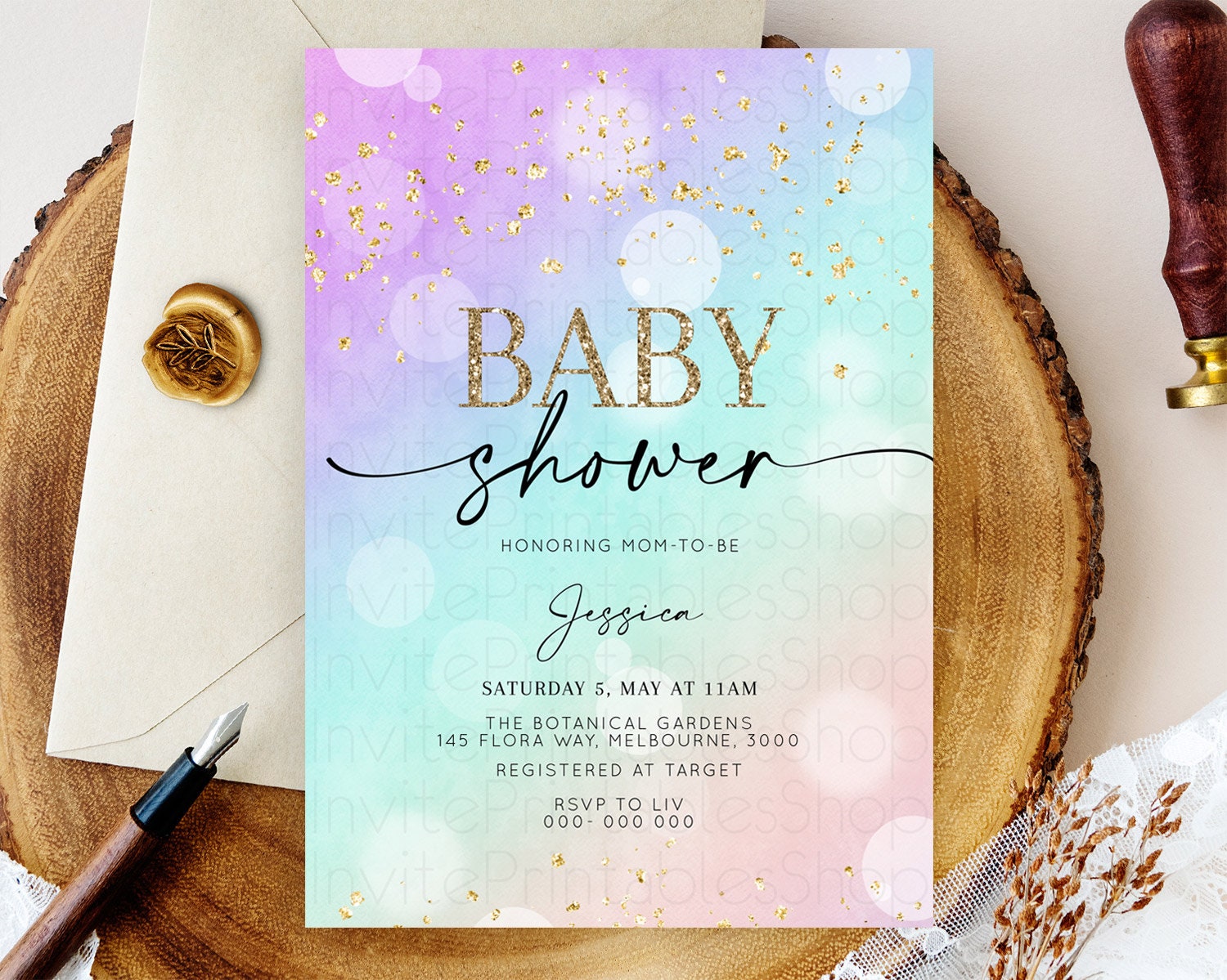 Pastel Baby Shower Invitation Rainbow Baby Shower Invitation Colorful Pastel Watercolor Invitation Gold Glitter Sprinkles Ombre D10618