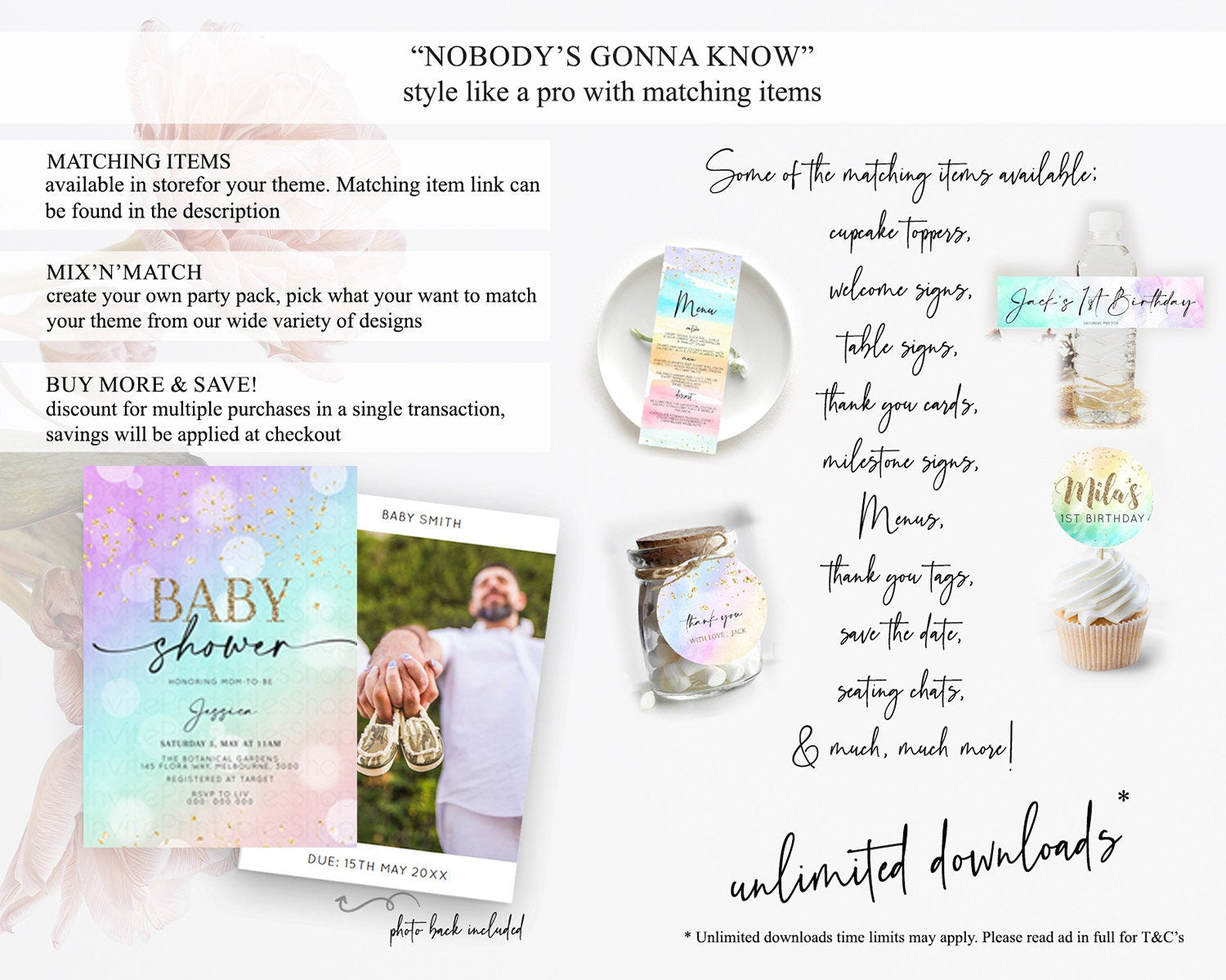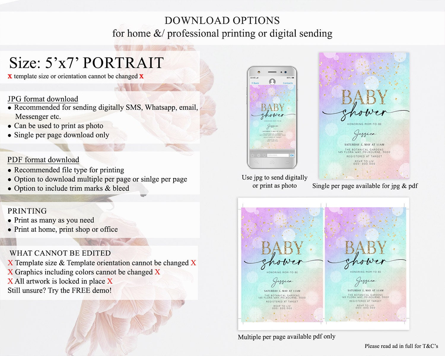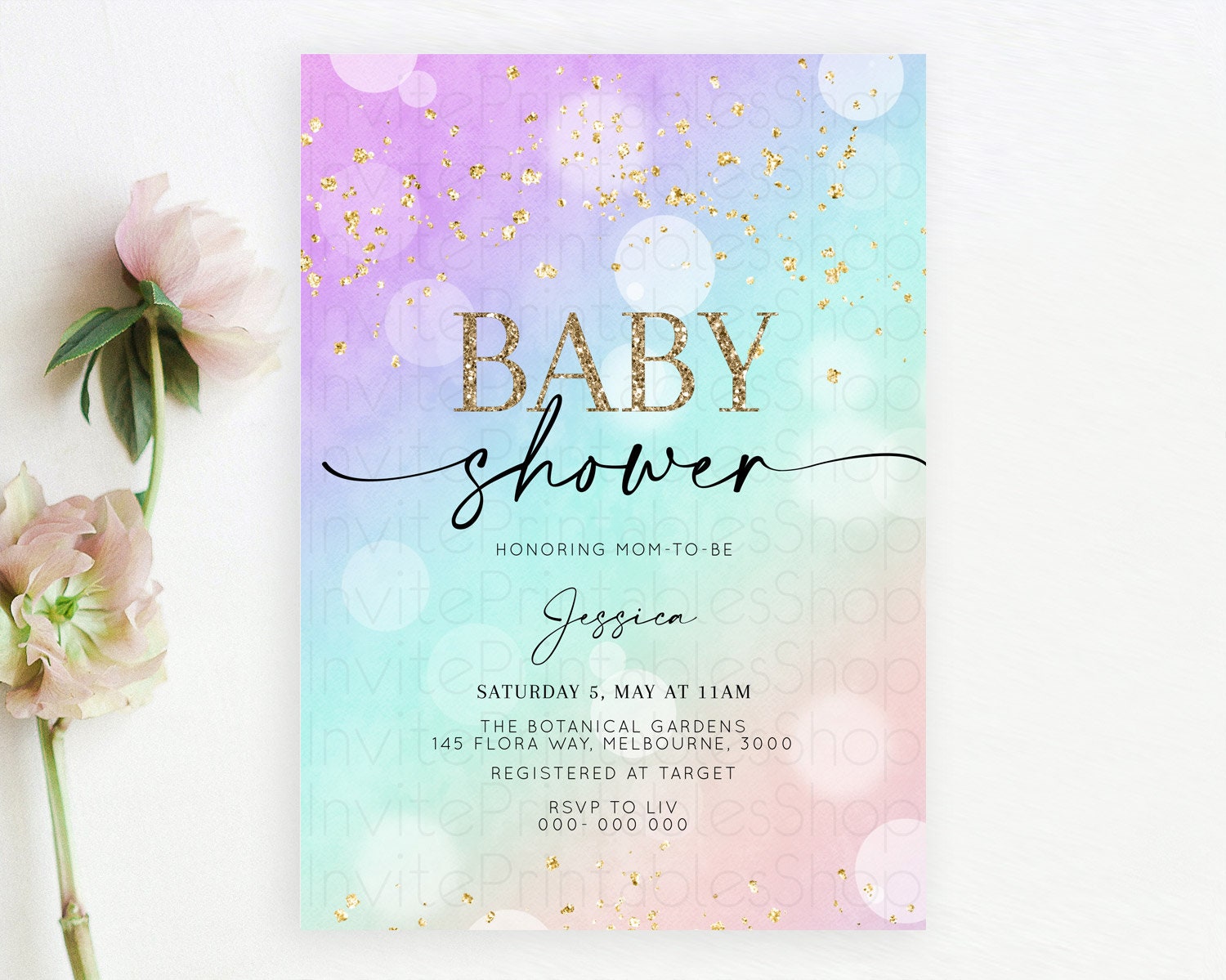 Pastel Baby Shower Invitation Rainbow Baby Shower Invitation Colorful Pastel Watercolor Invitation Gold Glitter Sprinkles Ombre D10618