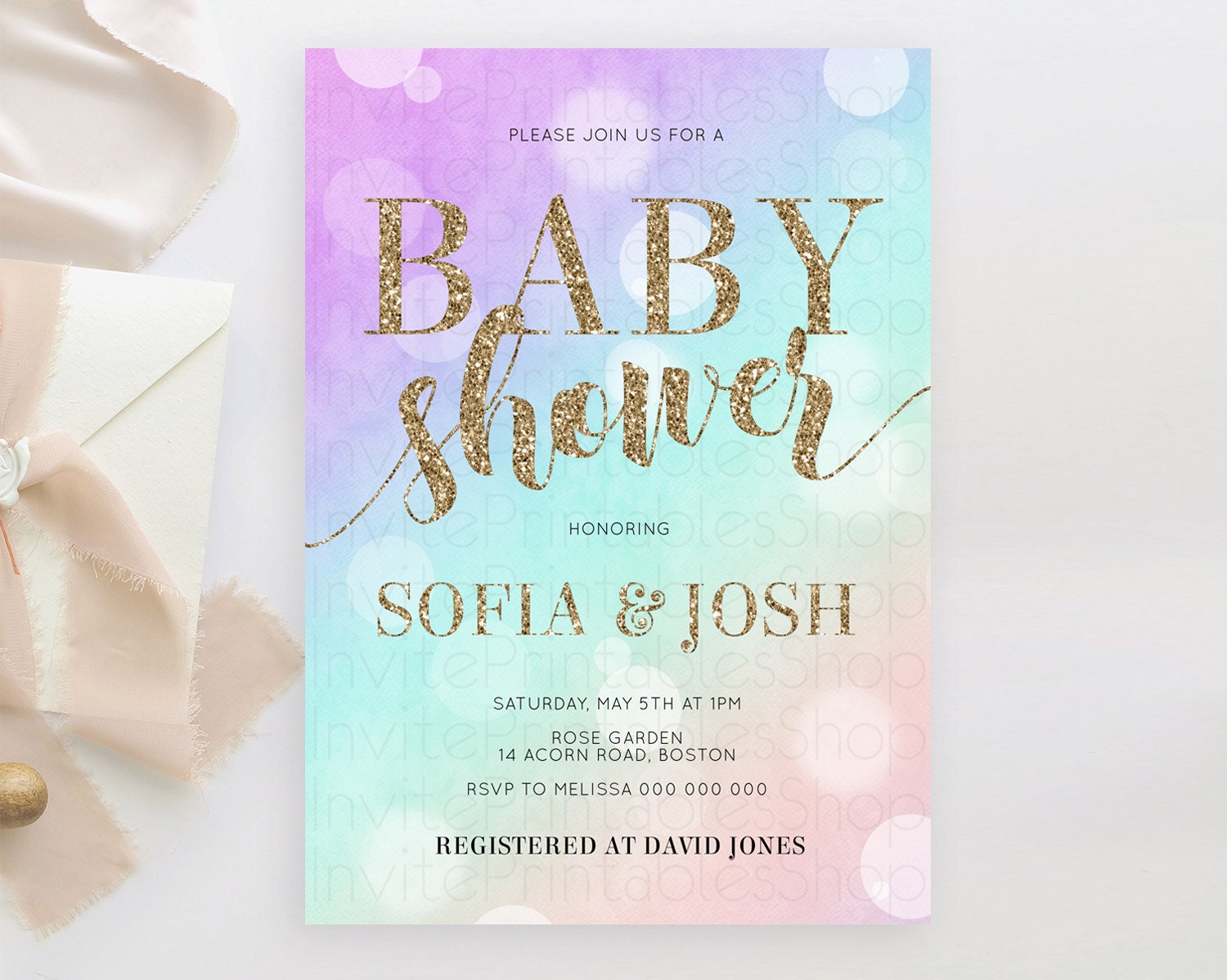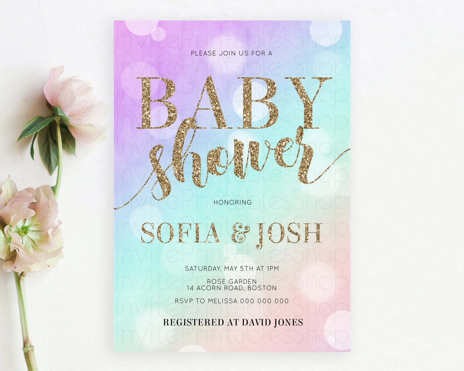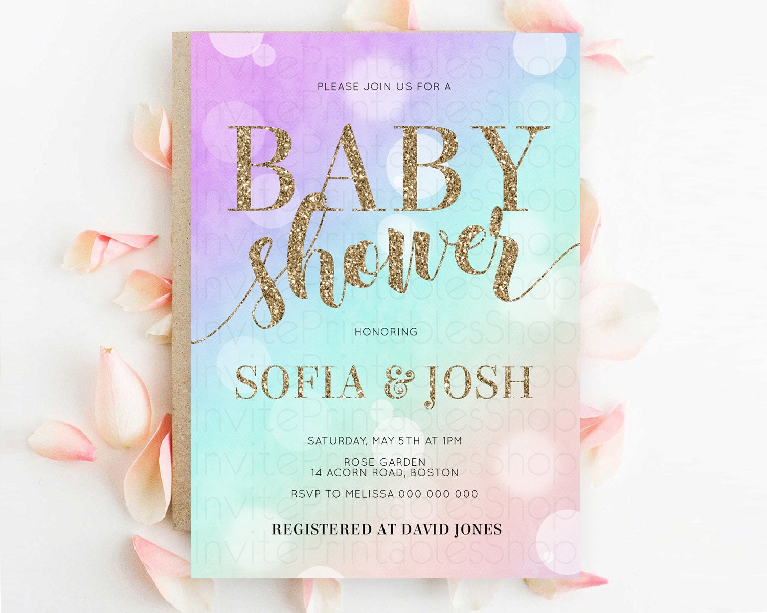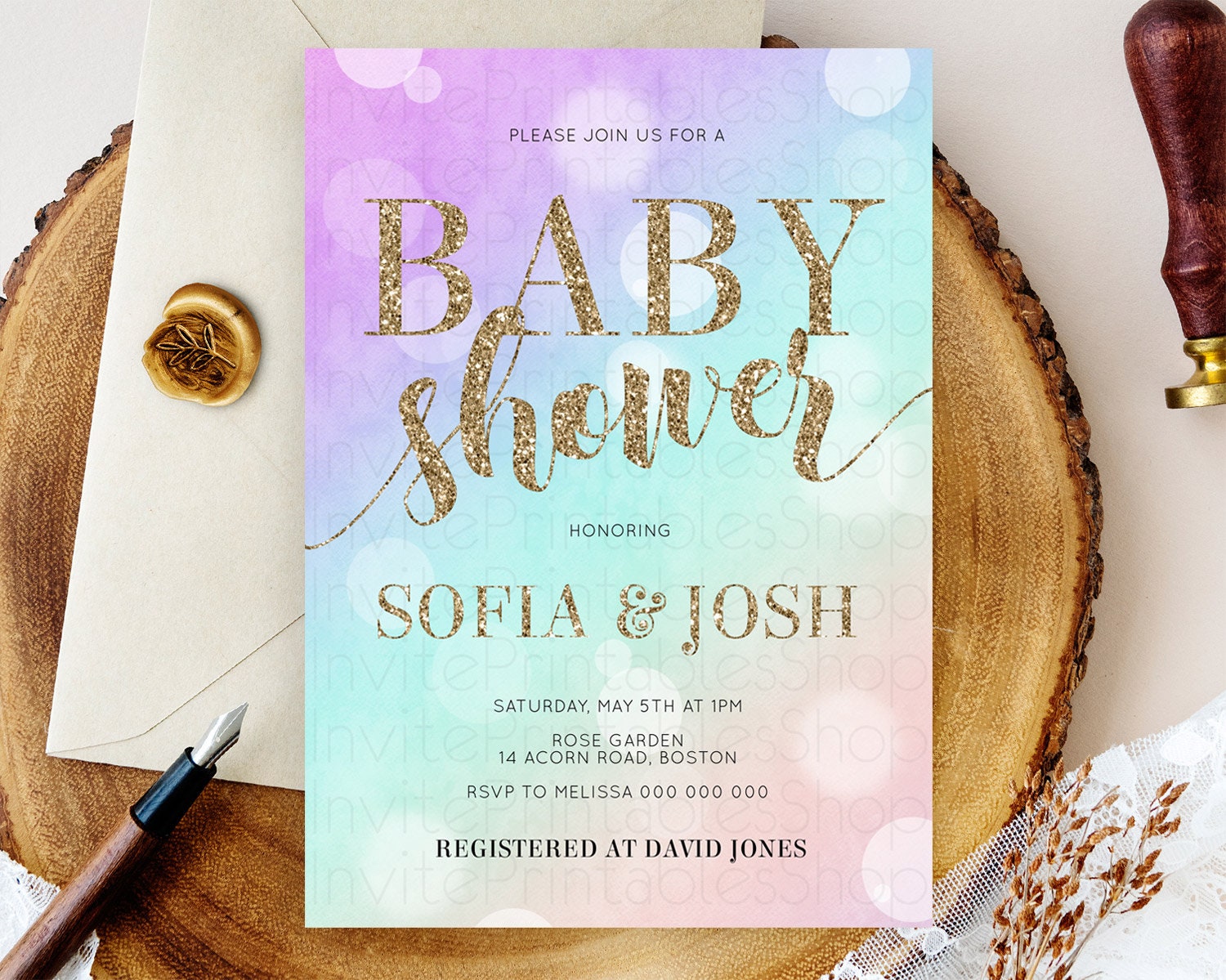 Pastel Baby Shower Invitation Rainbow Baby Shower Invitation Colorful Pastel Watercolor Invitation Gold Glitter Sprinkles Ombre D10621