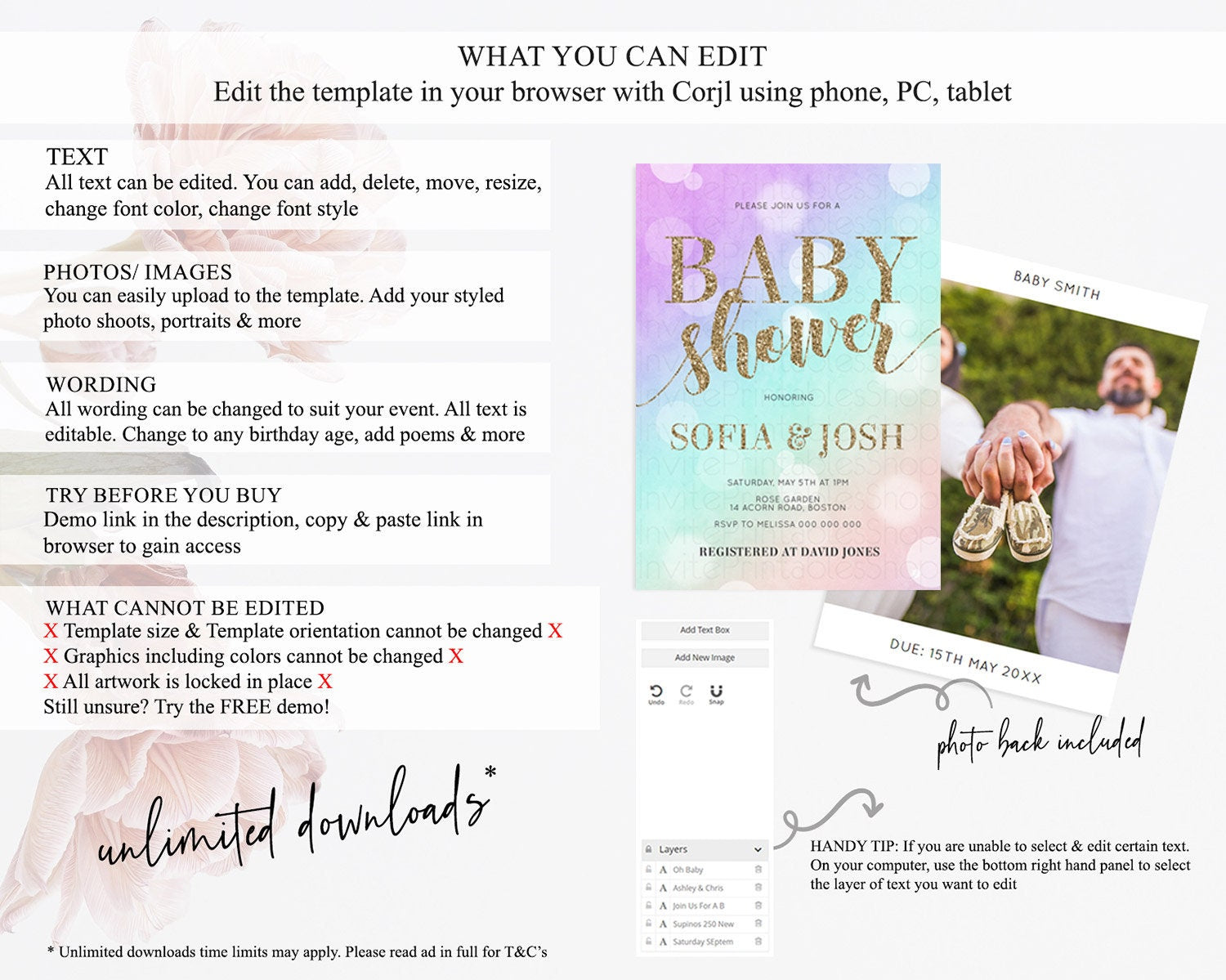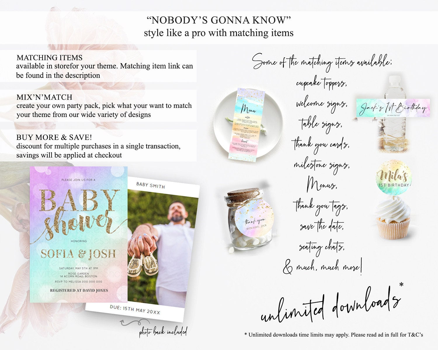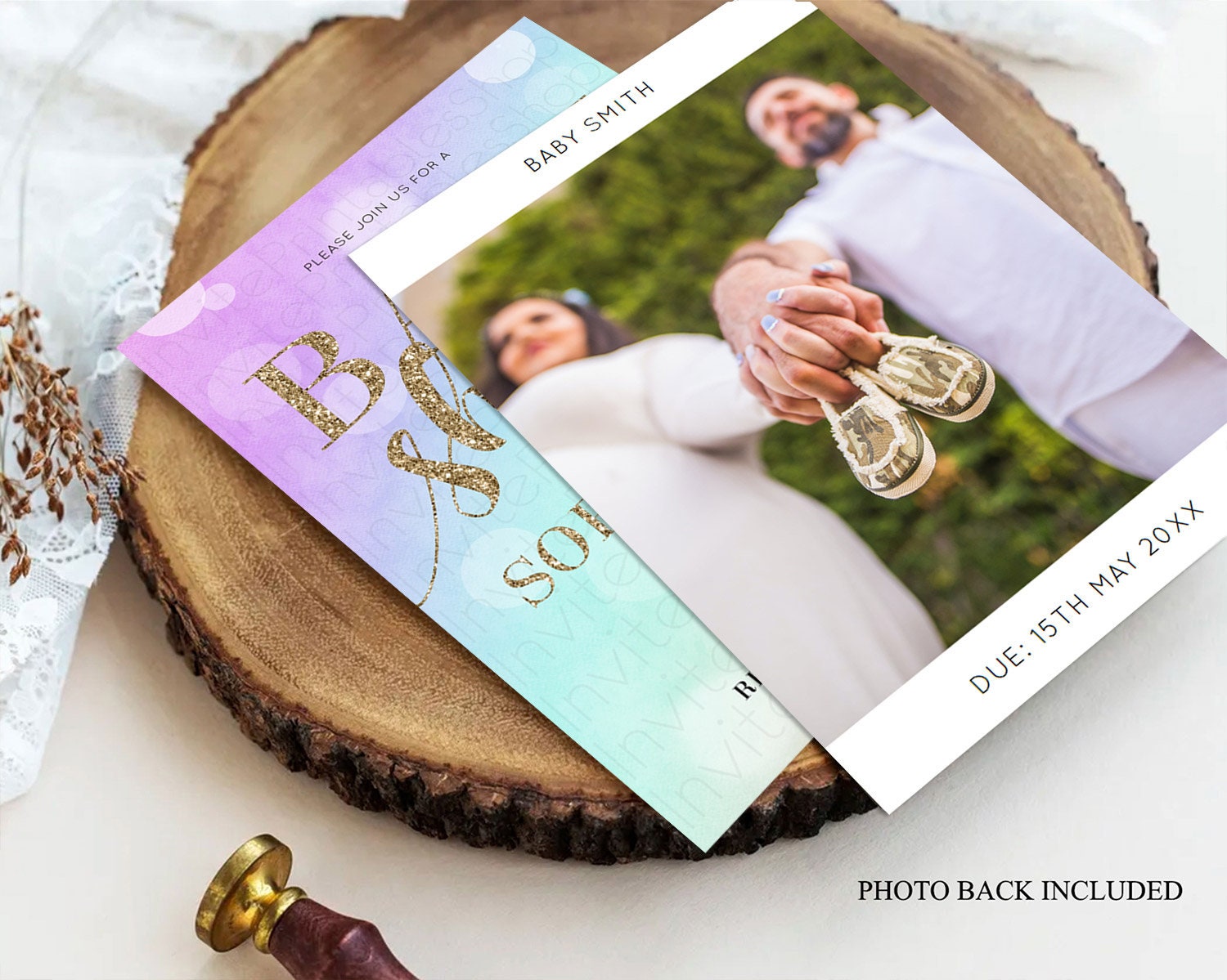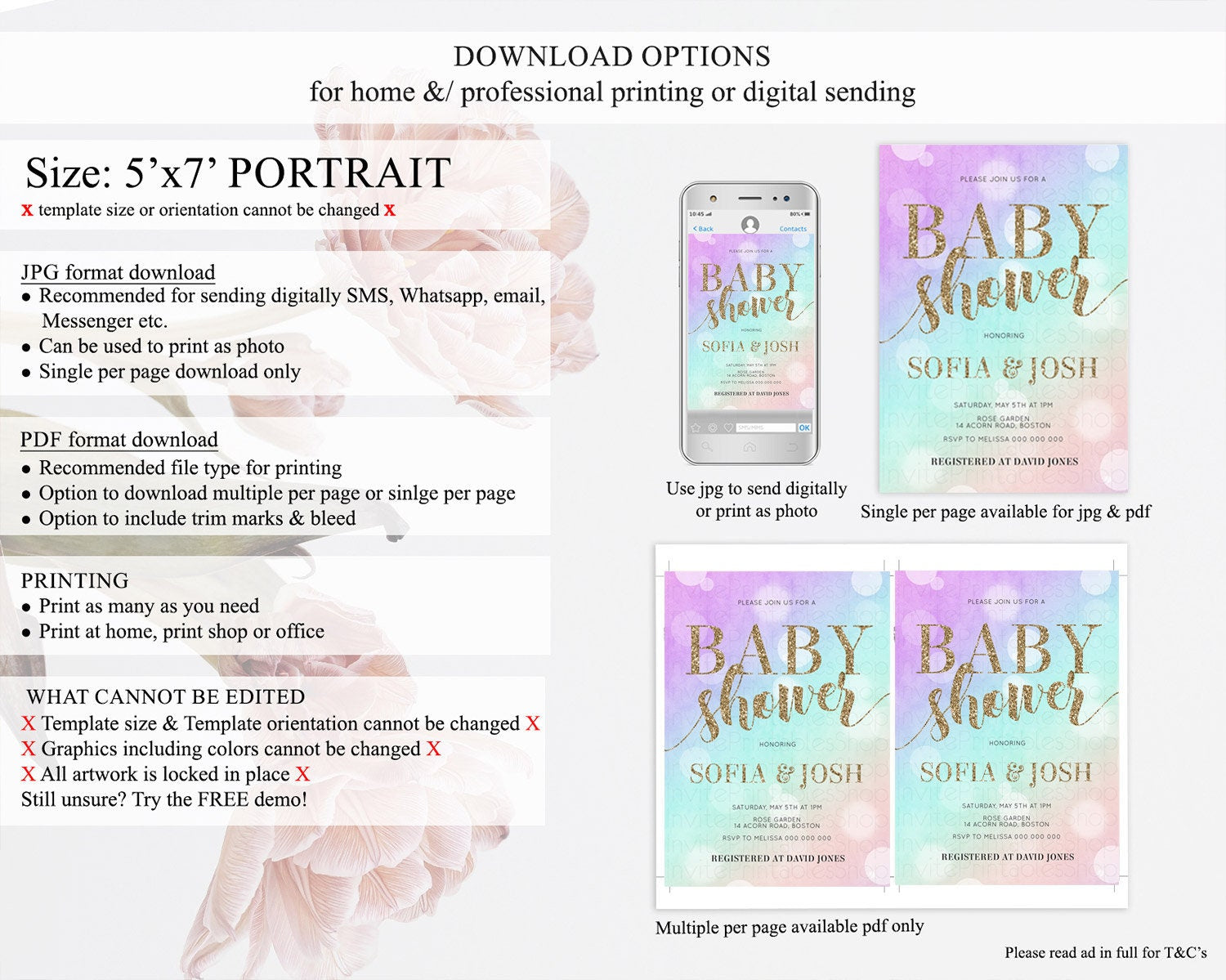 Pastel Baby Shower Invitation Rainbow Baby Shower Invitation Colorful Pastel Watercolor Invitation Gold Glitter Sprinkles Ombre D10621
