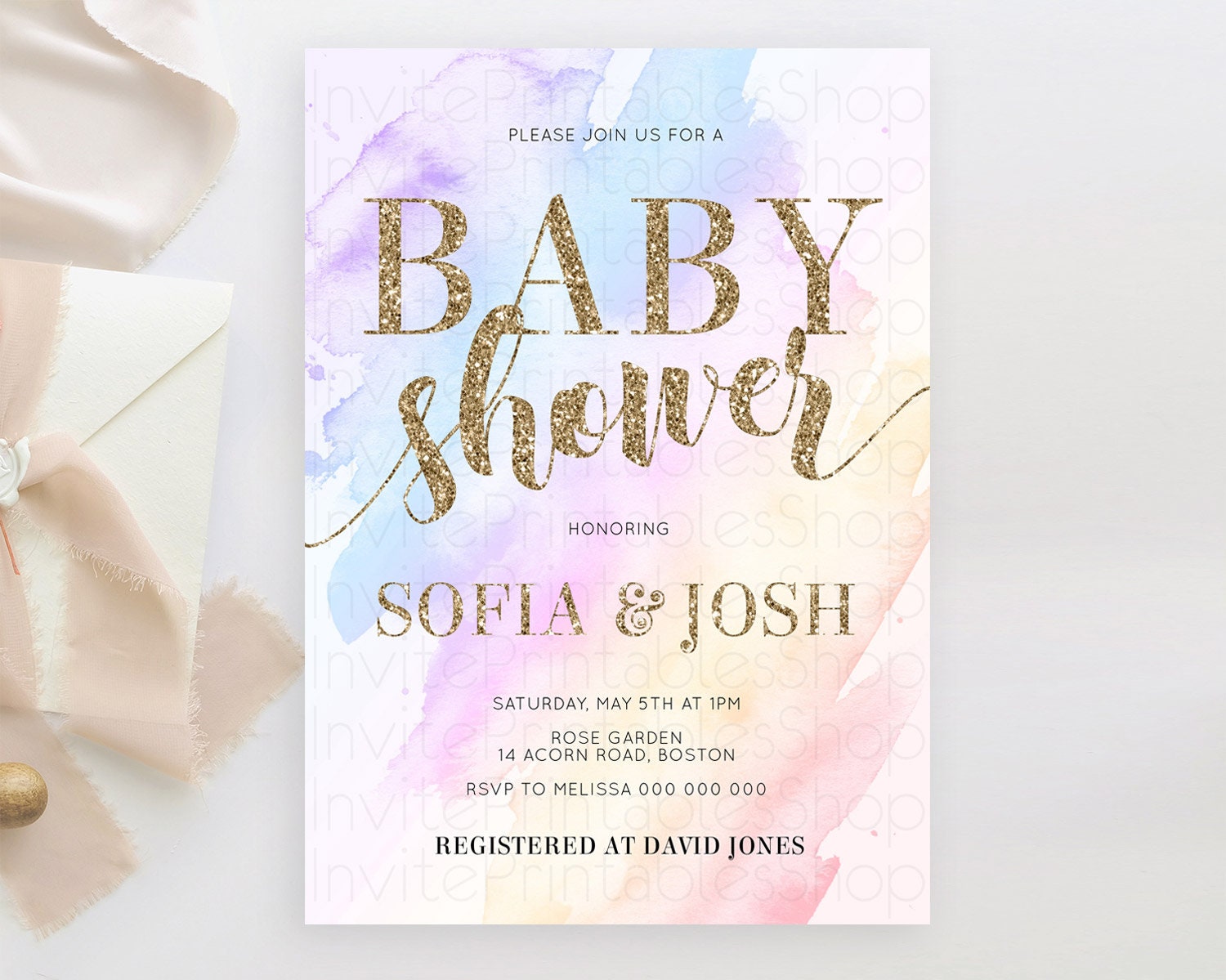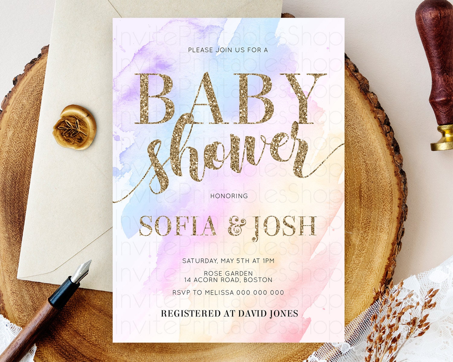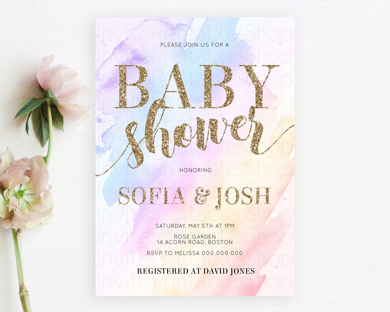 Pastel Baby Shower Invitation Rainbow Baby Shower Invitation Colorful Pastel Watercolor Invitation Gold Glitter Sprinkles Ombre D10633