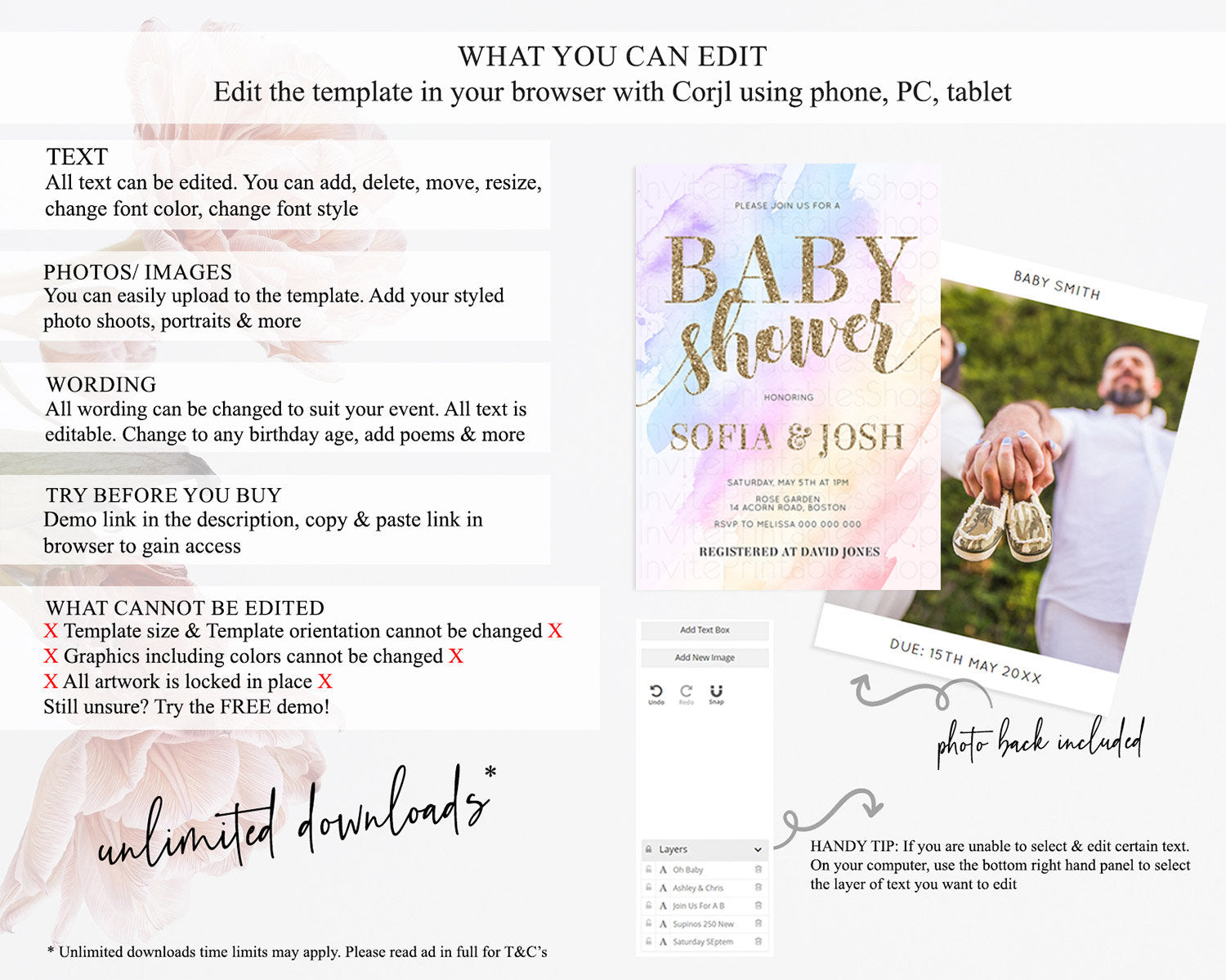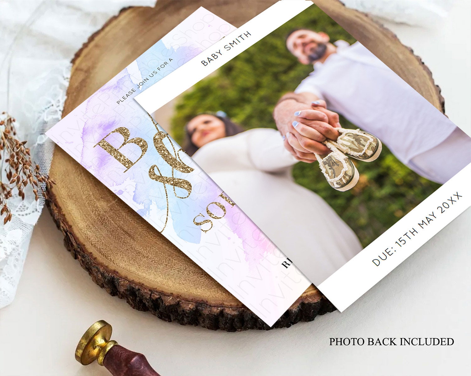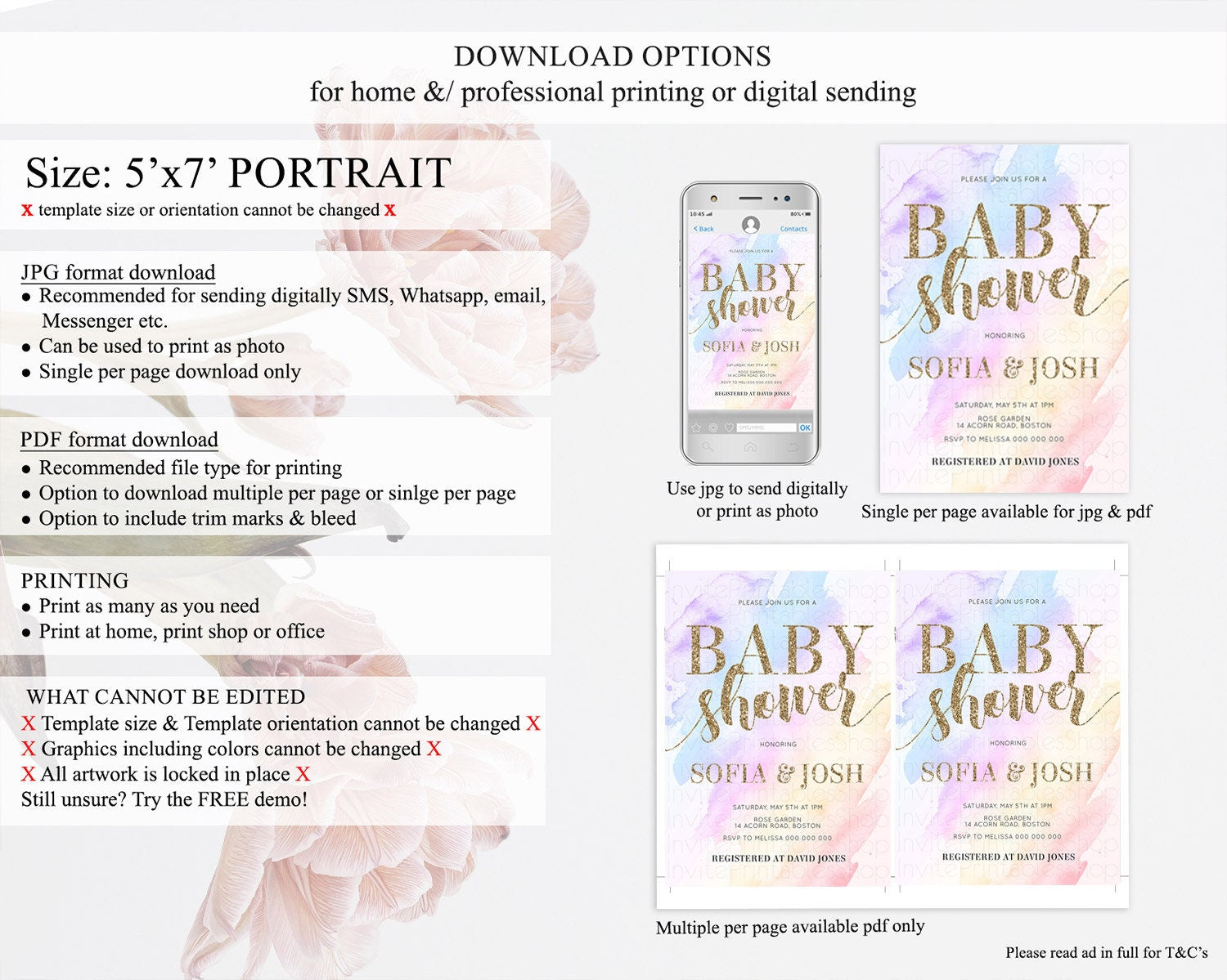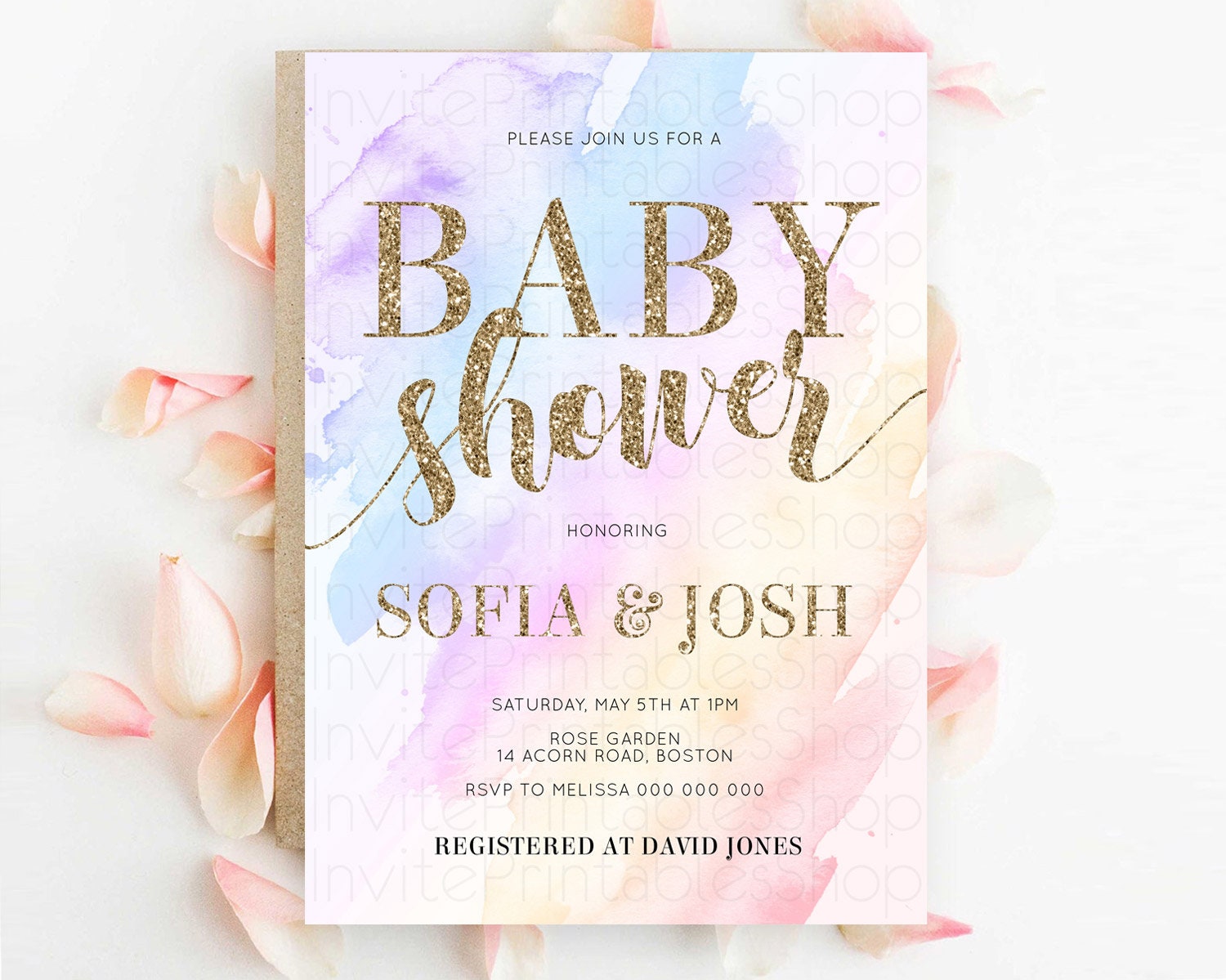 Pastel Baby Shower Invitation Rainbow Baby Shower Invitation Colorful Pastel Watercolor Invitation Gold Glitter Sprinkles Ombre D10633