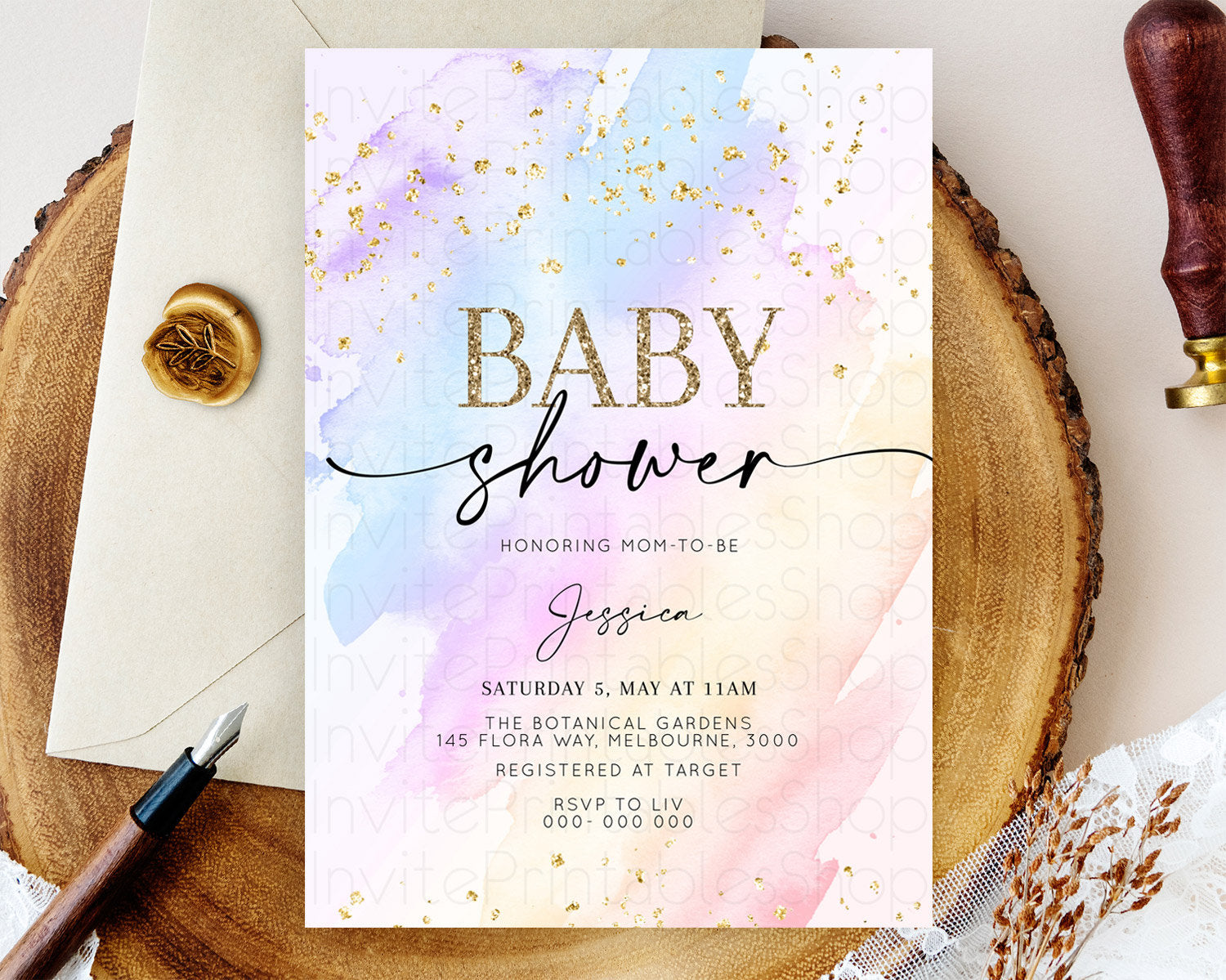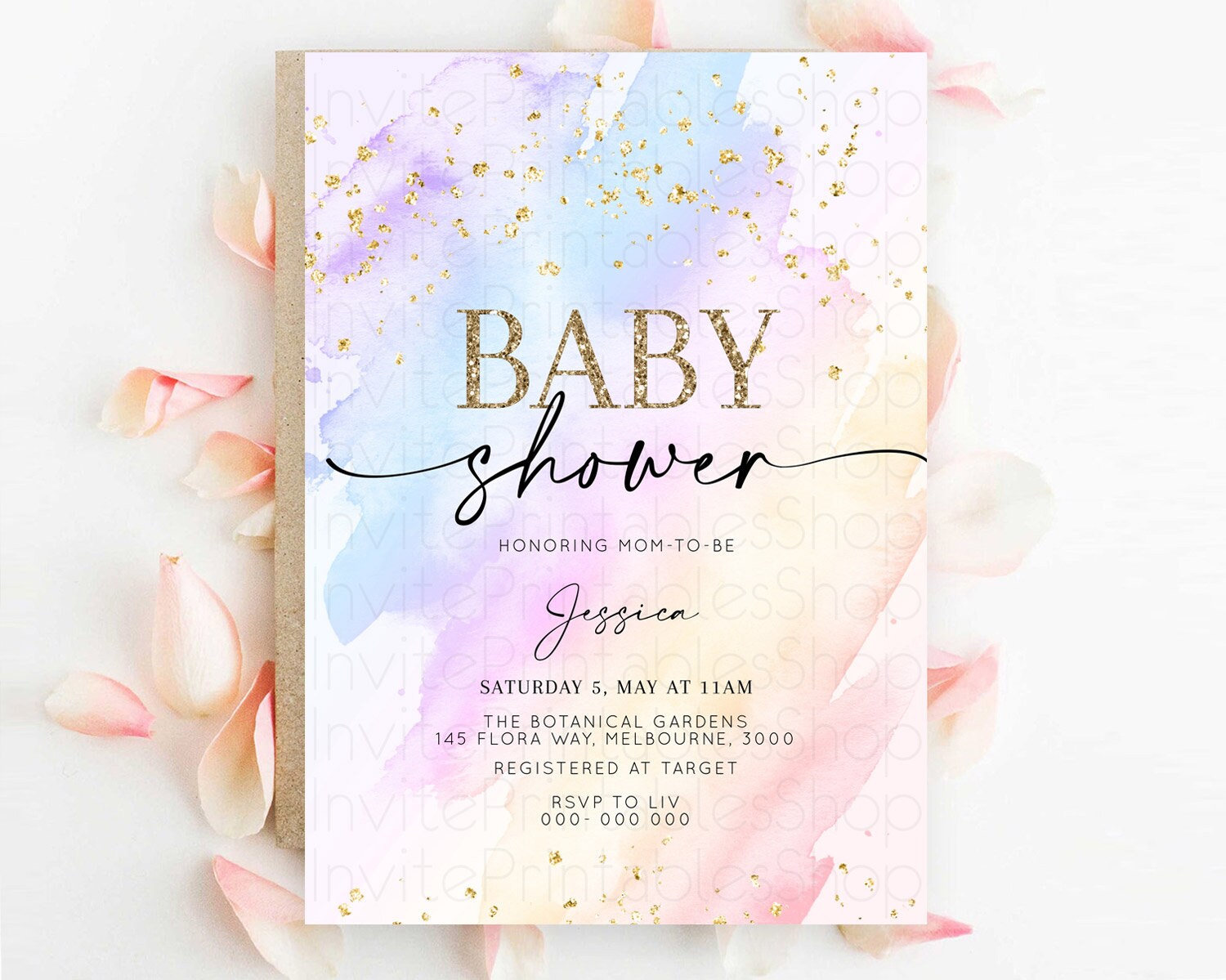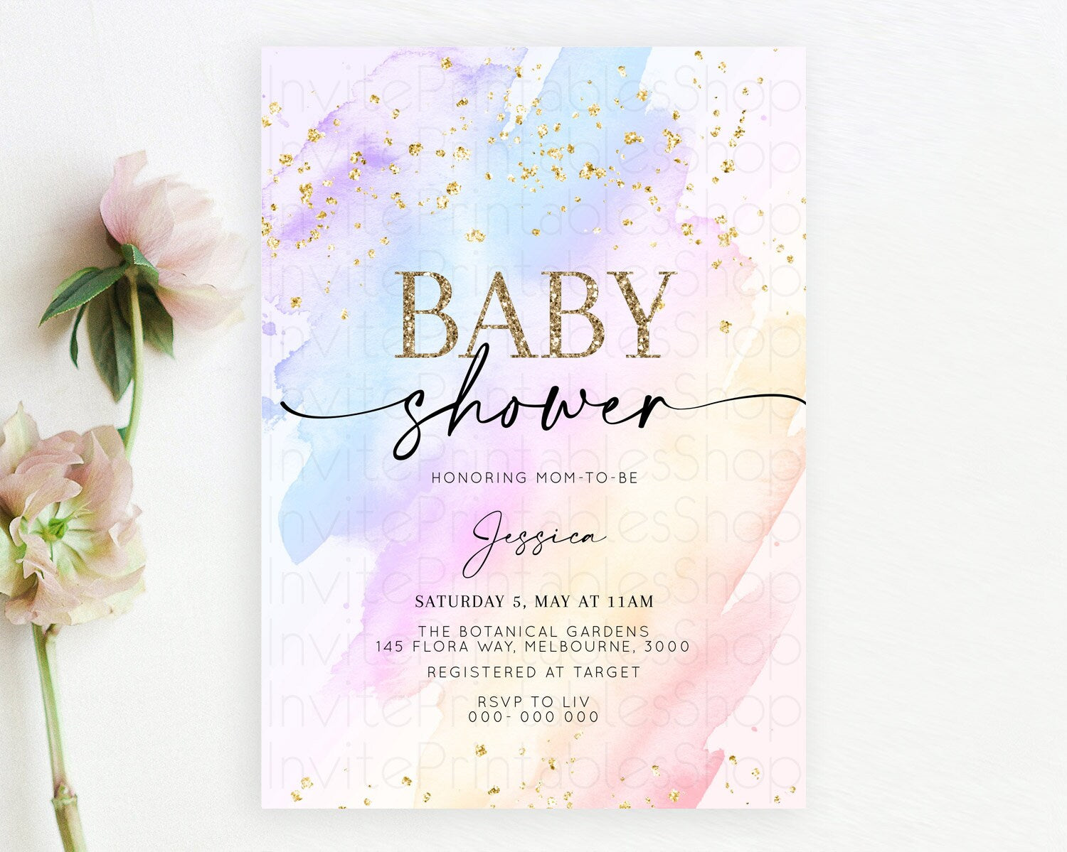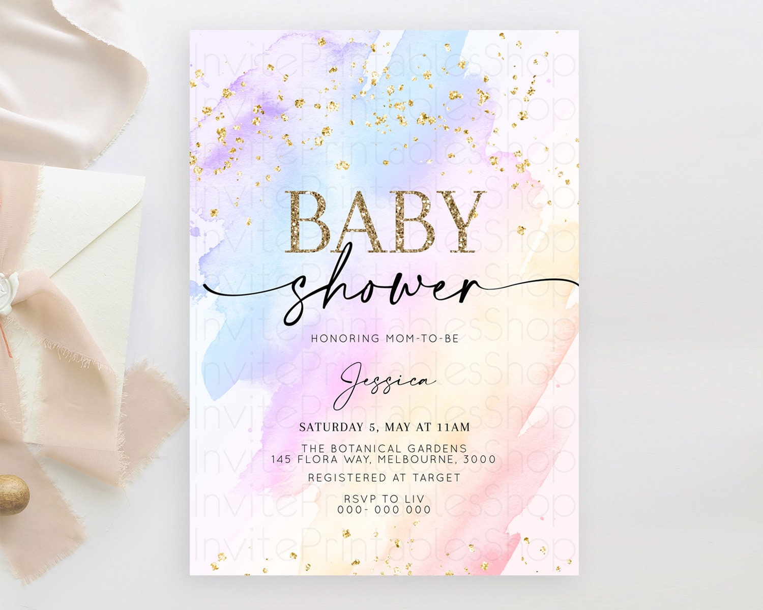 Pastel Baby Shower Invitation Rainbow Baby Shower Invitation Colorful Pastel Watercolor Invitation Gold Glitter Sprinkles Ombre D10635
