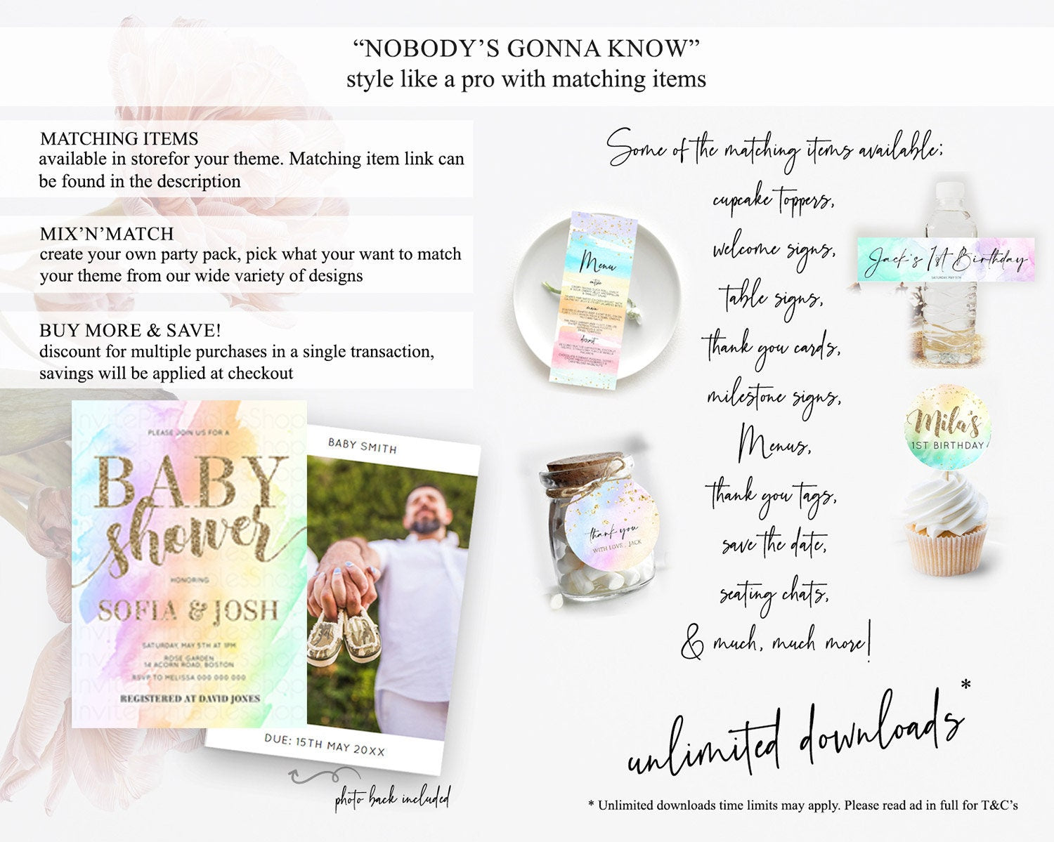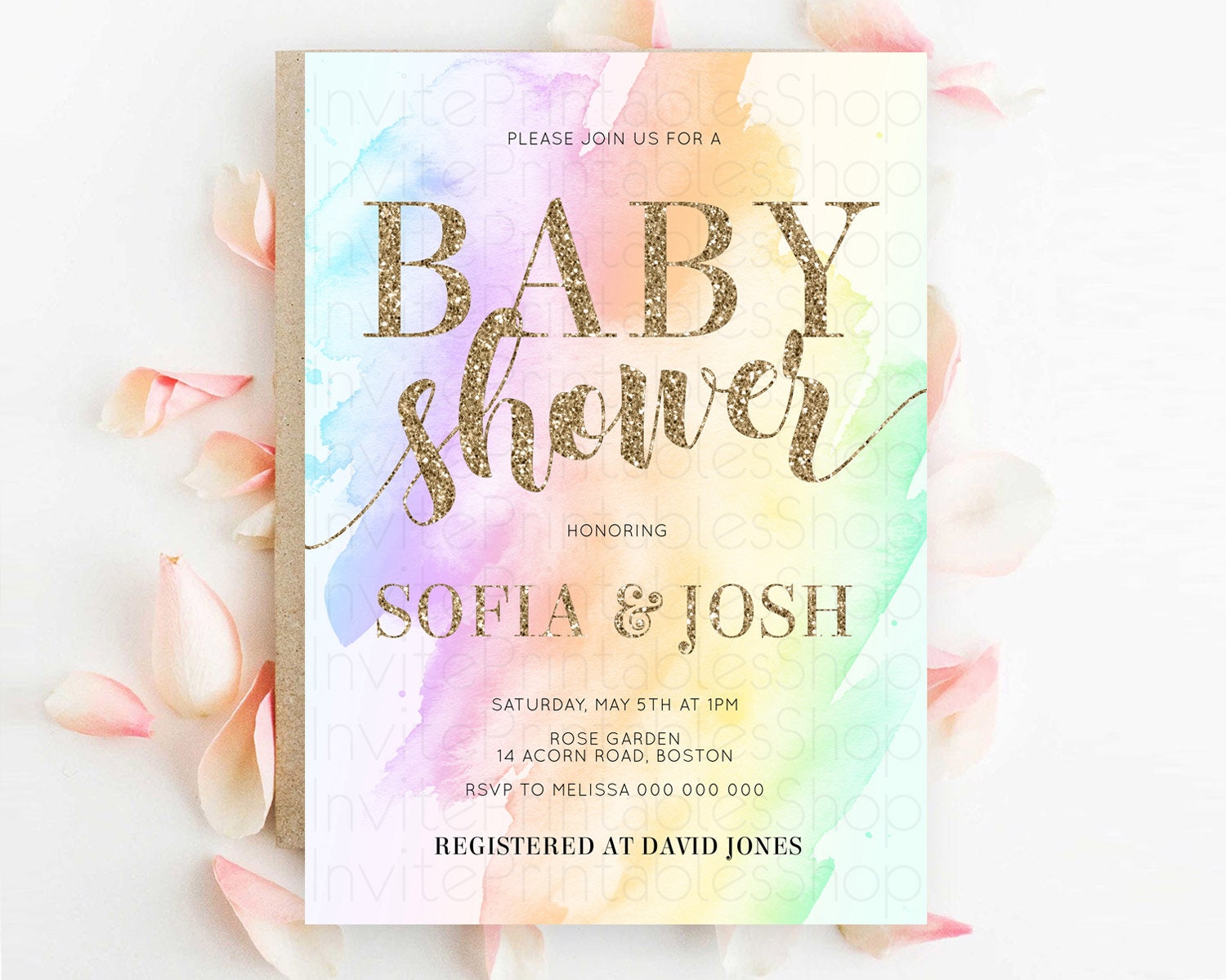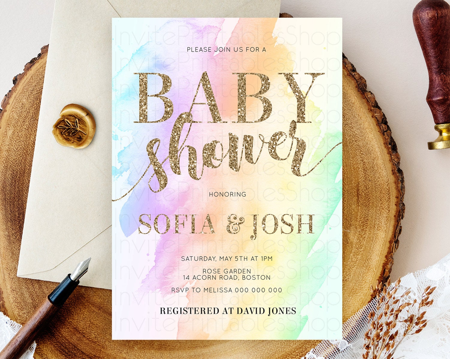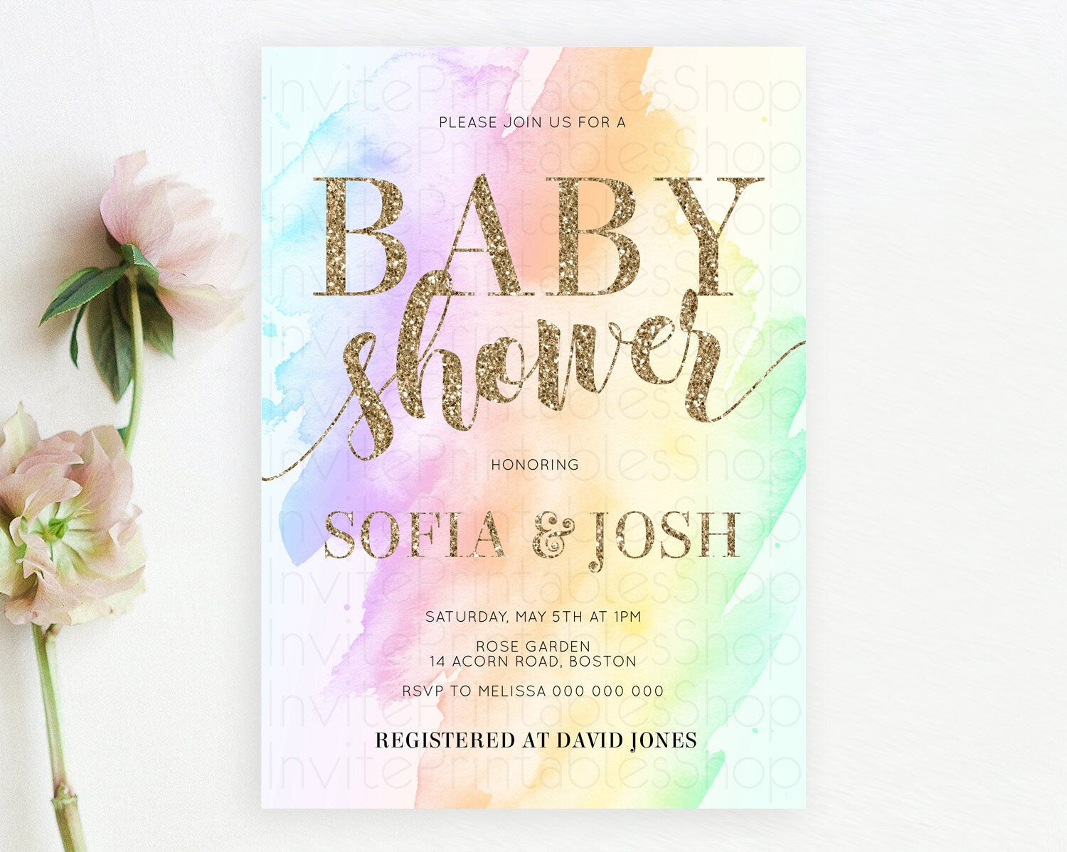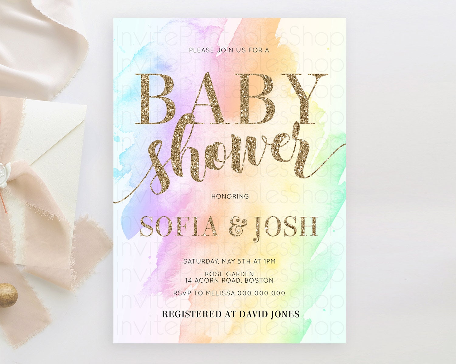 Pastel Baby Shower Invitation Rainbow Baby Shower Invitation Colorful Pastel Watercolor Invitation Gold Glitter Sprinkles Ombre D10643