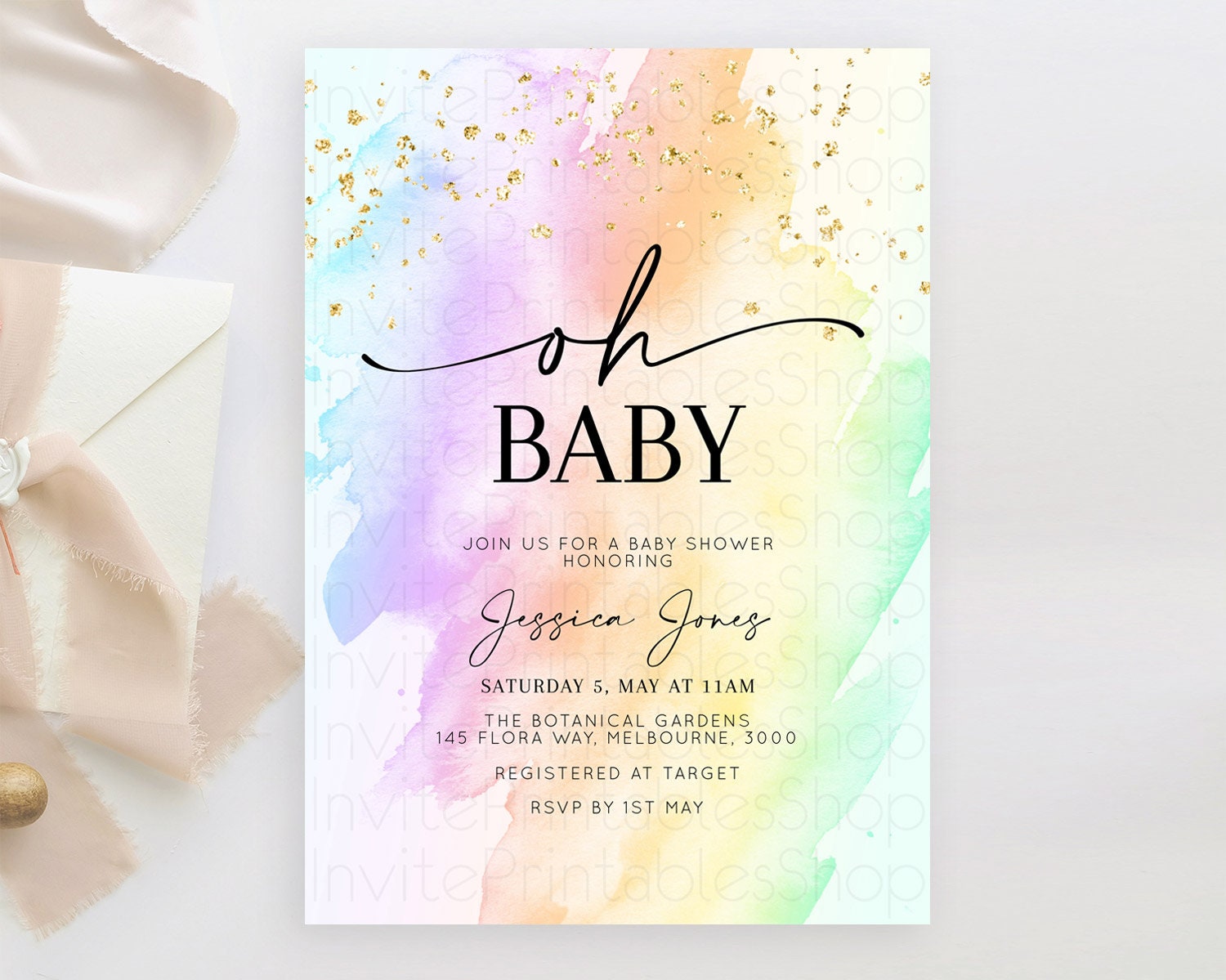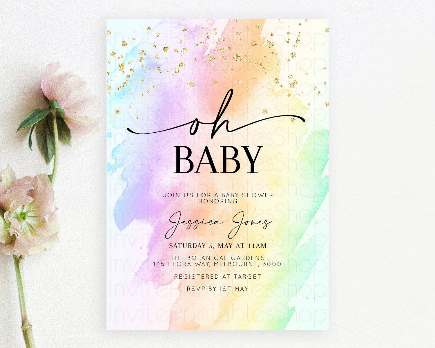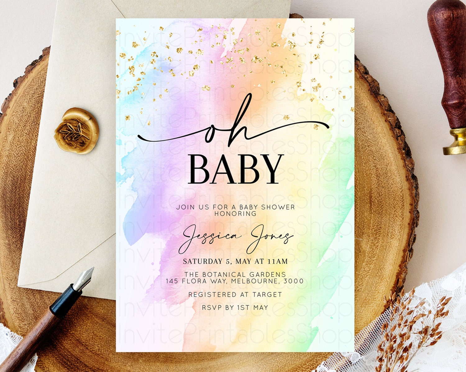 Pastel Baby Shower Invitation Rainbow Baby Shower Invitation Colorful Pastel Watercolor Invitation Gold Glitter Sprinkles Ombre D10645