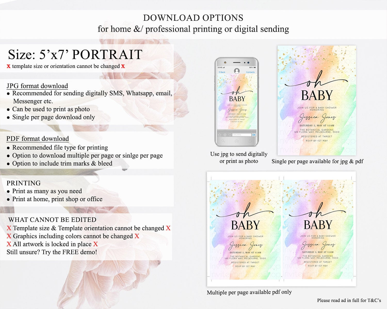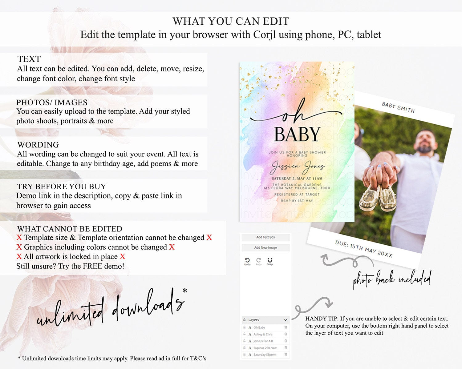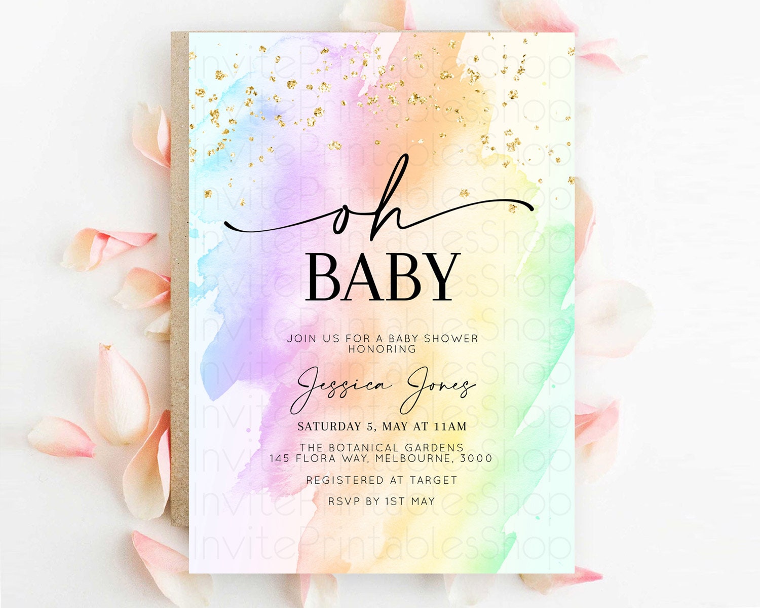 Pastel Baby Shower Invitation Rainbow Baby Shower Invitation Colorful Pastel Watercolor Invitation Gold Glitter Sprinkles Ombre D10645