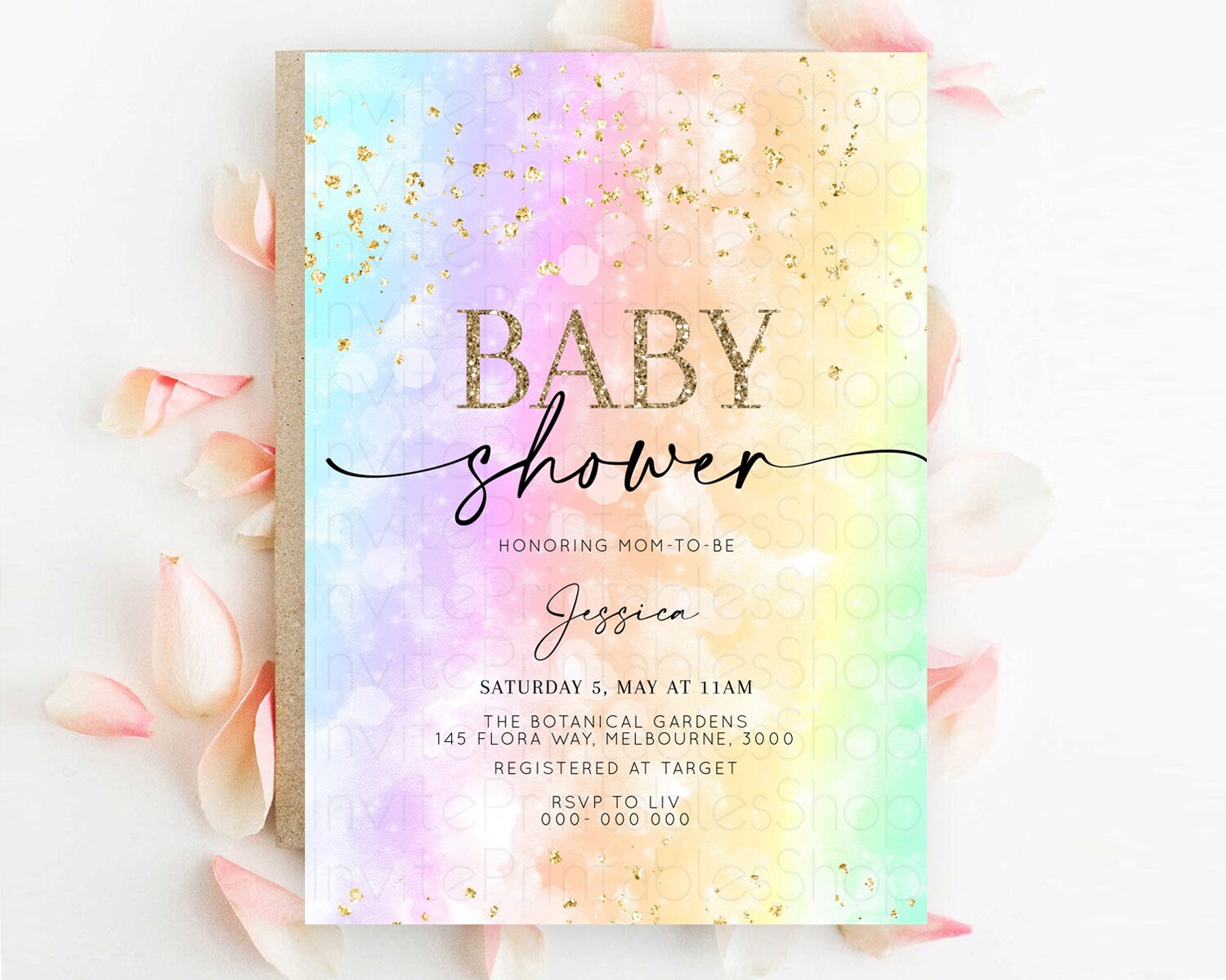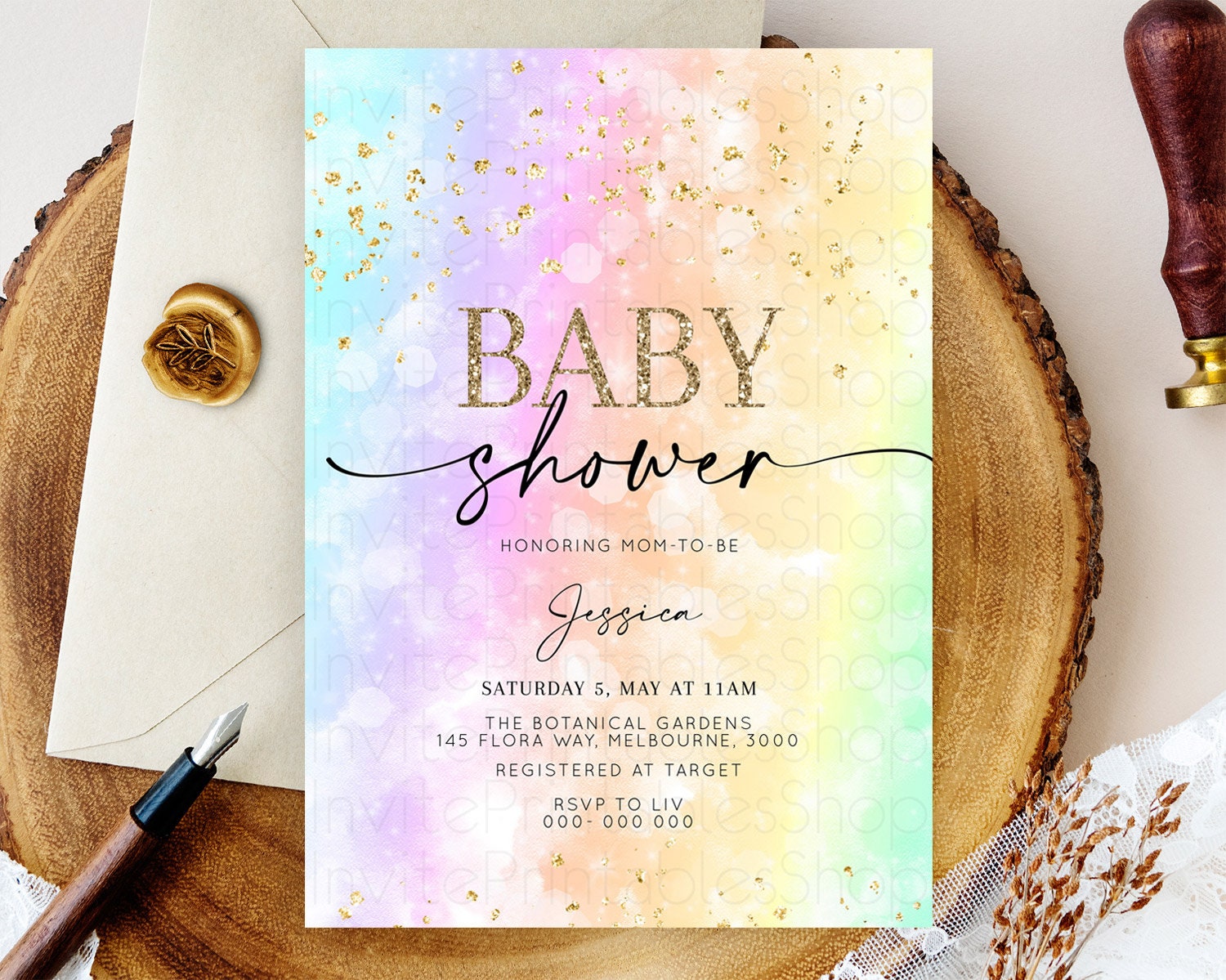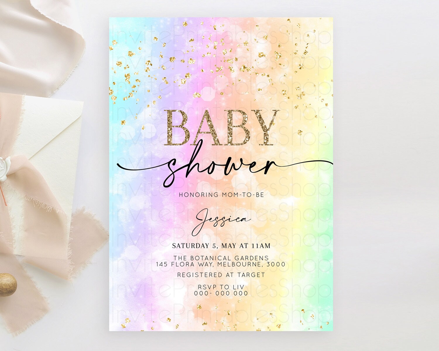 Pastel Baby Shower Invitation Rainbow Baby Shower Invitation Colorful Pastel Watercolor Invitation Gold Glitter Sprinkles Ombre D10647