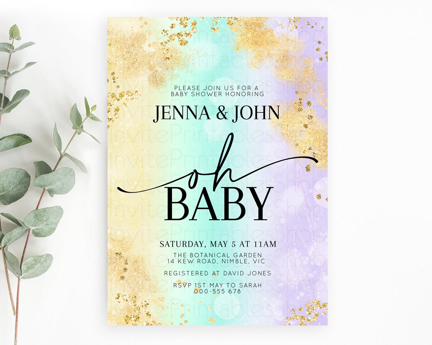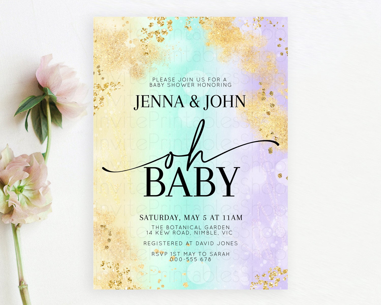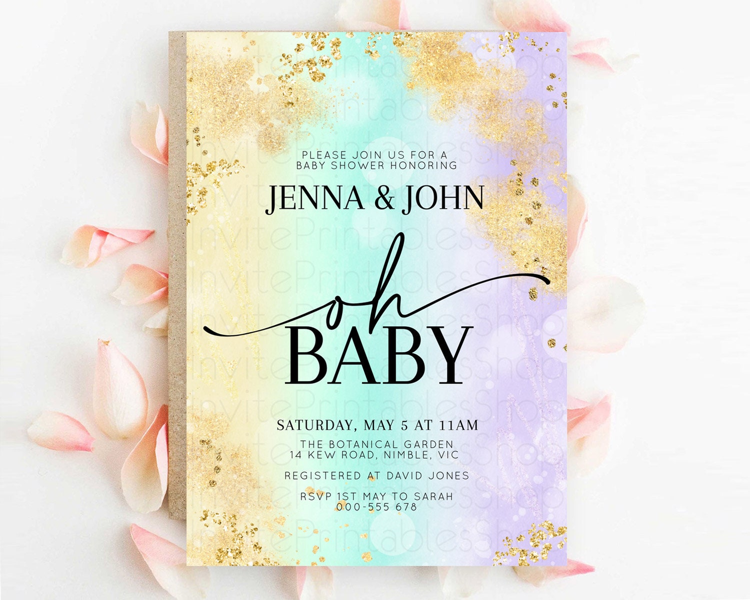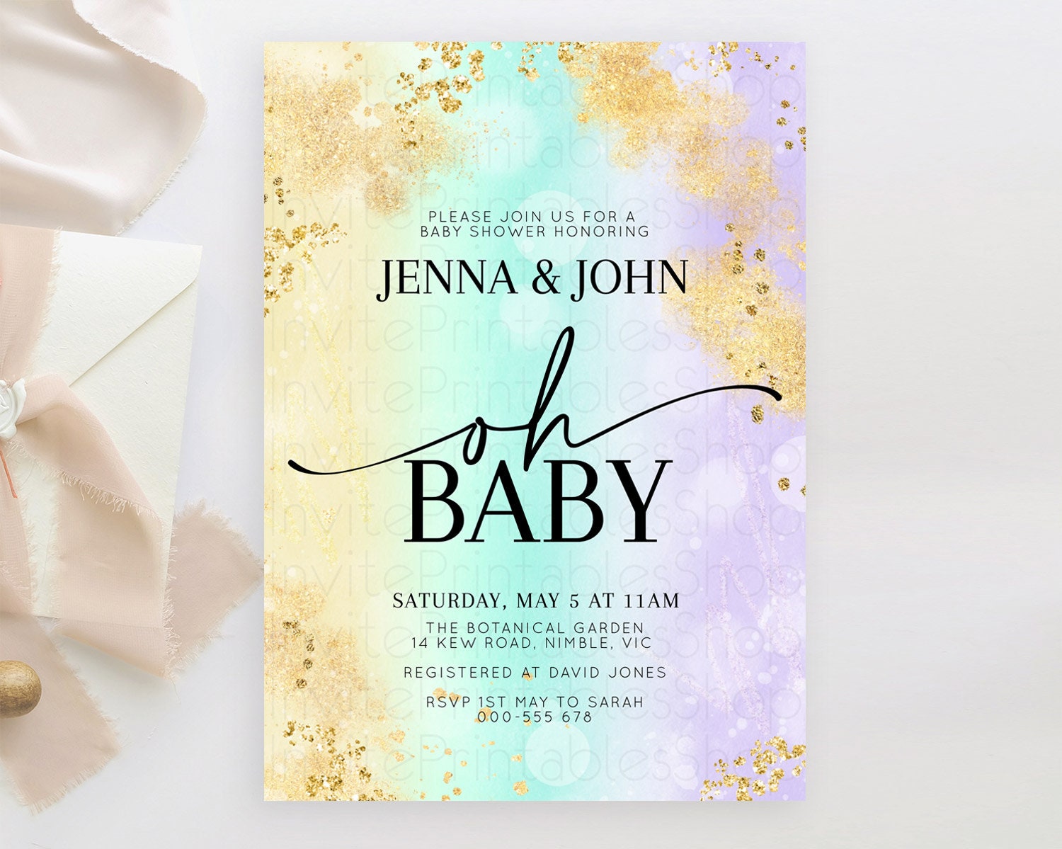 Pastel Baby Shower Invitation Rainbow Baby Shower Invitation Colorful Pastel Watercolor Invitation Gold Glitter Sprinkles Ombre D10672