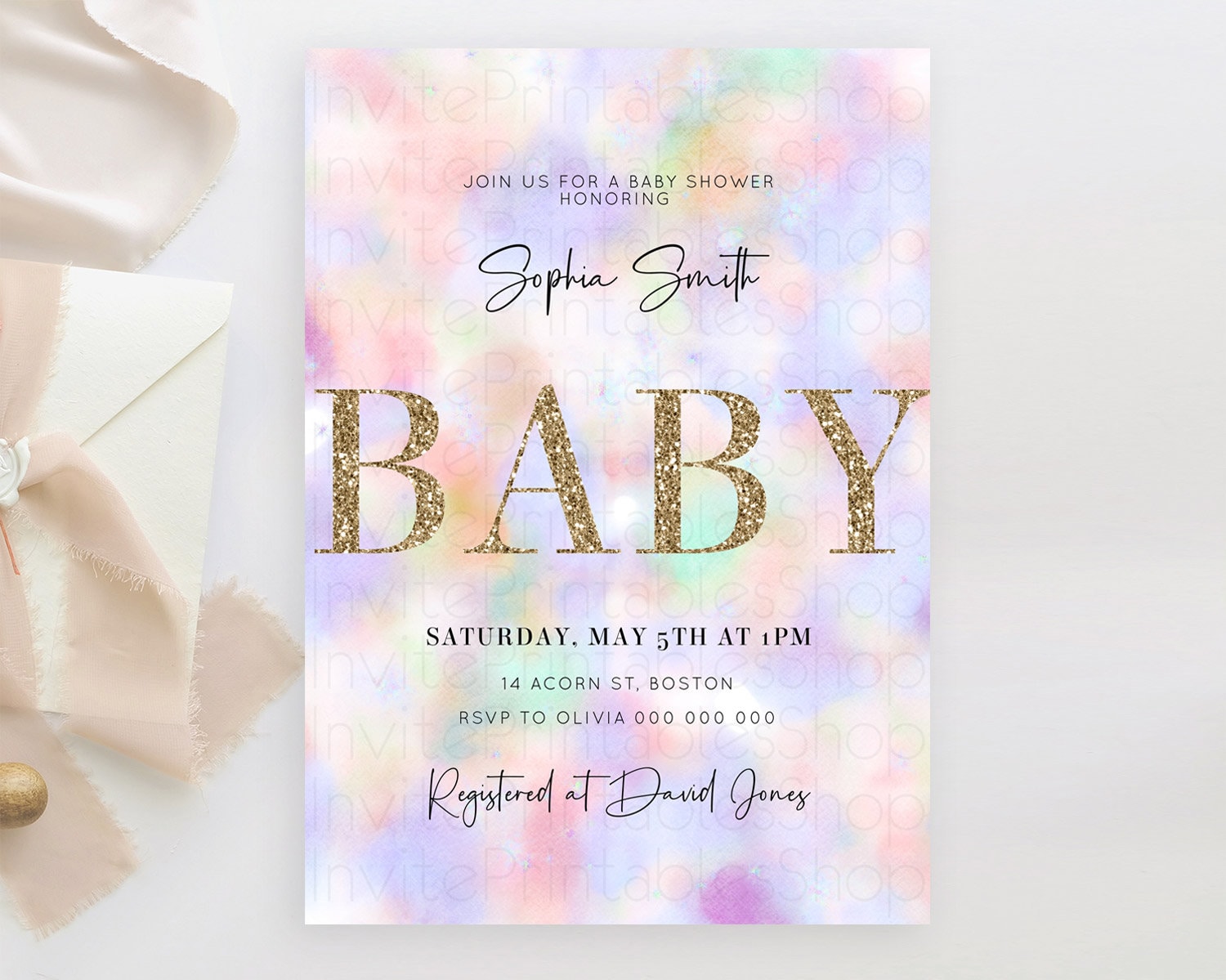 Pastel Baby Shower Invitation Rainbow Baby Shower Invitation Colorful Pastel Watercolor Invitation Gold Glitter Sprinkles Ombre D10697