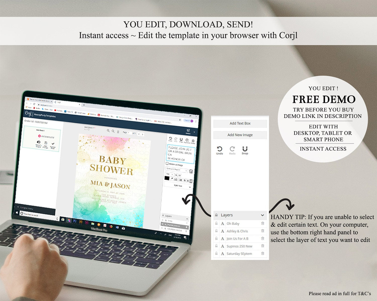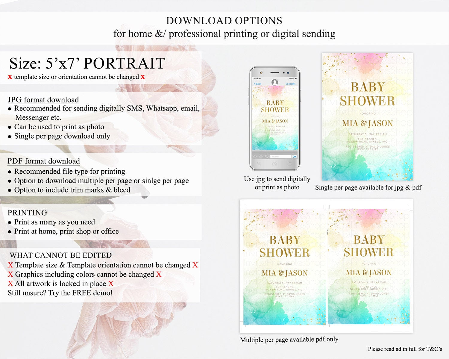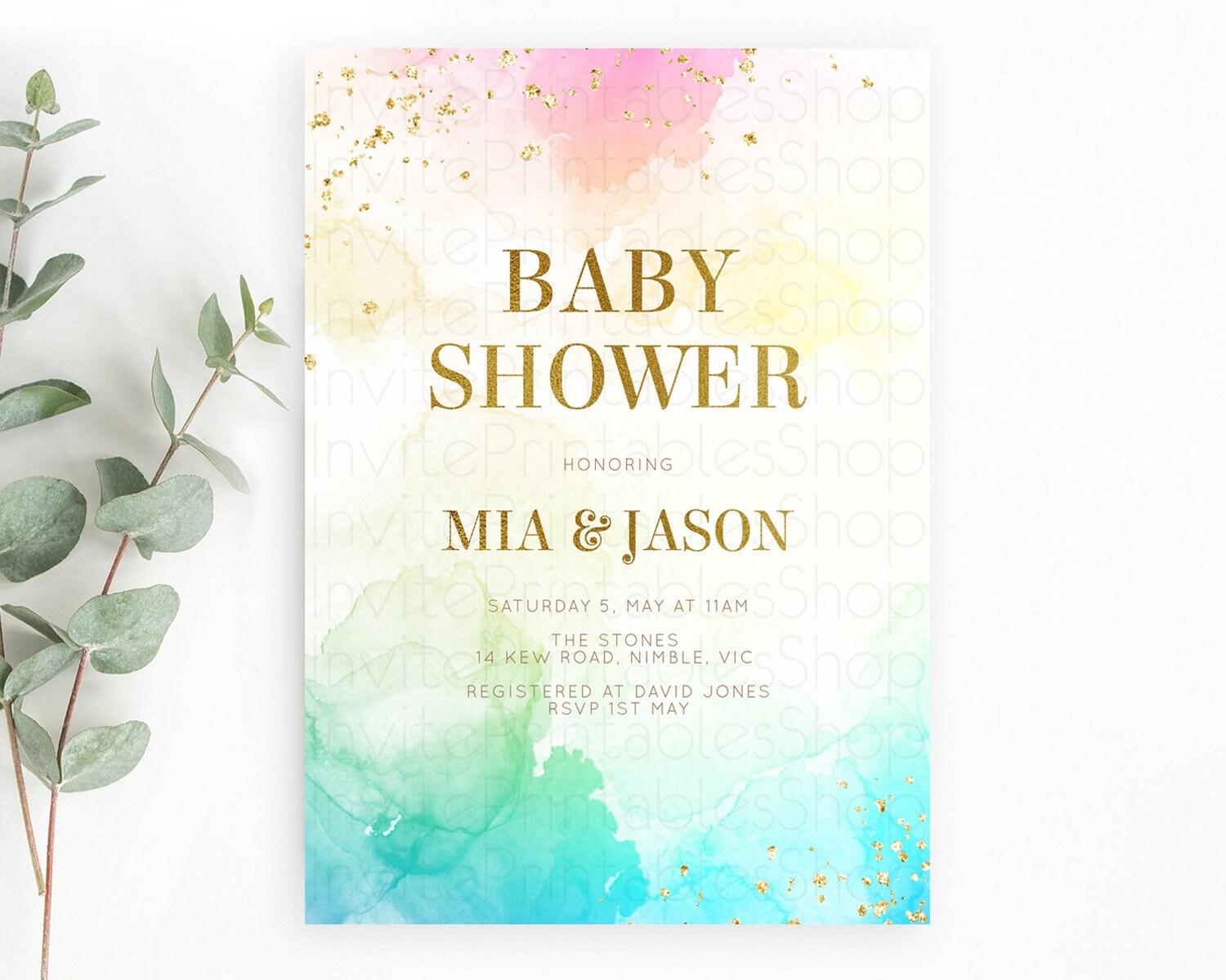 Pastel Baby Shower Invitation Rainbow Baby Shower Invitation Colorful Pastel Watercolor Invitation Gold Glitter Sprinkles Ombre D10770